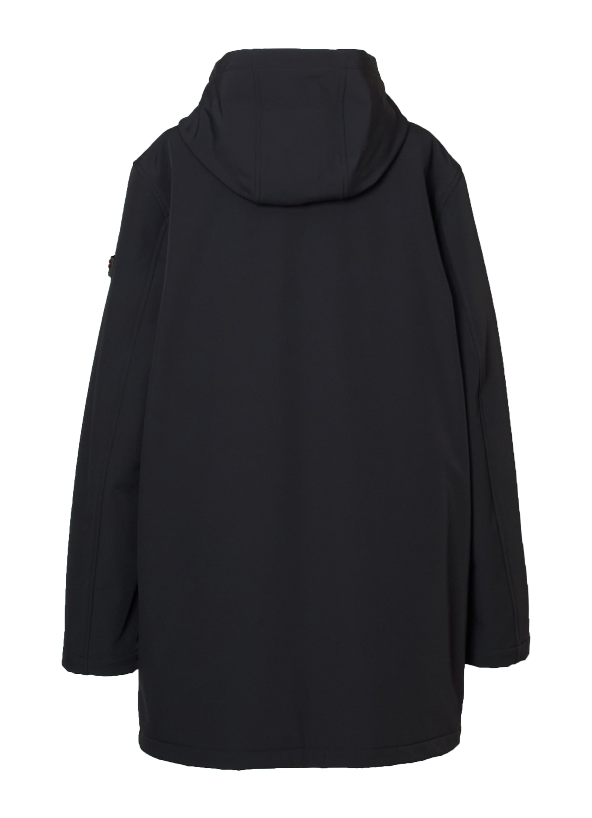 固定フードとドローストリング付きの幅広スタンドカラーが首元をしっかり保護し、伸縮性のある袖口が防風性・防寒性をさらに強化します。
