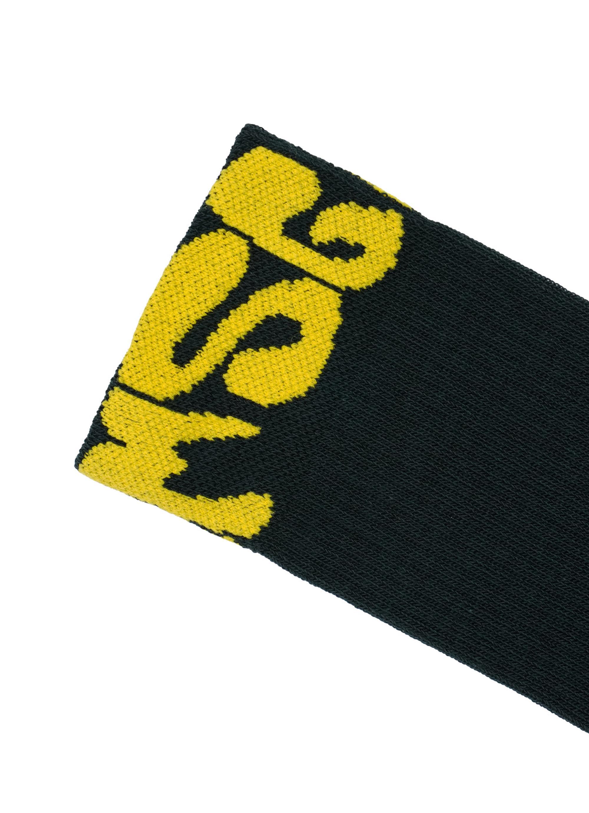 波打つようなカーブロゴが目を引く、アメリブ編みのロゴソックス。