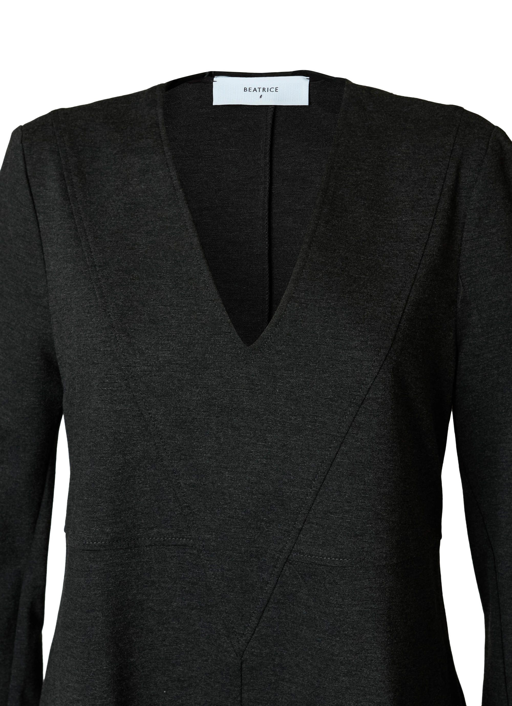 深めのVネックがデコルテを美しく見せ、ミニマルながらも洗練された印象に。レーヨンの柔らかさとナイロンの耐久性が融合し、軽やかでストレスフリーな着心地を叶えます。シーンに応じてアクセントを加えることで、シックにもカジュアルにも表情を変える一着です。
