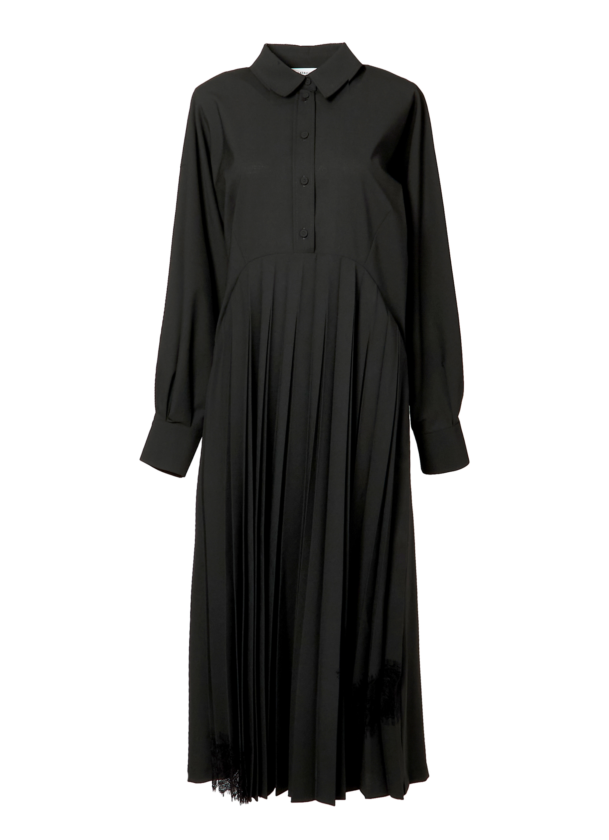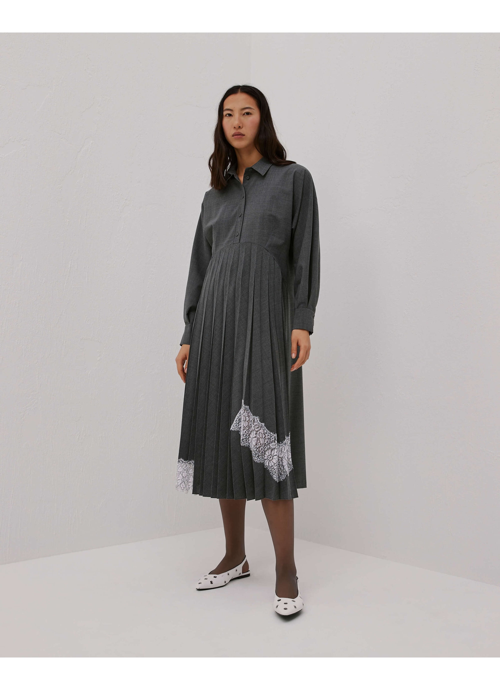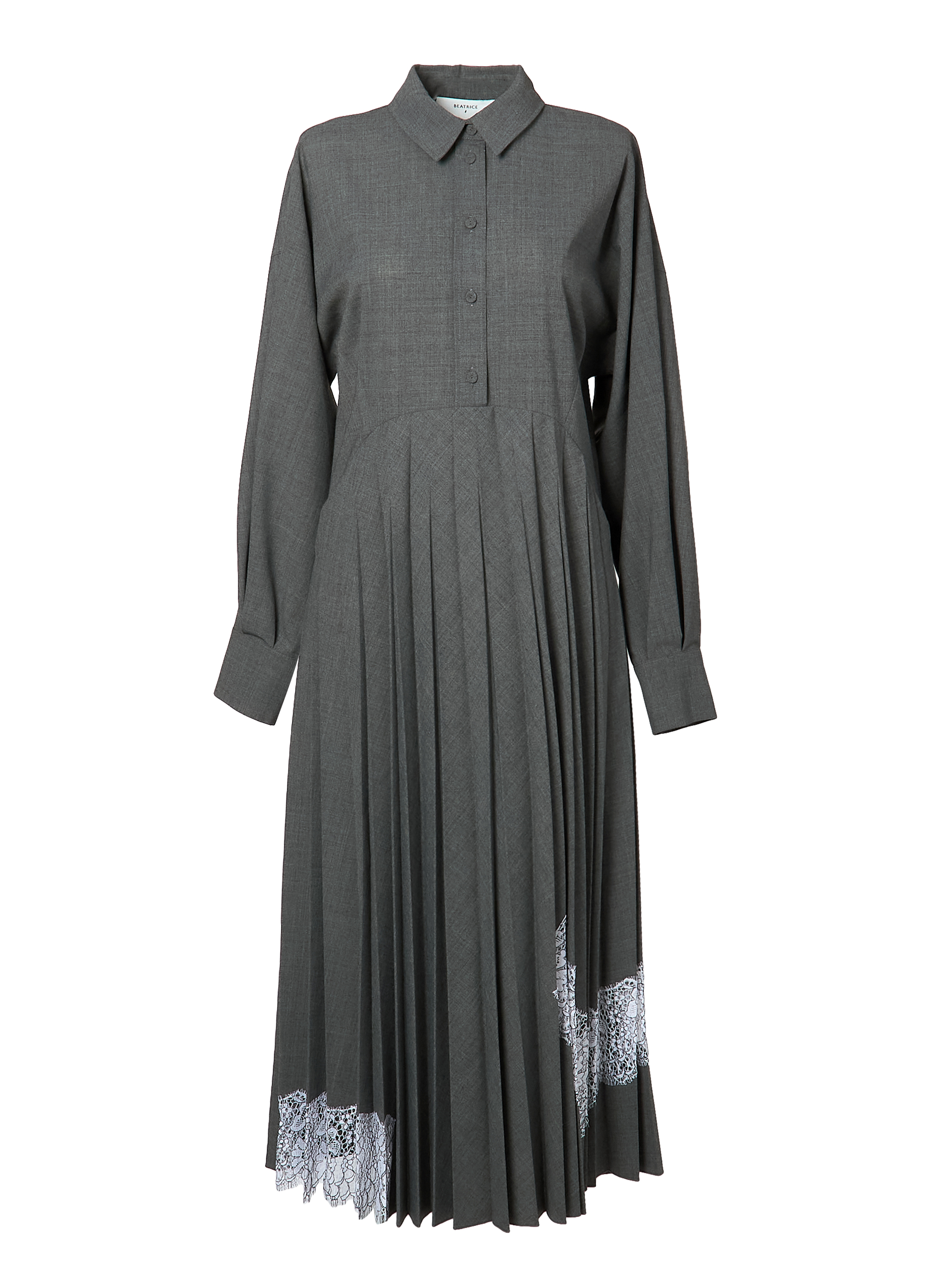 しなやかで落ち感のある素材に、繊細なレースをあしらったプリーツワンピース。