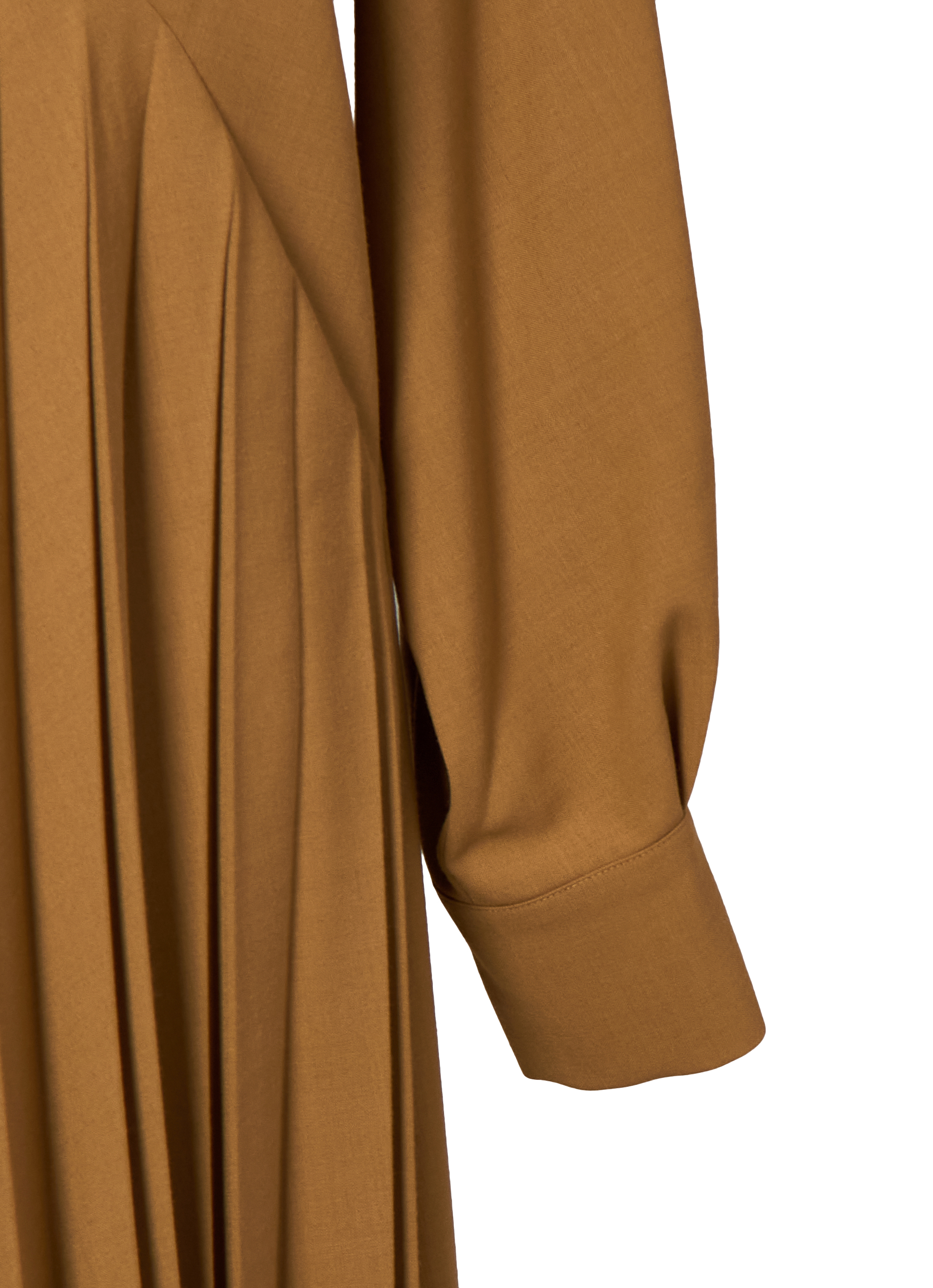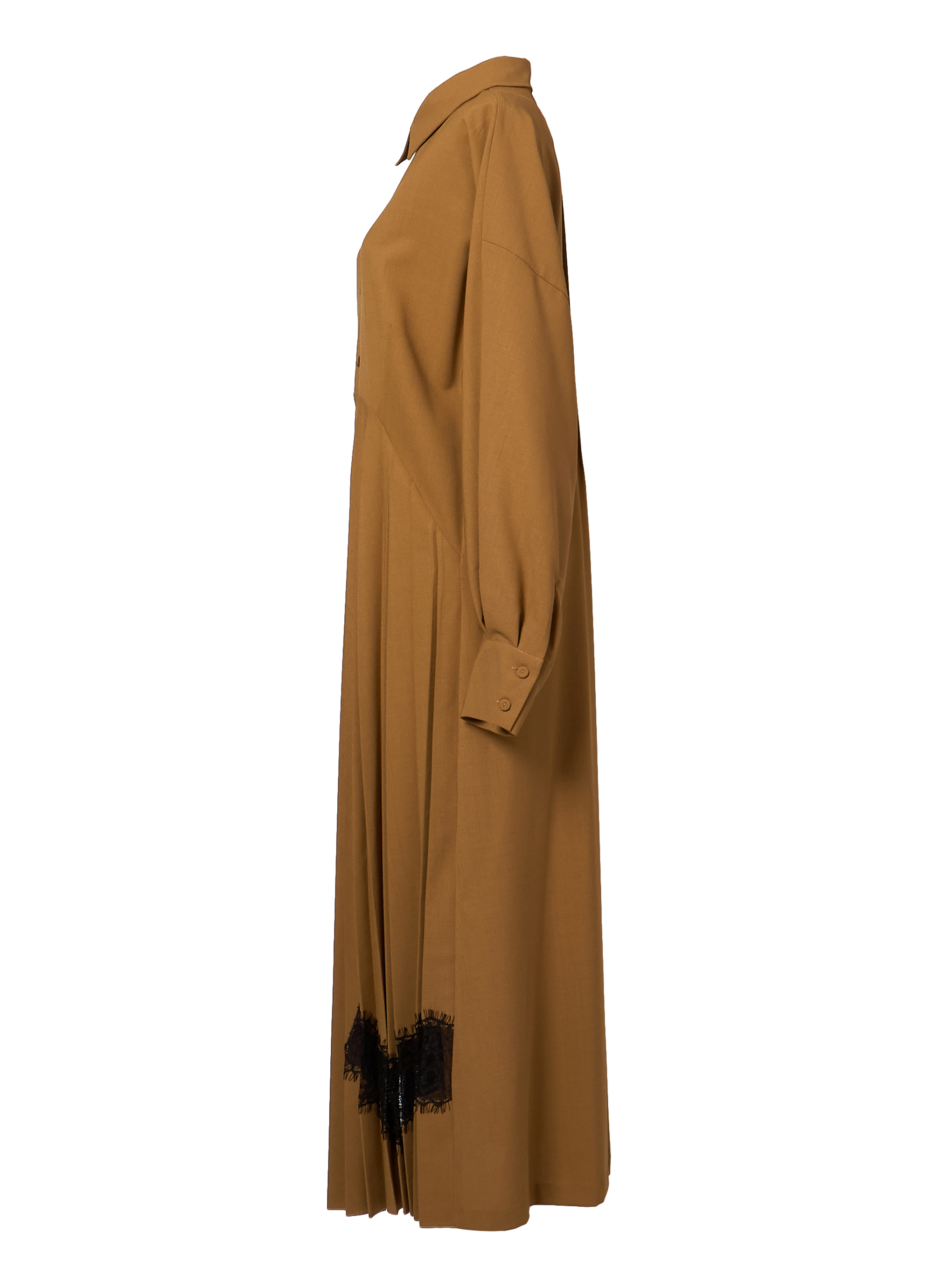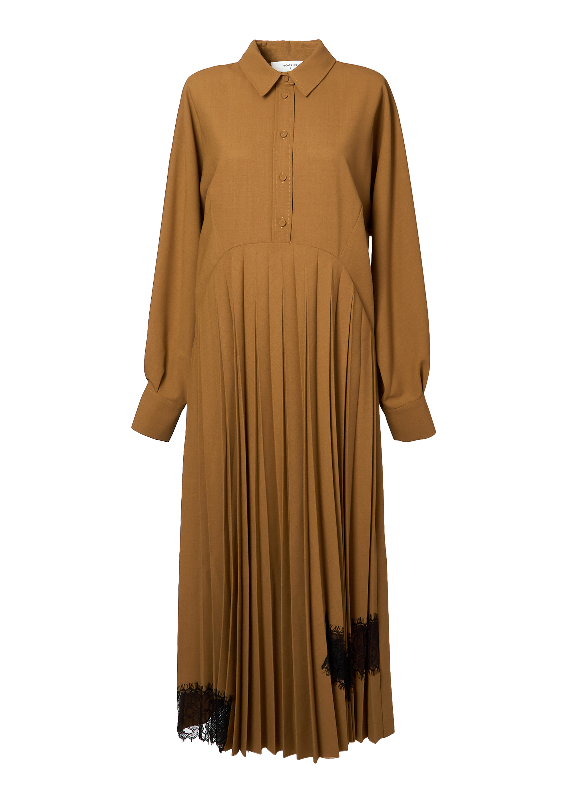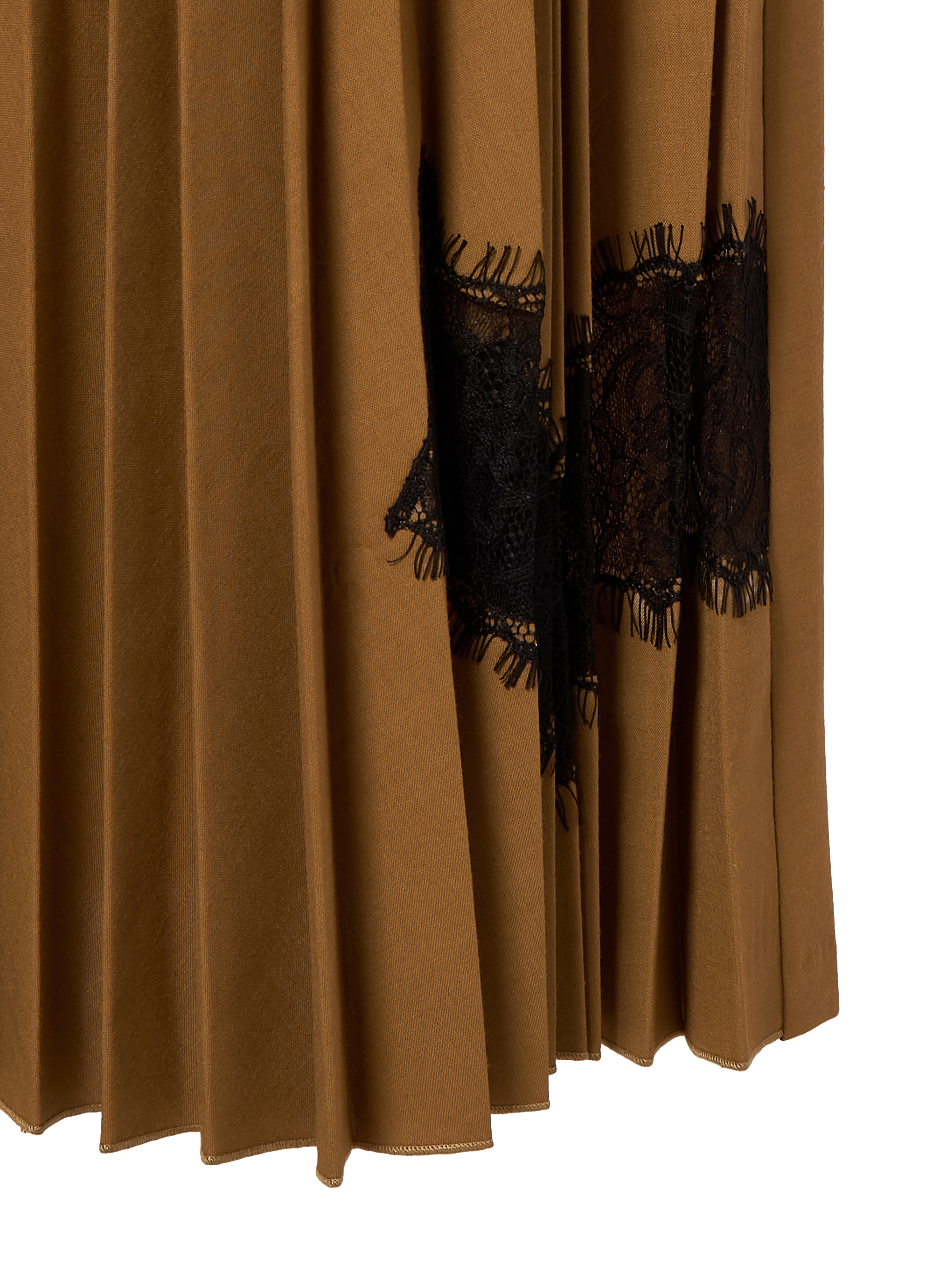 しなやかで落ち感のある素材に、繊細なレースをあしらったプリーツワンピース。