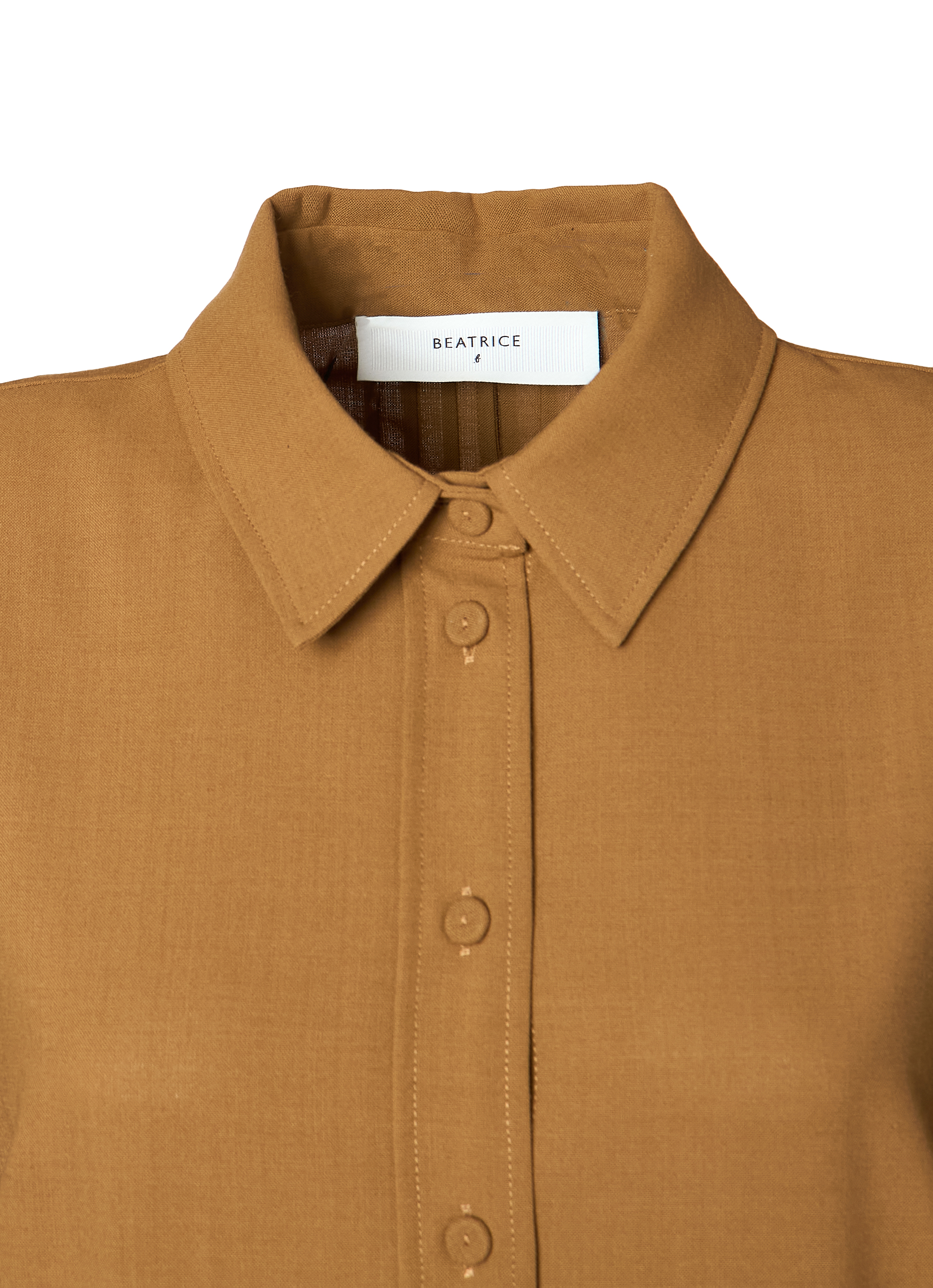 フロントのボタンと襟元のデザインがクラシカルな雰囲気を漂わせつつ、裾に施されたレースが軽やかでフェミニンな印象を添えます。