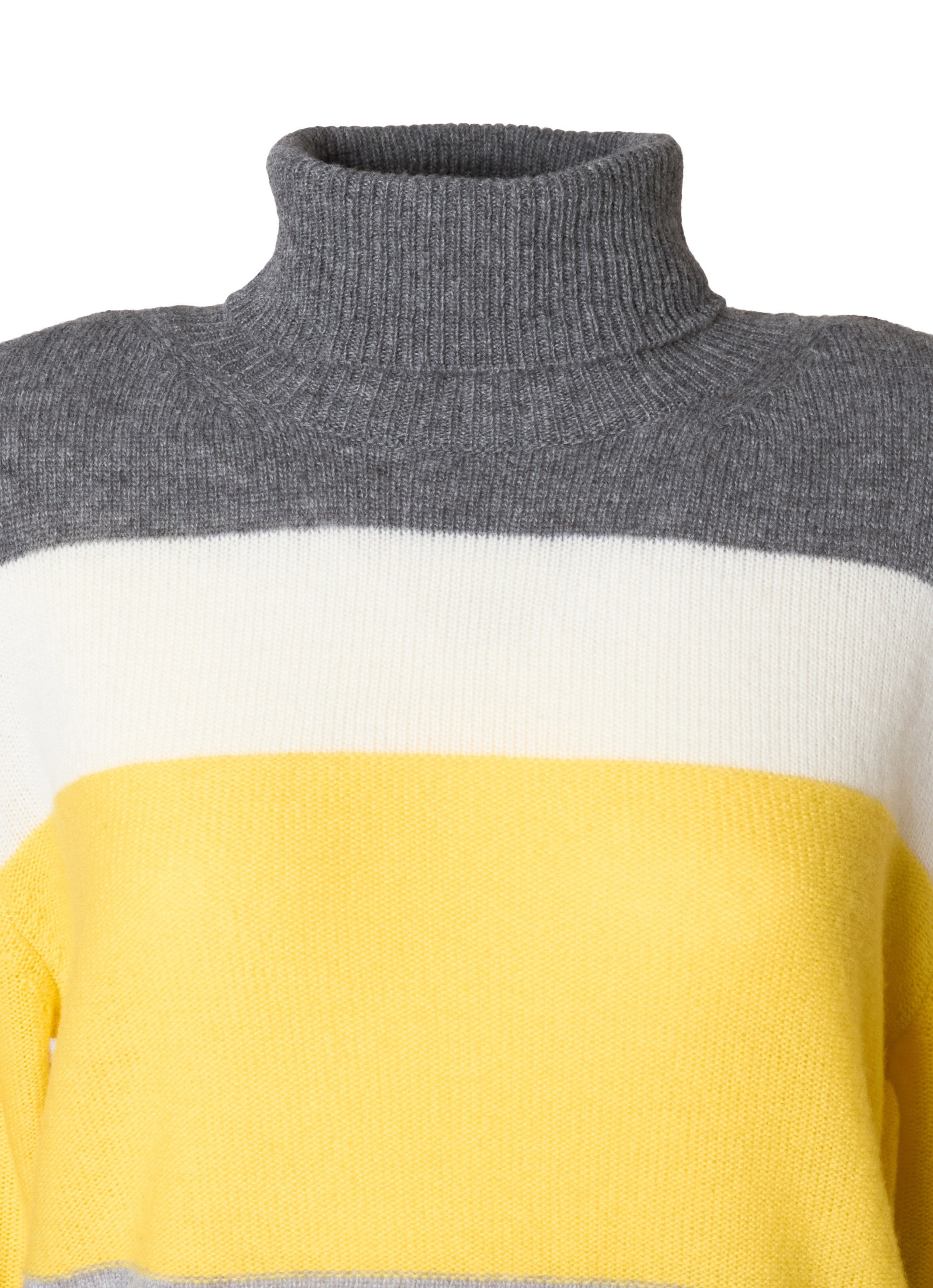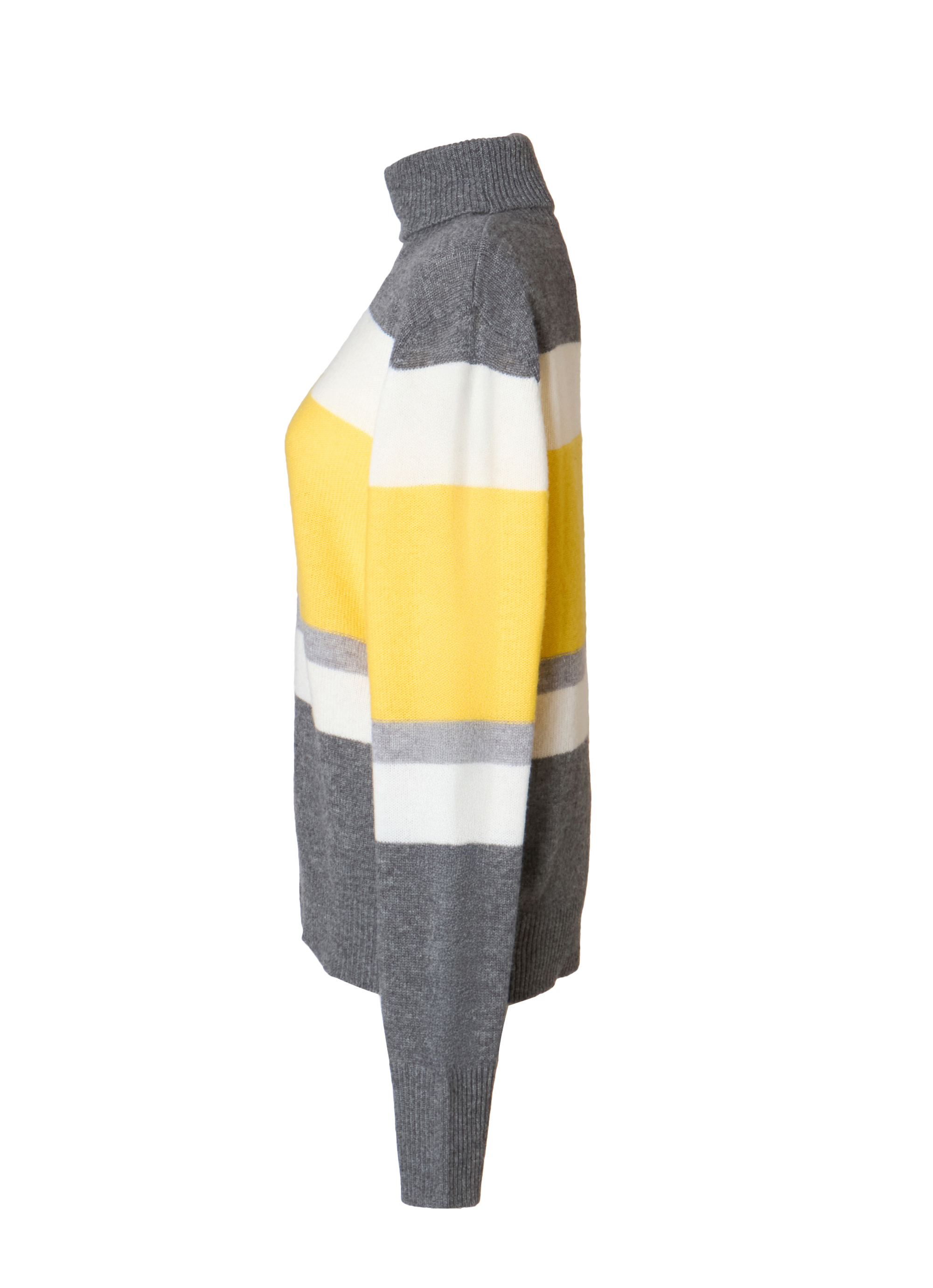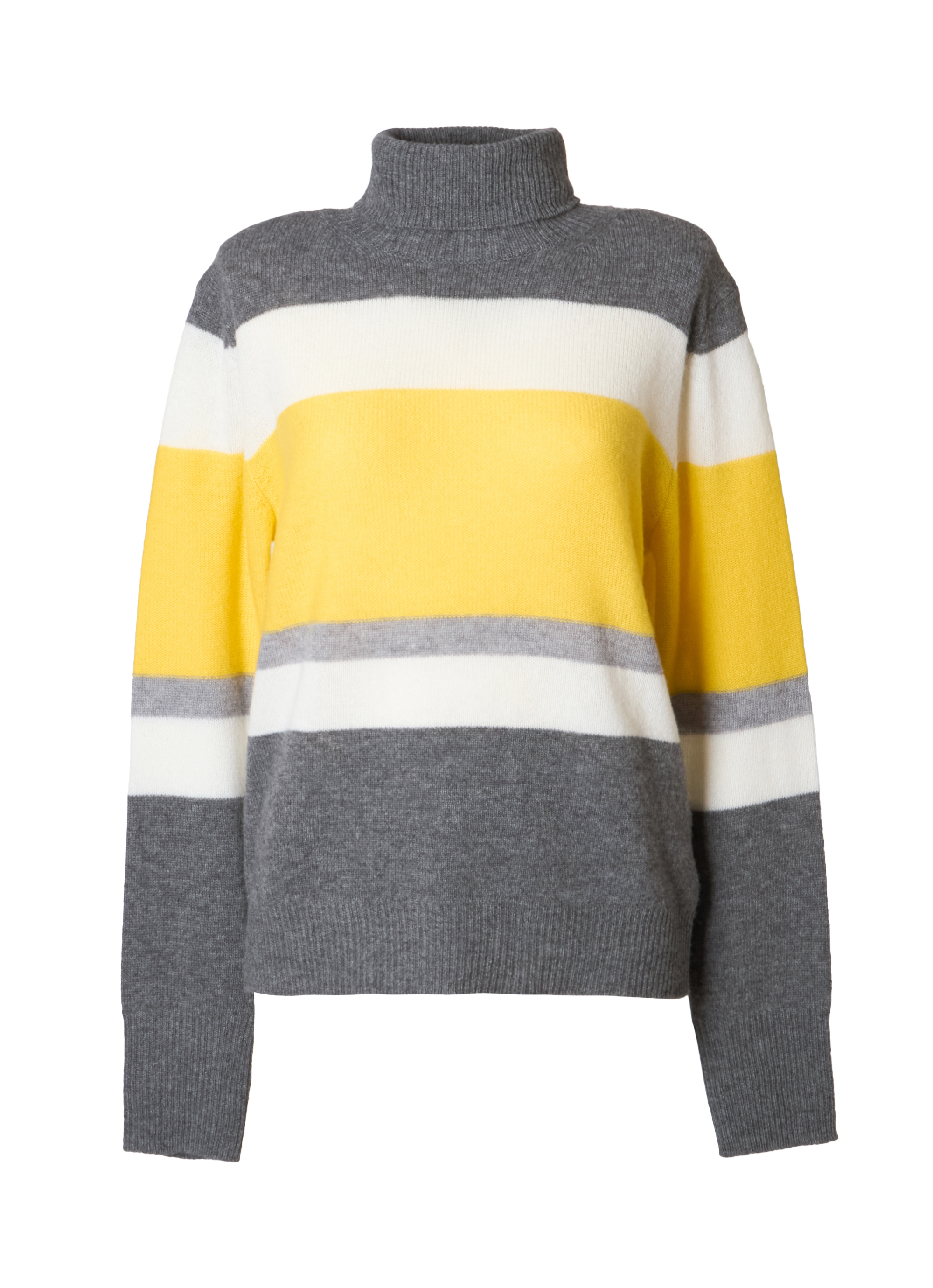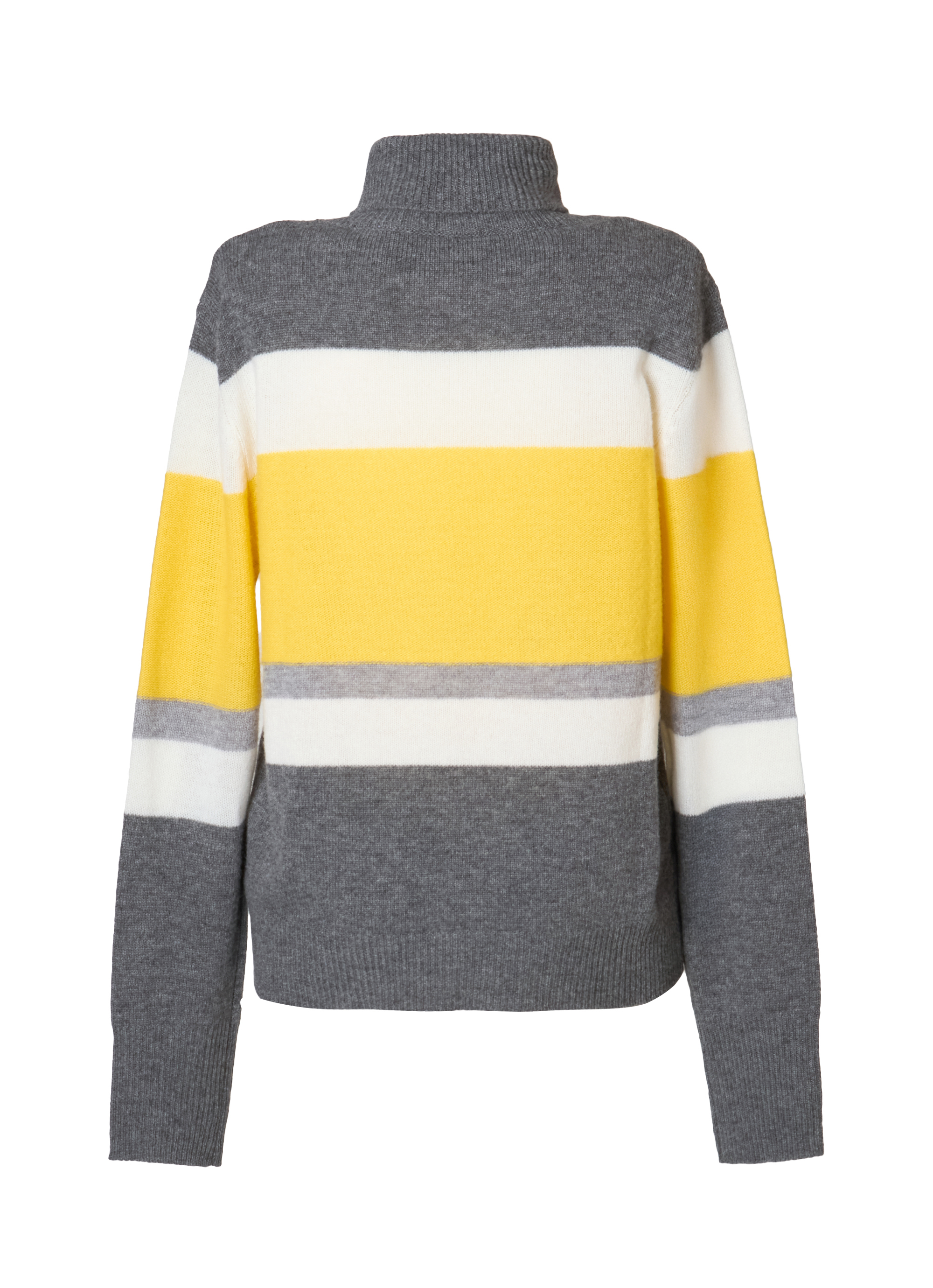 柔らかく暖かな風合いと、リズミカルなボーダーデザインが特徴です。首元までしっかり包み込むタートルネックが防寒性を高めつつ、スタイリングに程よい存在感をプラス。シンプルなボトムと合わせるだけで、コーディネートに奥行きを与える一着です。