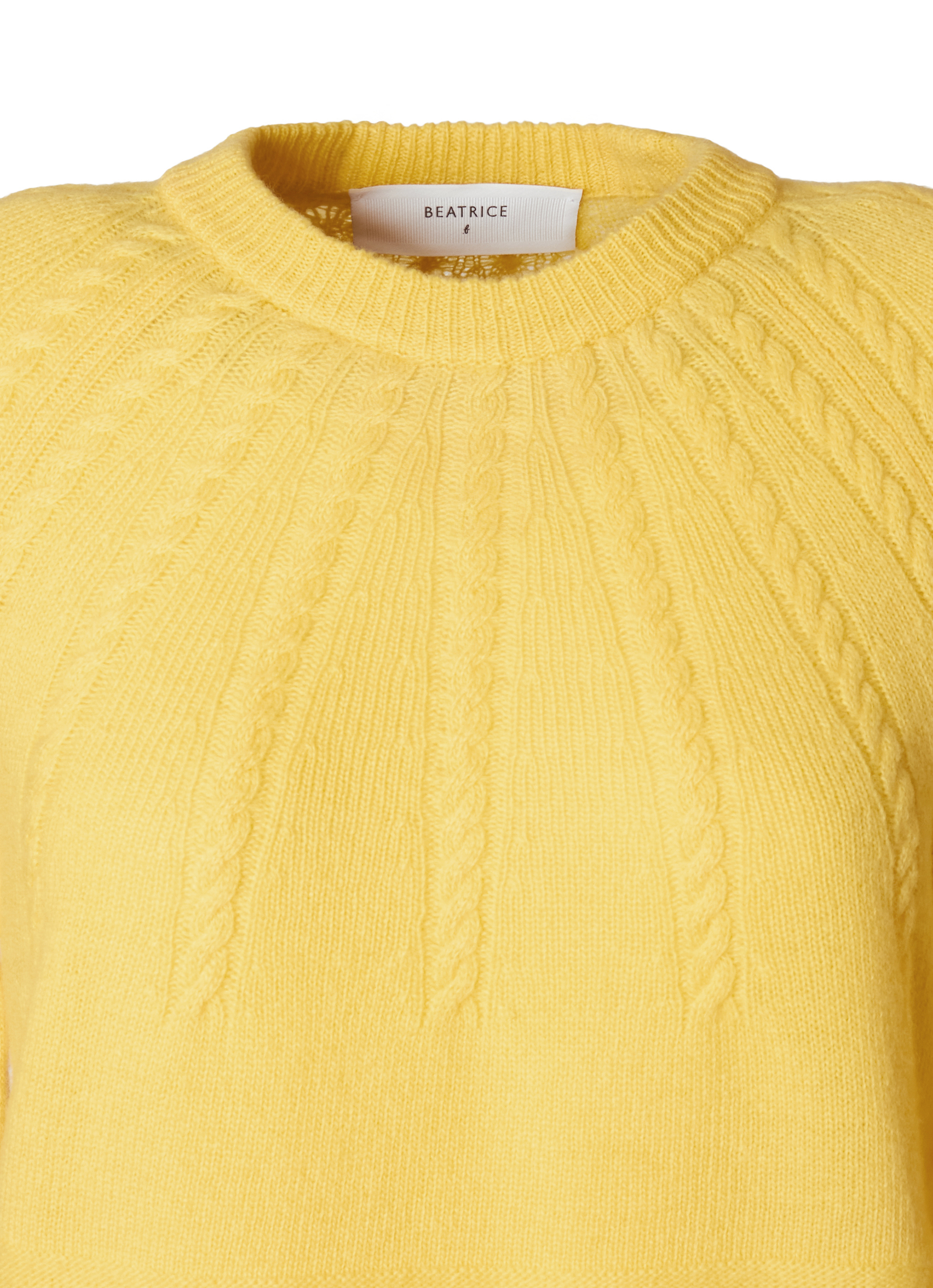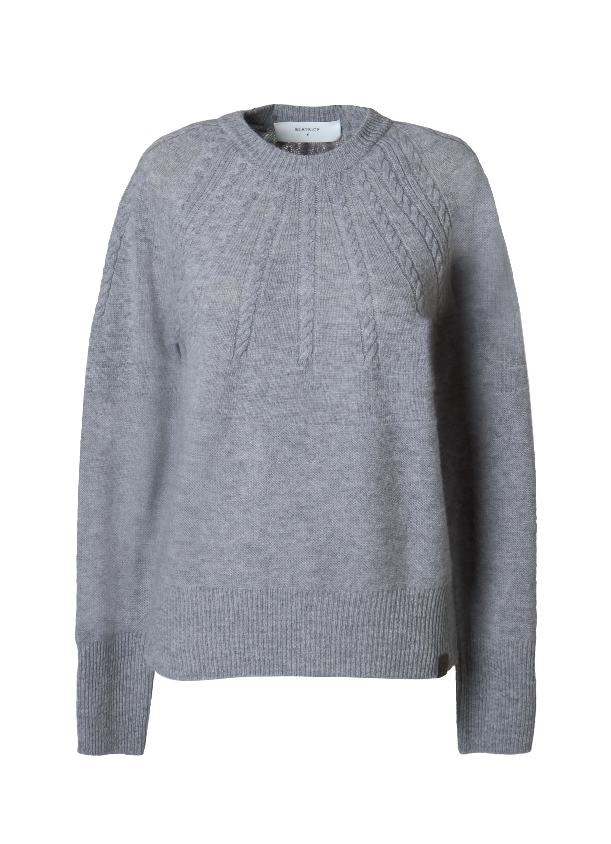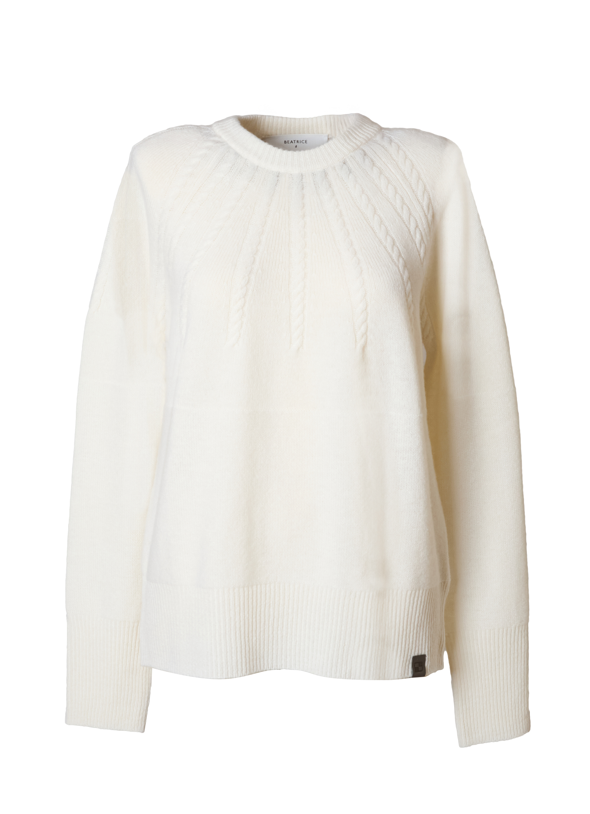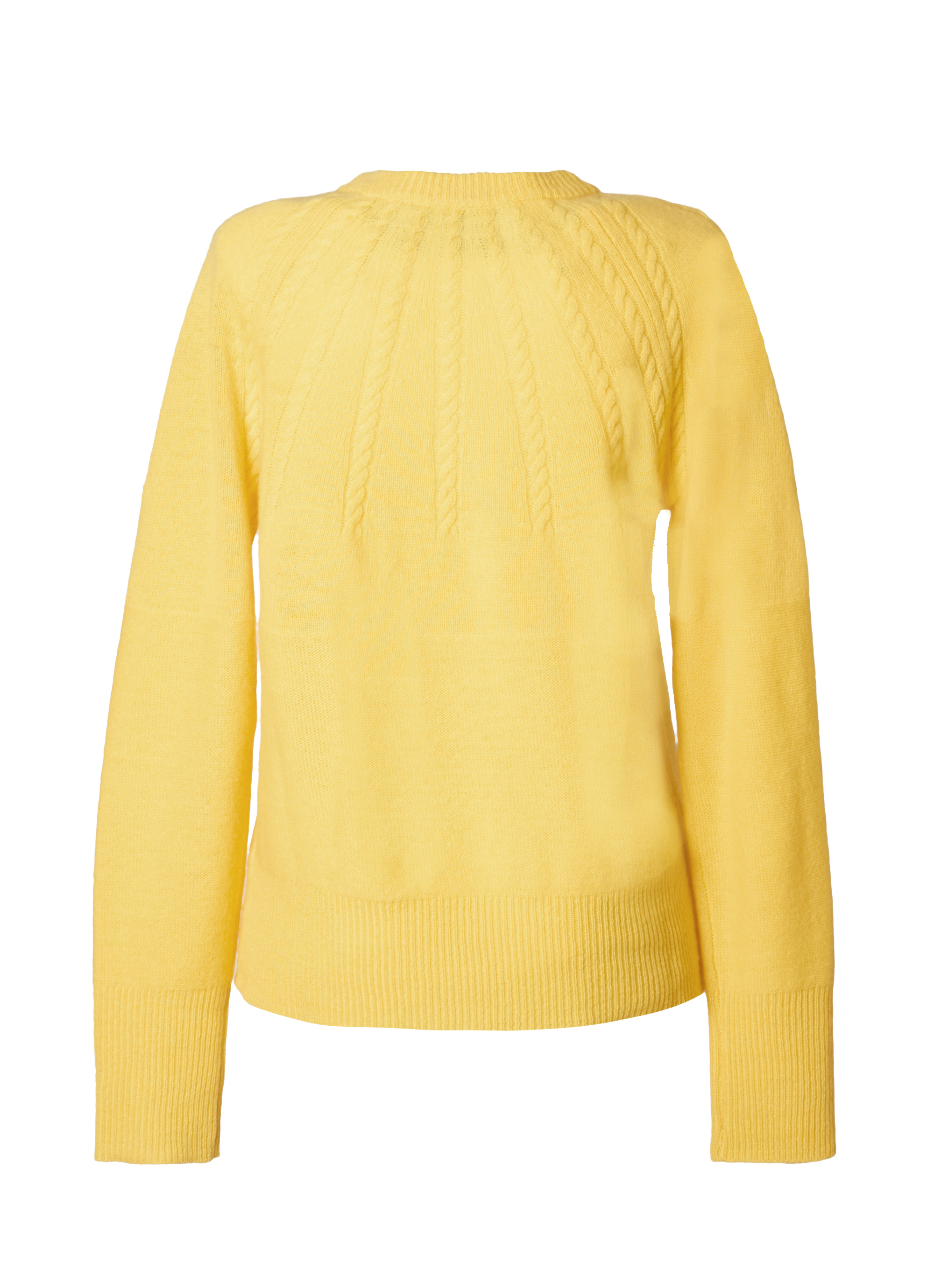 ネックラインから放射状に広がるケーブル編みが印象的で、シンプルながらも立体感のあるデザインに仕上がっています。ふっくらとした質感と自然な保温性が季節感のあるスタイリングを叶え、一枚で着映えするアイテム。パンツにもスカートにも合わせやすくデイリーに活躍します。