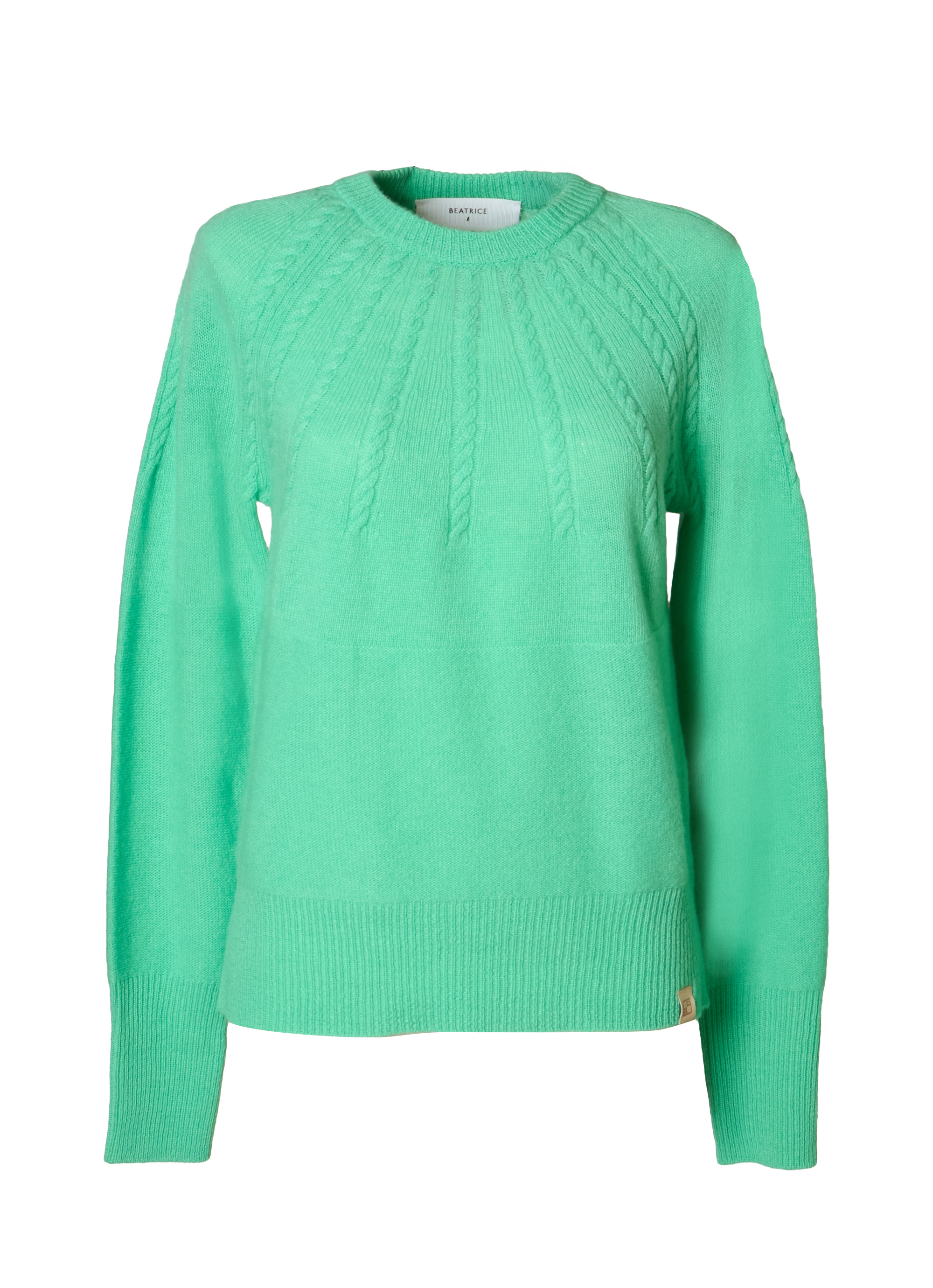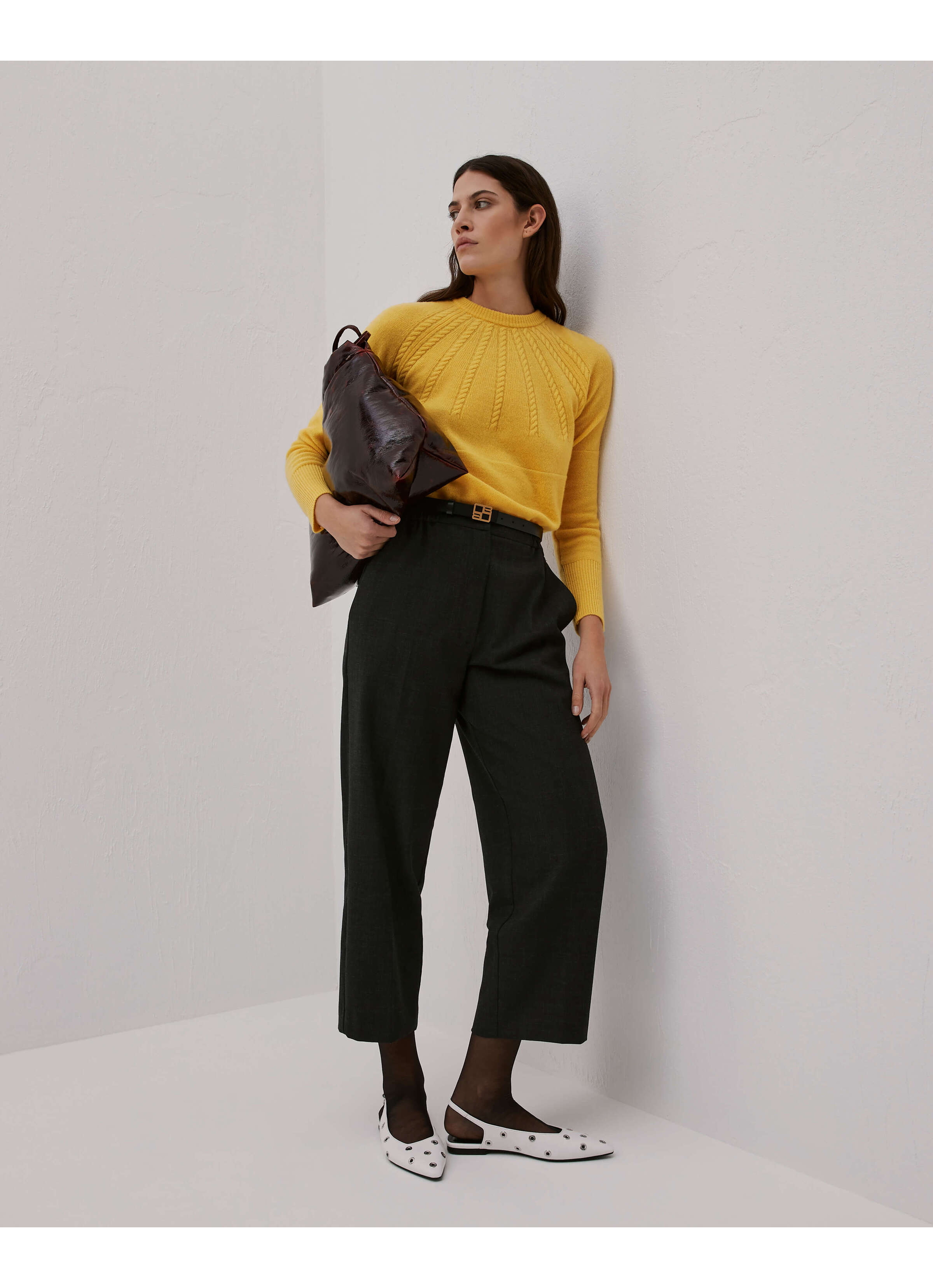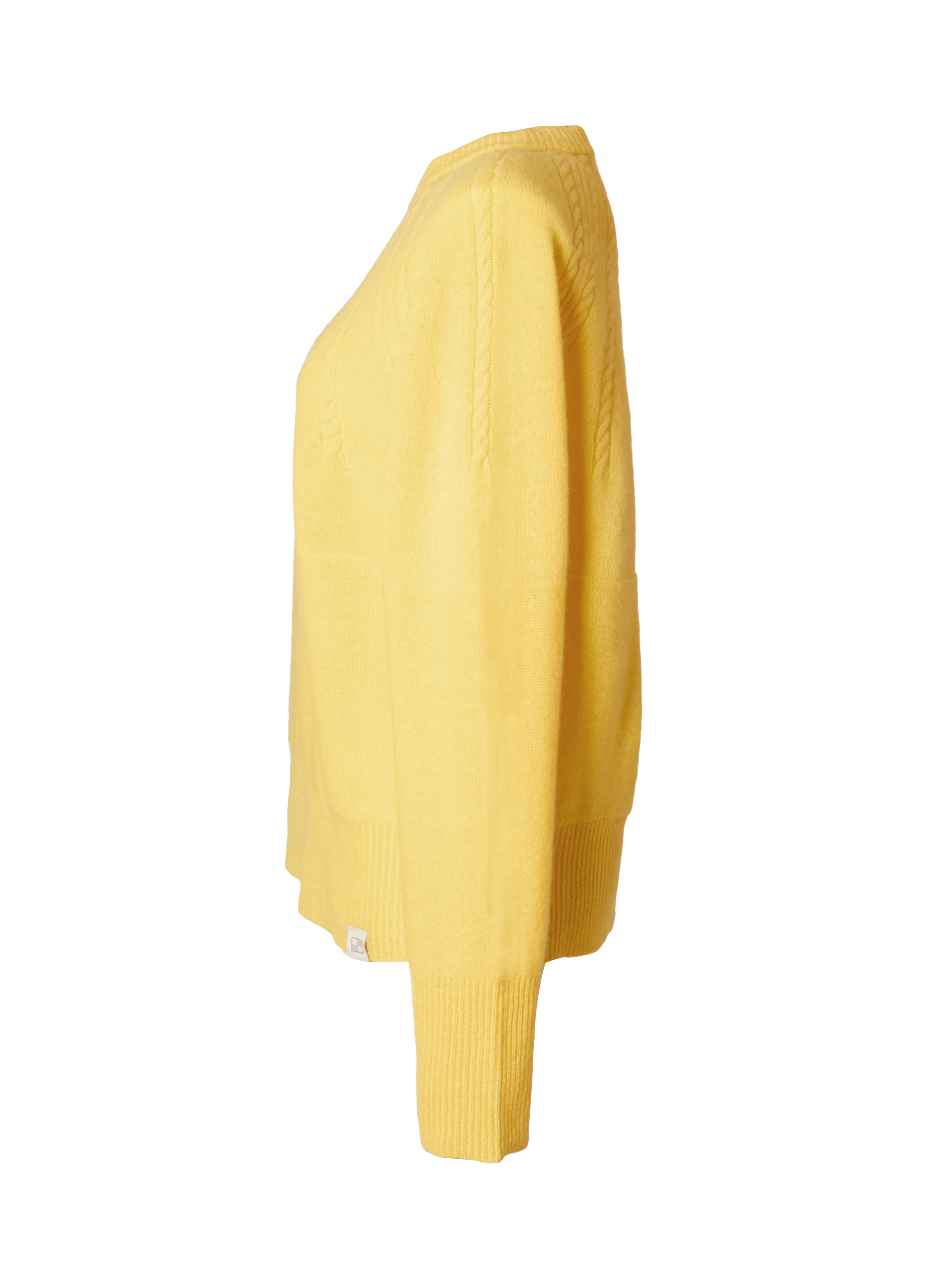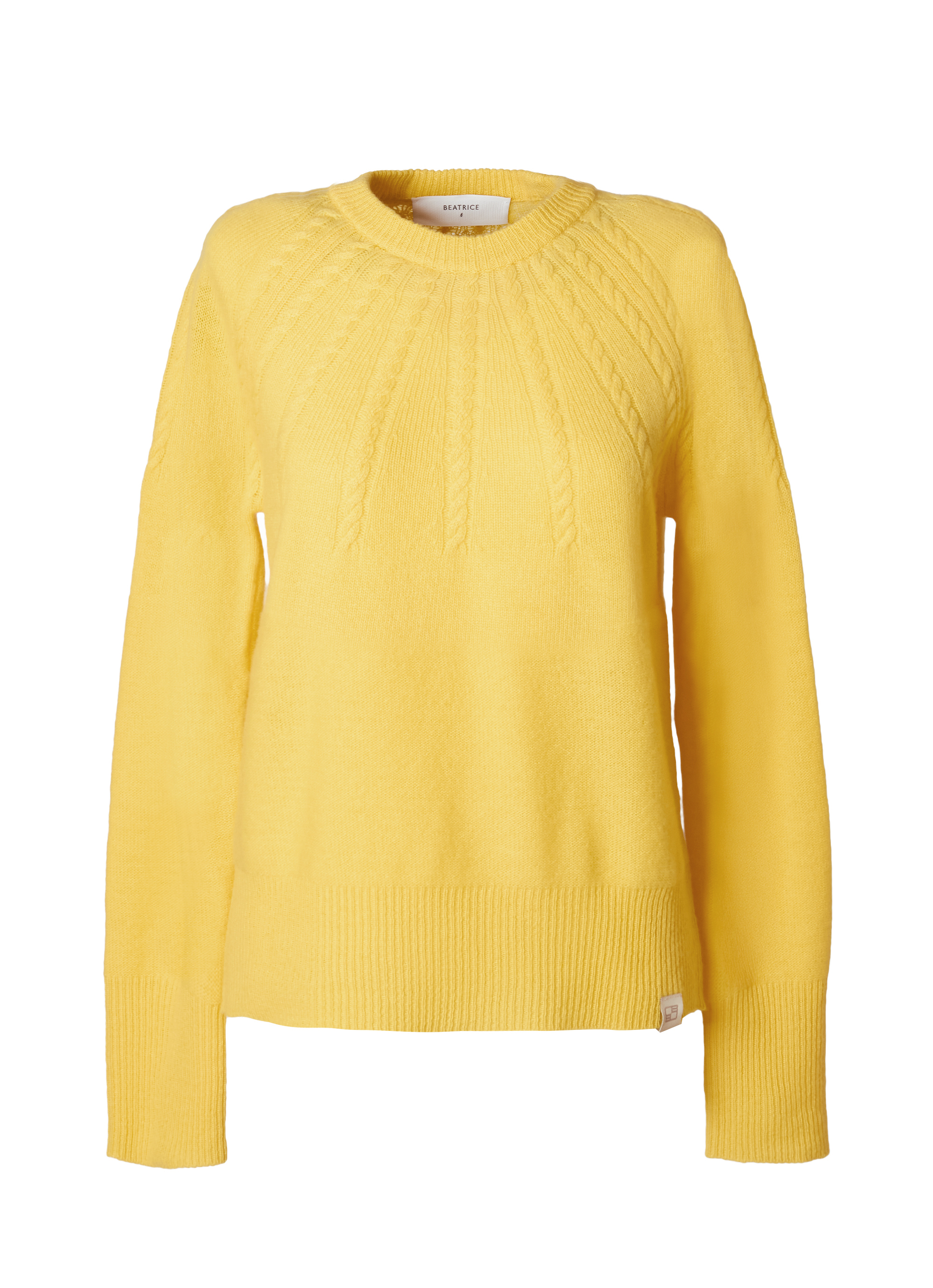 ネックラインから放射状に広がるケーブル編みが印象的で、シンプルながらも立体感のあるデザインに仕上がっています。ふっくらとした質感と自然な保温性が季節感のあるスタイリングを叶え、一枚で着映えするアイテム。パンツにもスカートにも合わせやすくデイリーに活躍します。