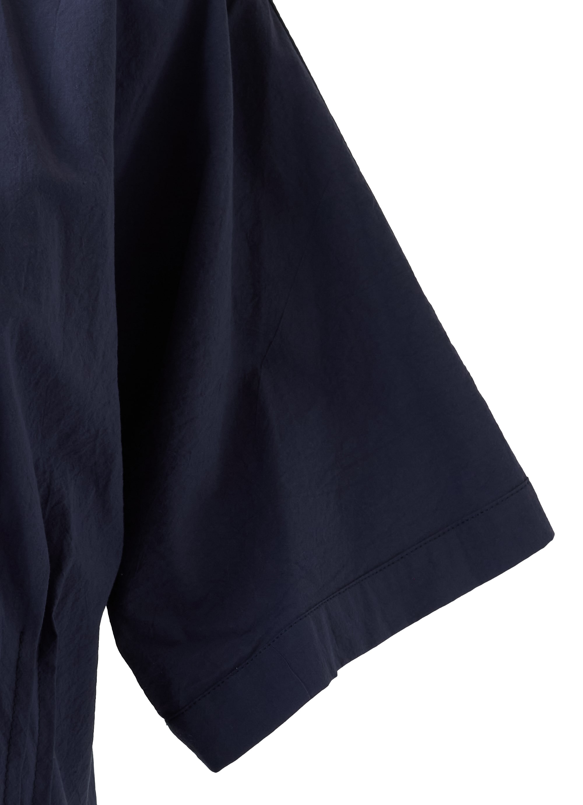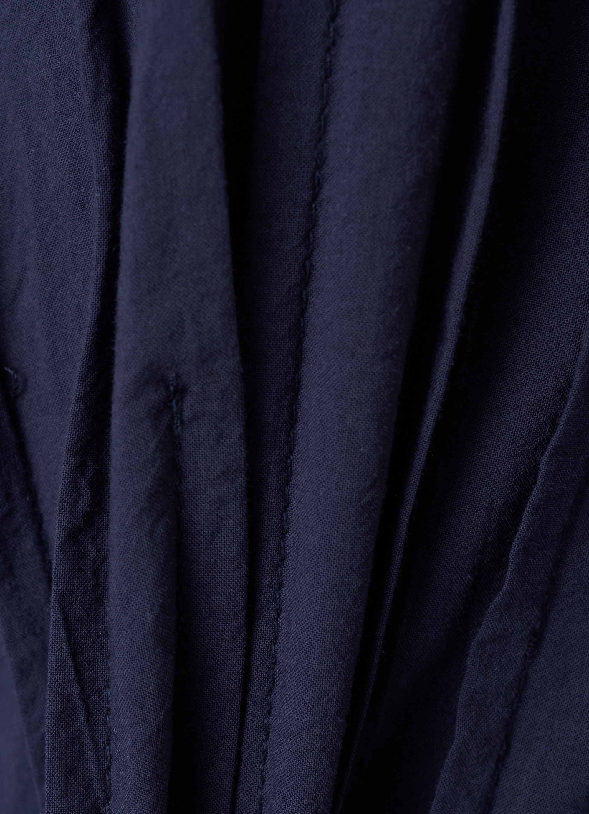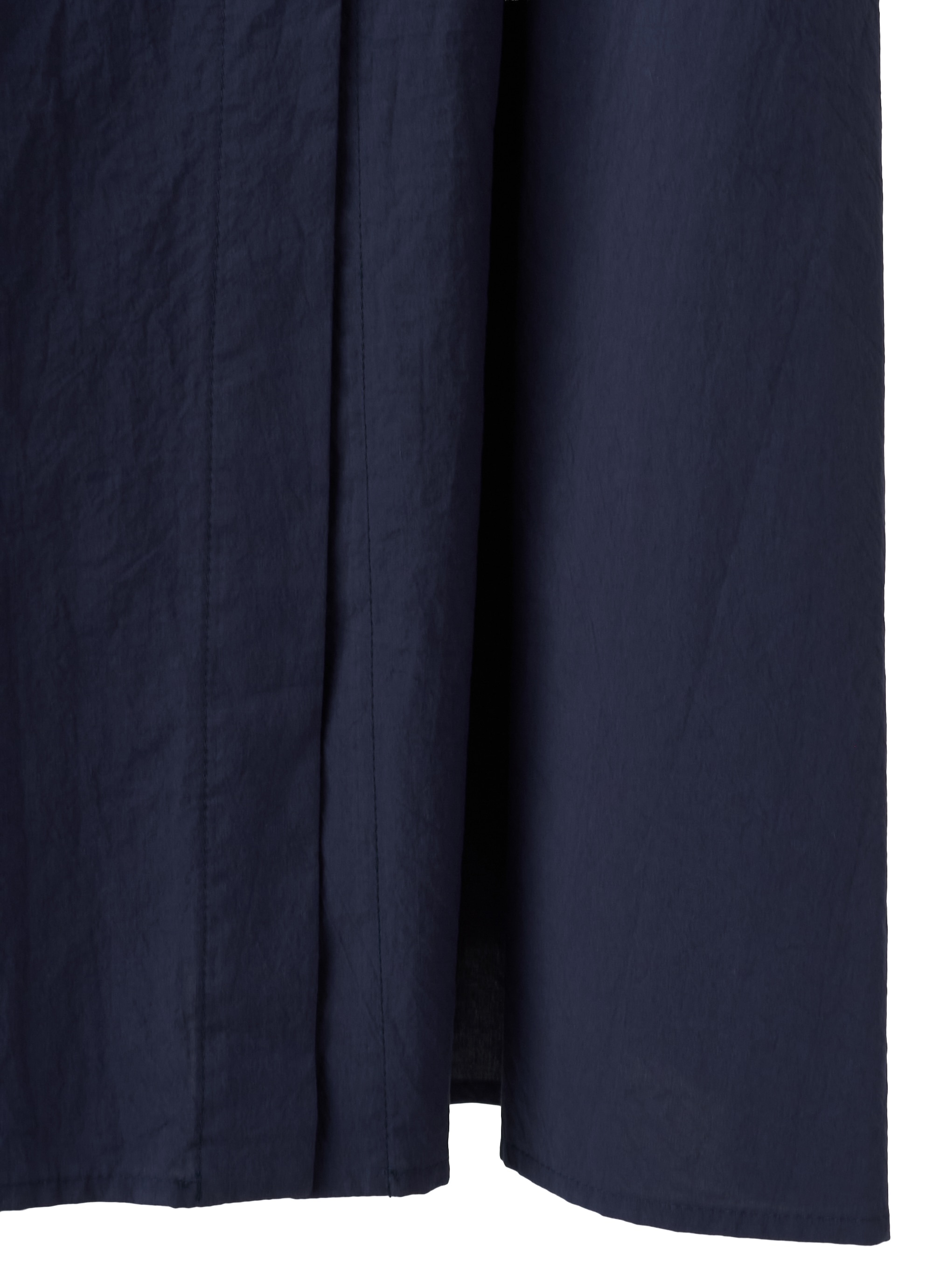 本体は自然なハリのあるコットン生地で仕立てられ、フロントに入れた繊細なタックが縦のラインを強調し、すっきりとしたシルエットを描きます。