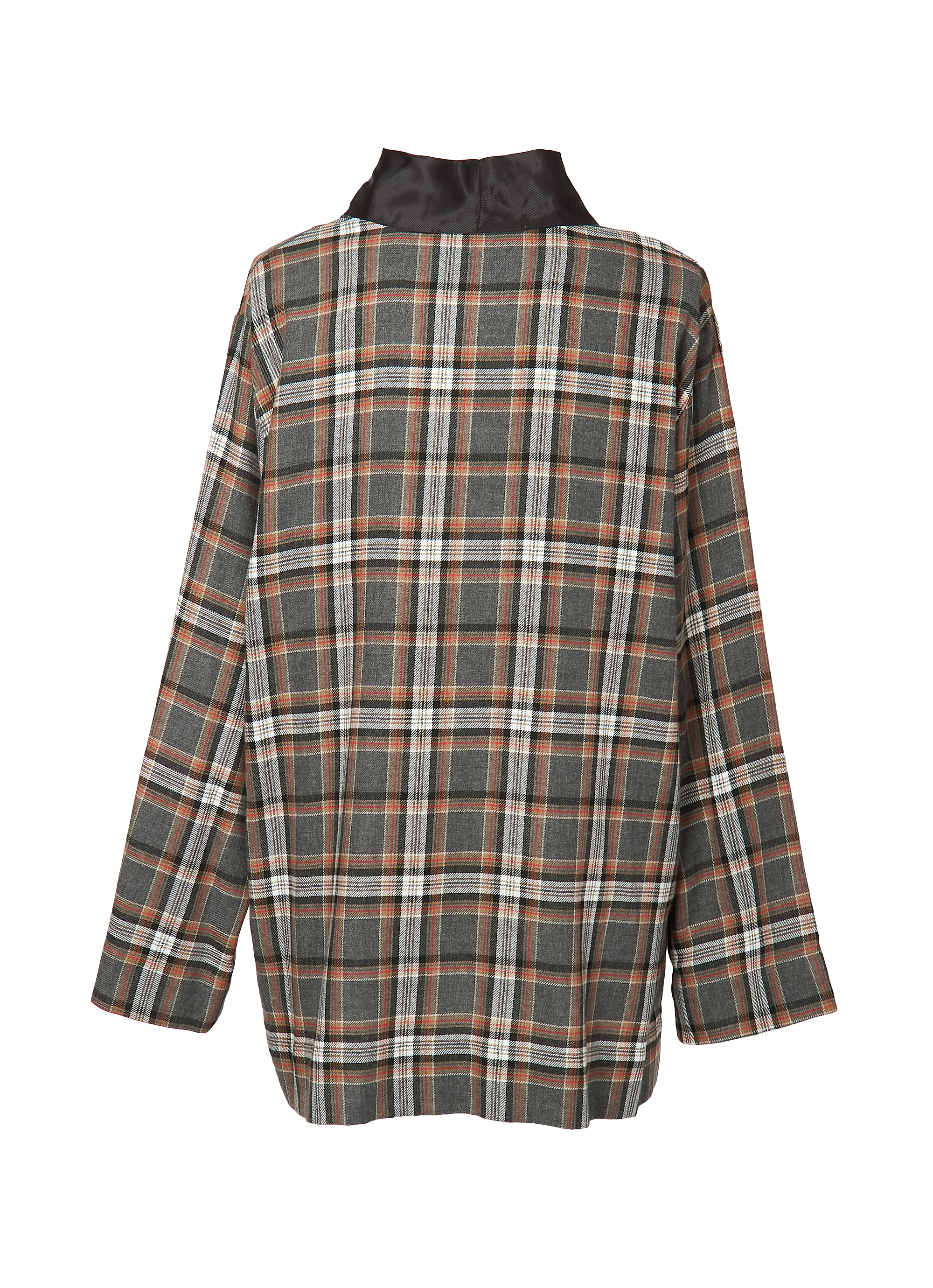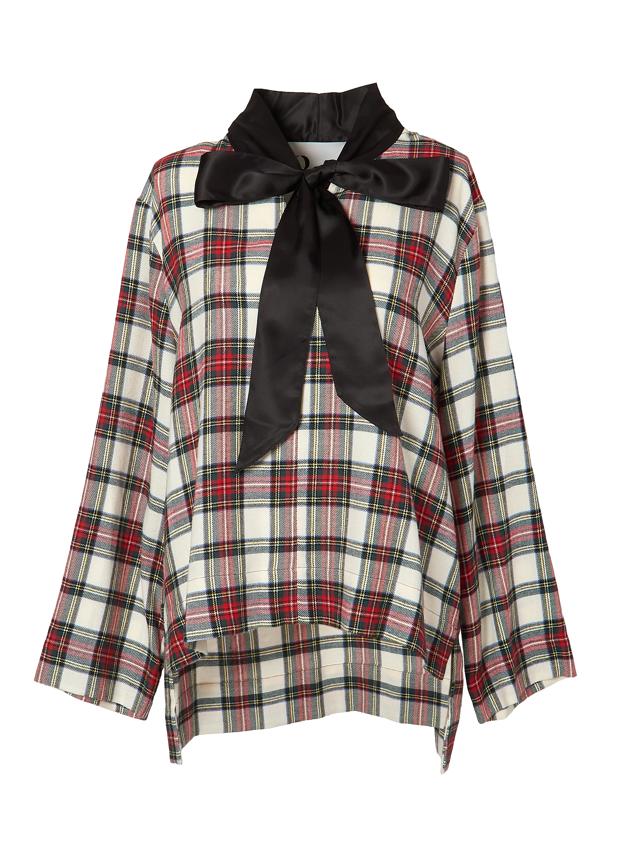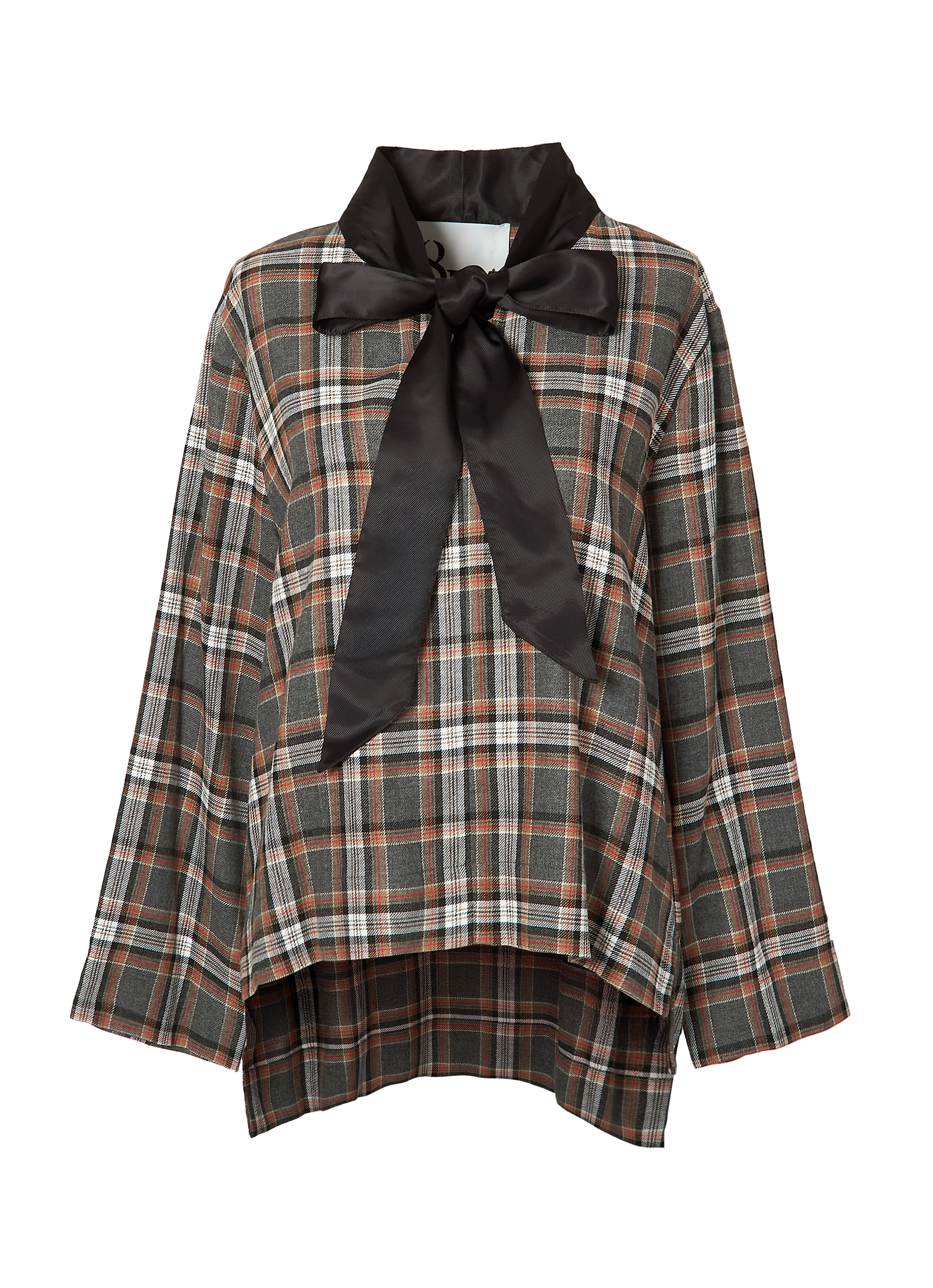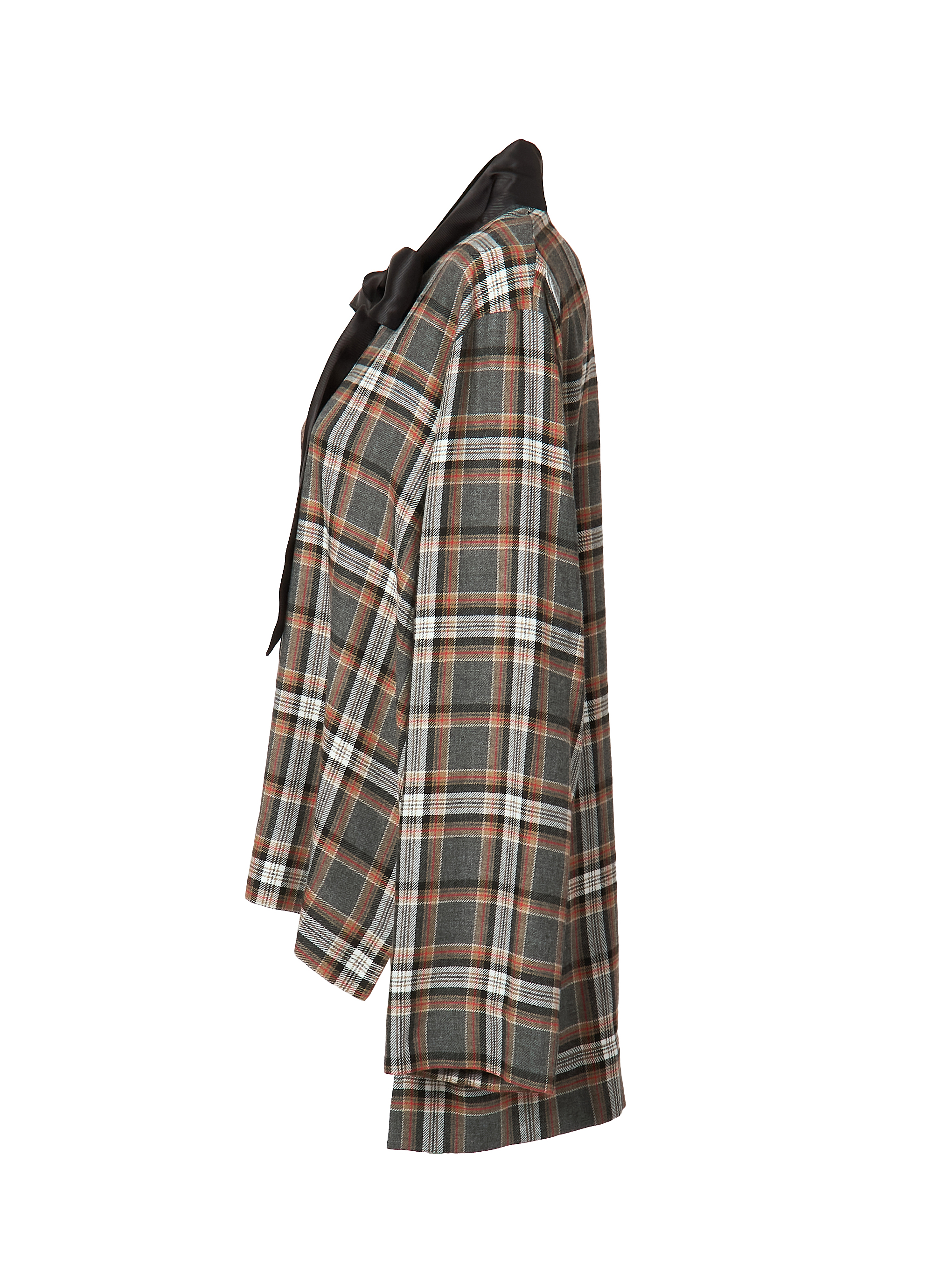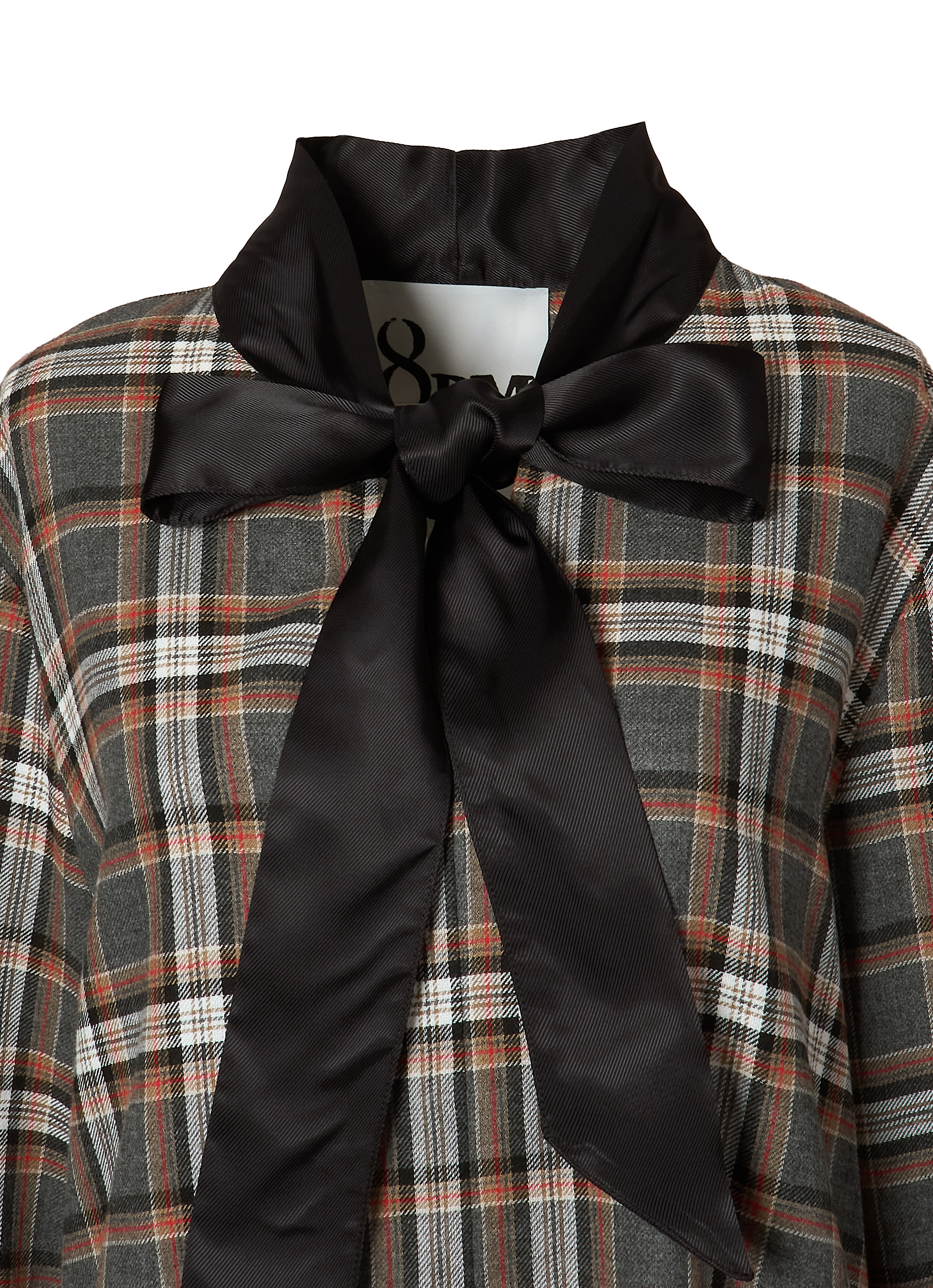 襟元にはボウタイが縫い付けられており、質感の違いがさりげない奥行きを生み出しています。