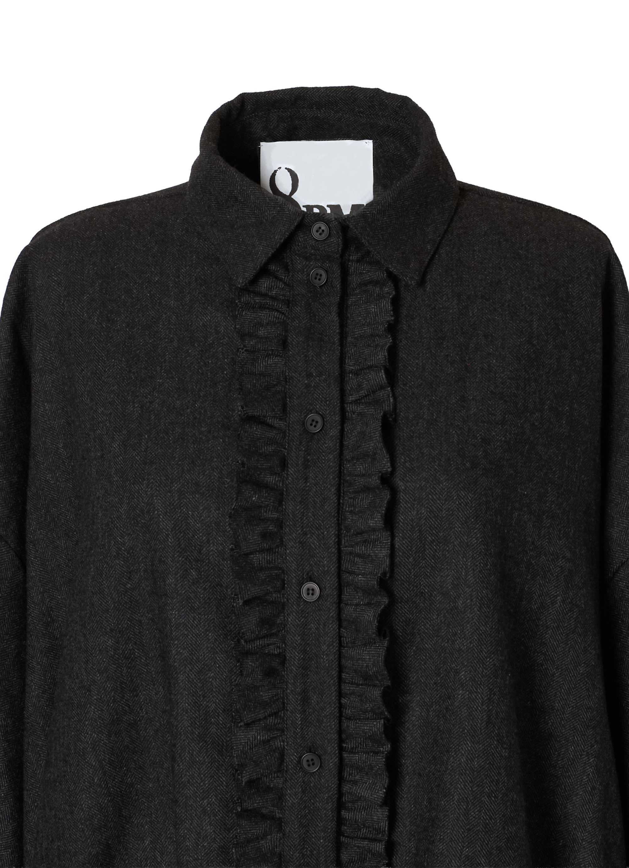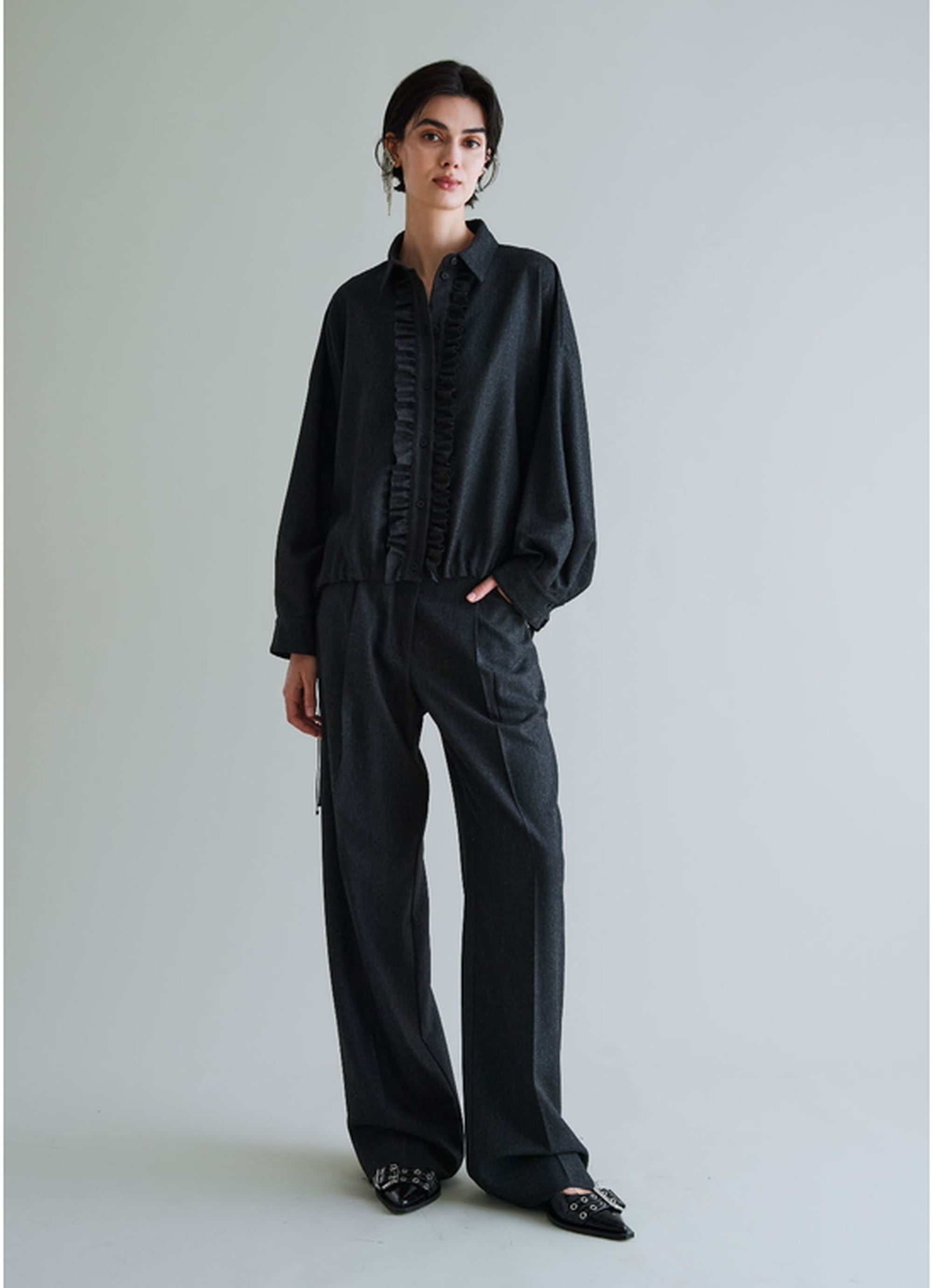 フロントにあしらわれたフリルがクラシックな印象の中にやわらかな華やかさを添え、動きに合わせて表情を変えます。