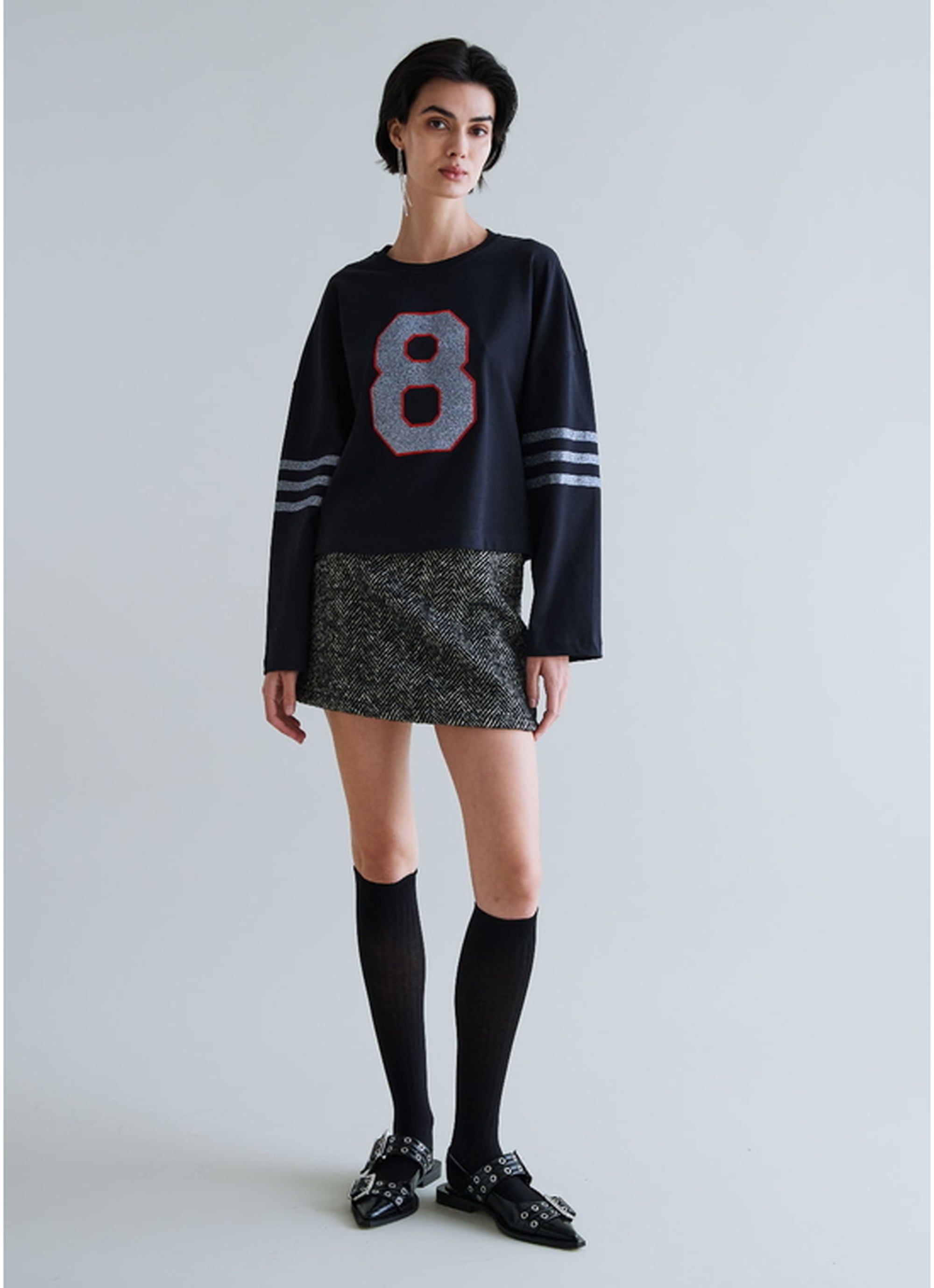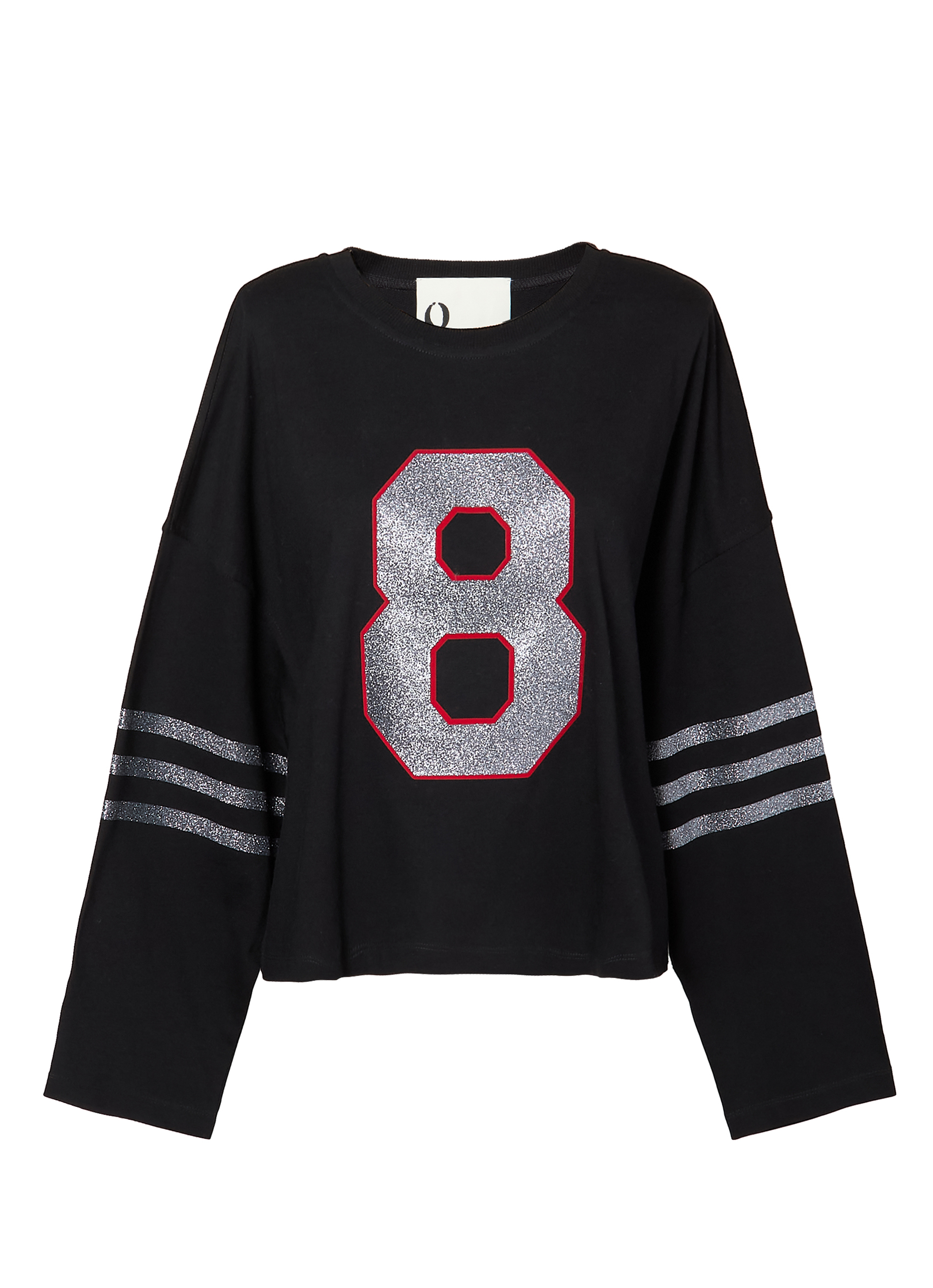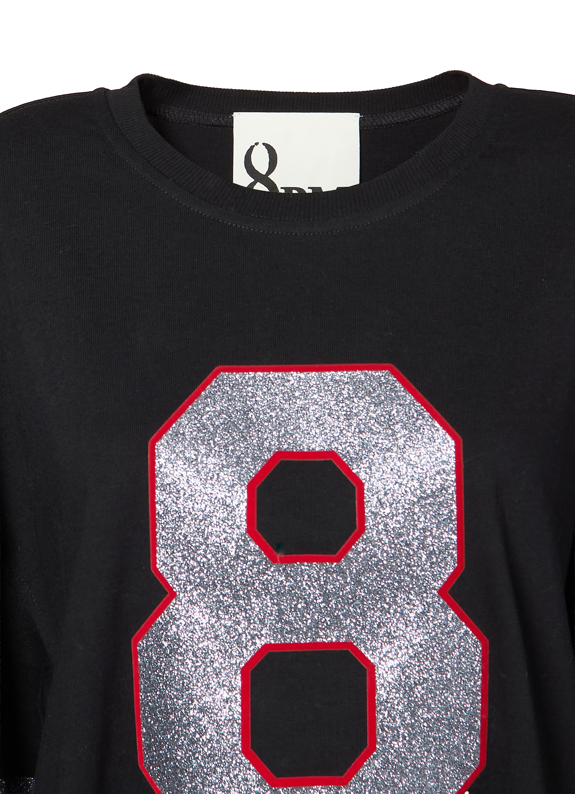 フロントにはブランドの象徴ともいえる「8」のナンバープリントを施し、グリッター素材とレッドの縁取りが印象的なアクセントに。