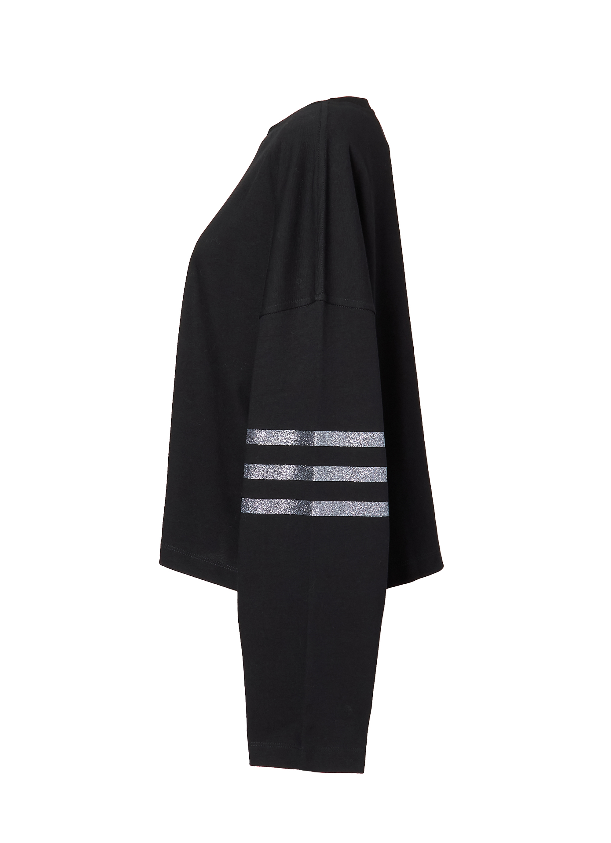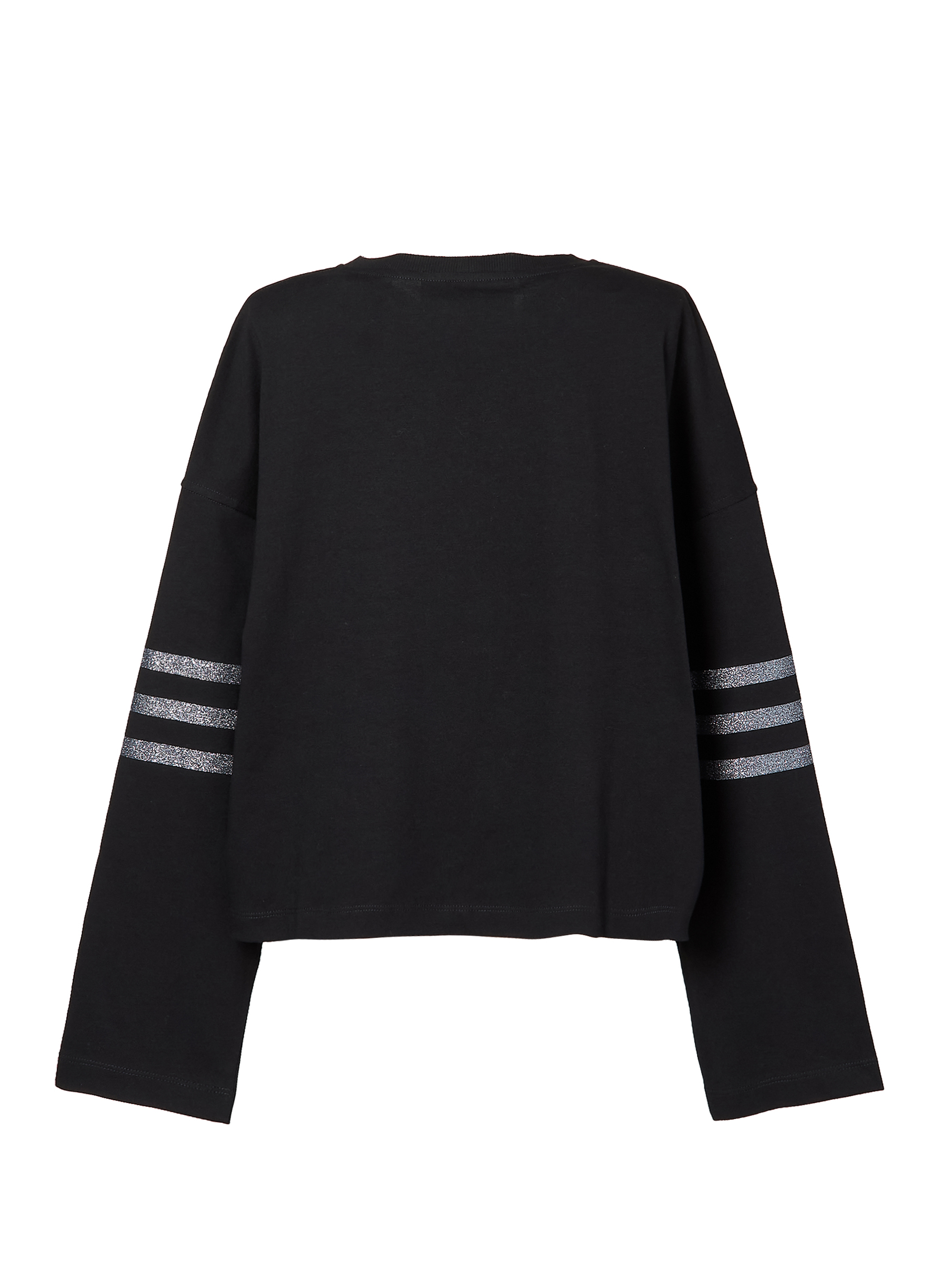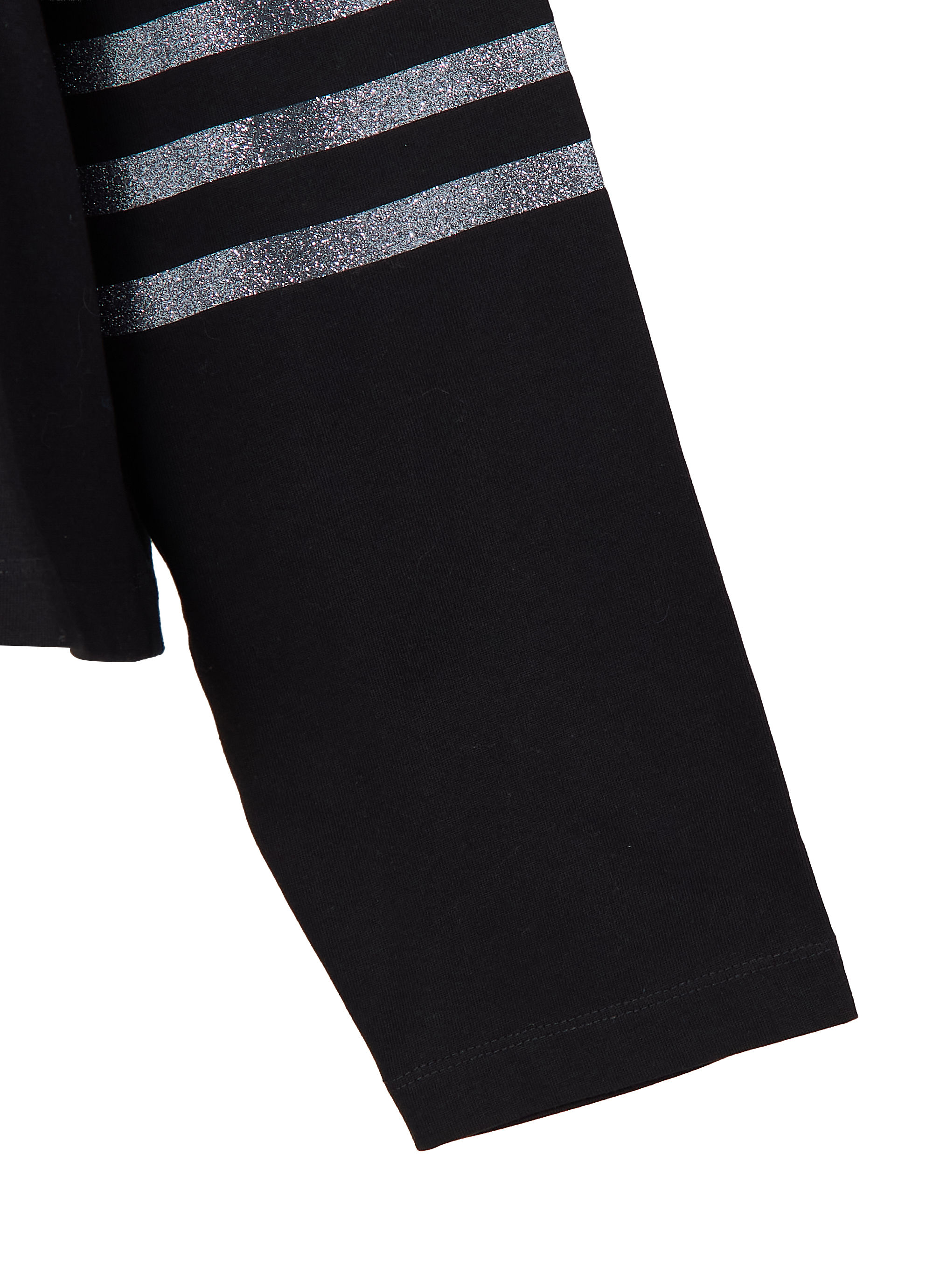 袖には同じくグリッターのラインが入り、スポーティーな要素を取り入れたデザインが特徴です。