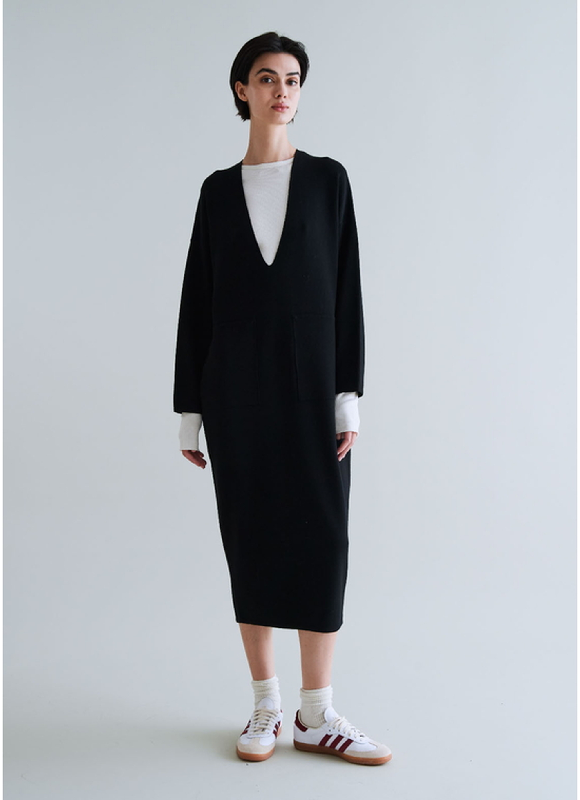 深めのVネックはインナーとのレイヤードスタイルを楽しめるデザイン。タートルネックなどを合わせることで、季節やシーンに応じた着こなしが可能です。