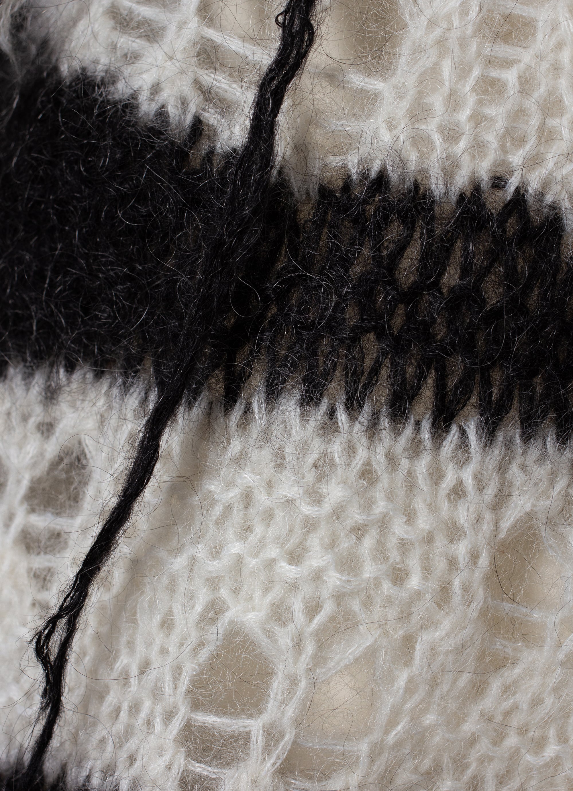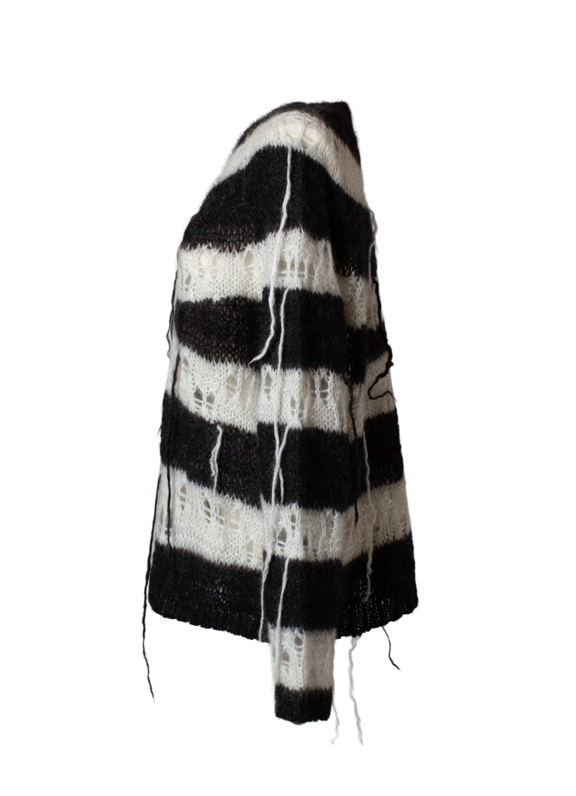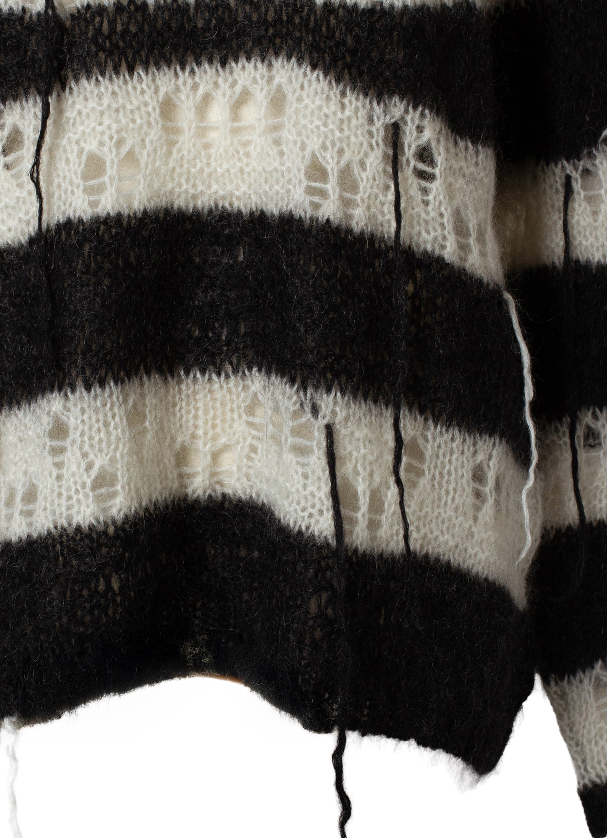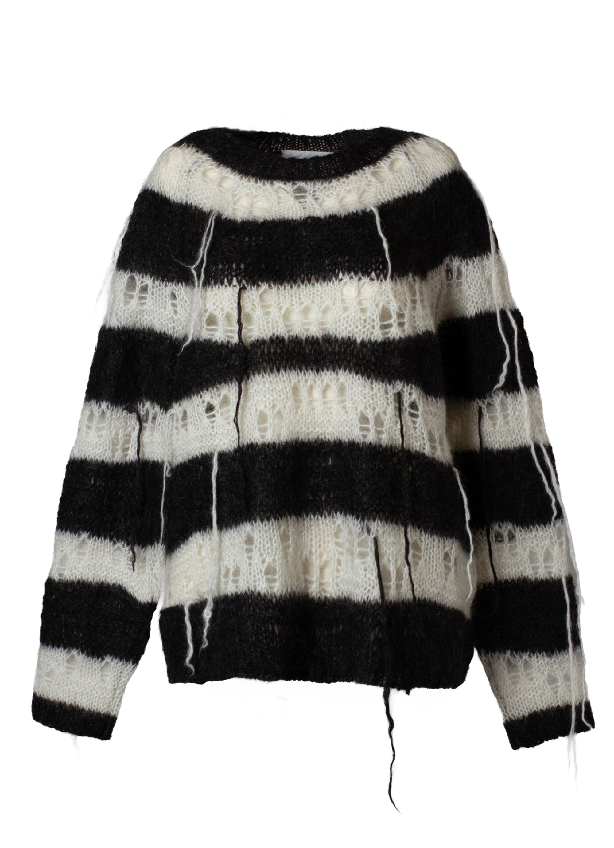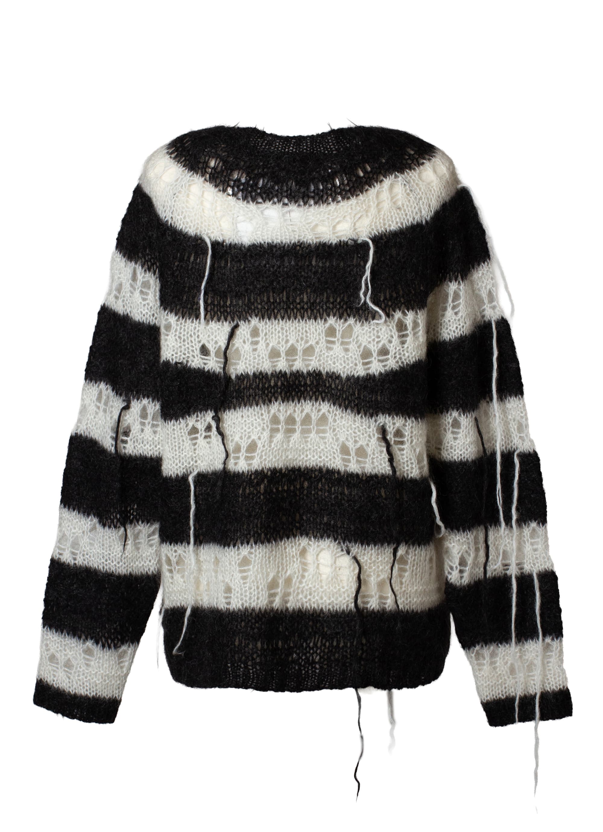 ブラック×ホワイトのボーダー柄に加え、全体に施されたダメージ加工がヴィンテージライクでエッジの効いた印象を演出。ゆったりとしたシルエットでリラックス感がありながらもスタイリングの主役になる存在感を放ちます。