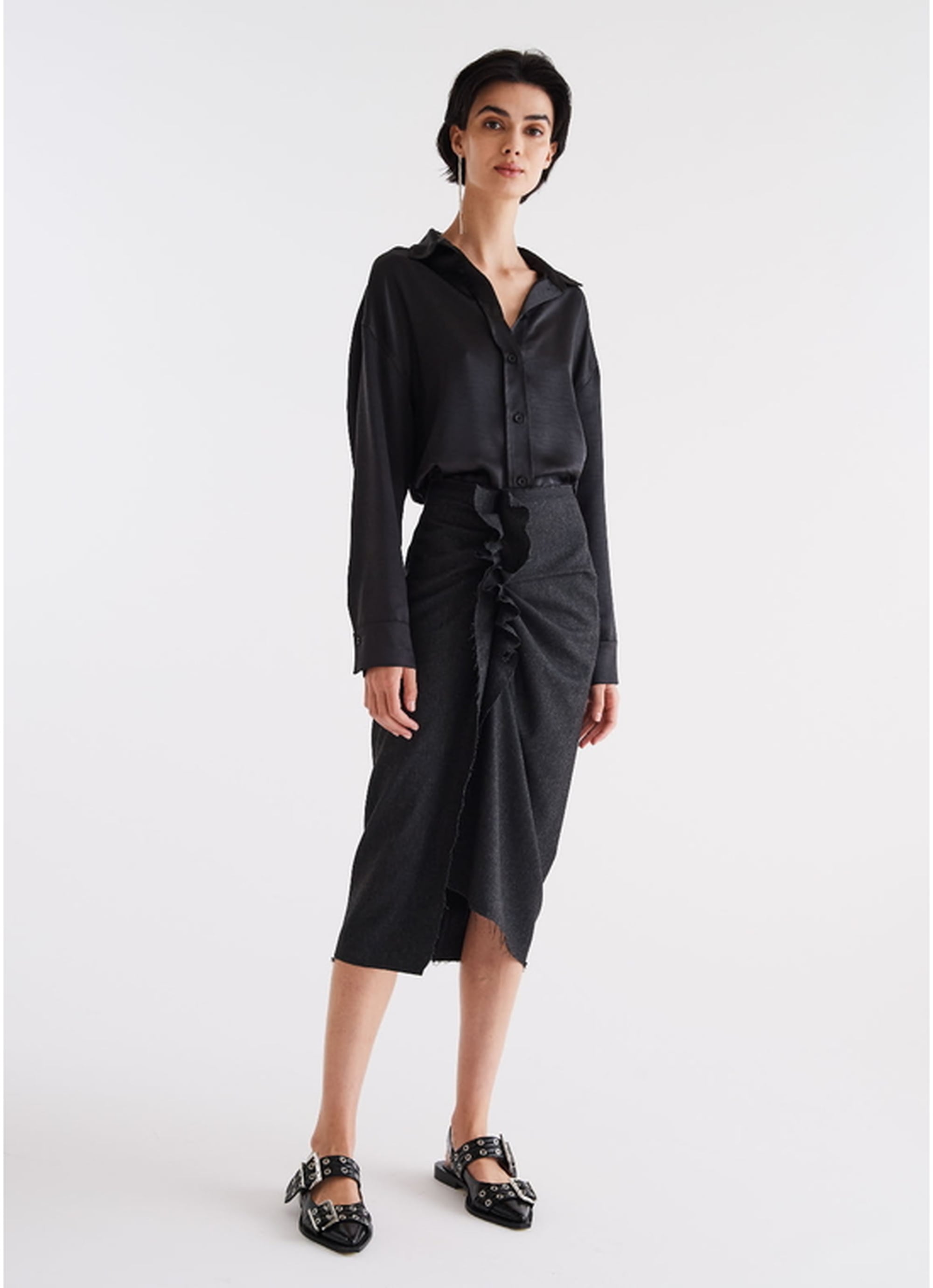 フロントに施されたギャザーが立体感を生み出し、シンプルながらも動きのある表情を演出します。