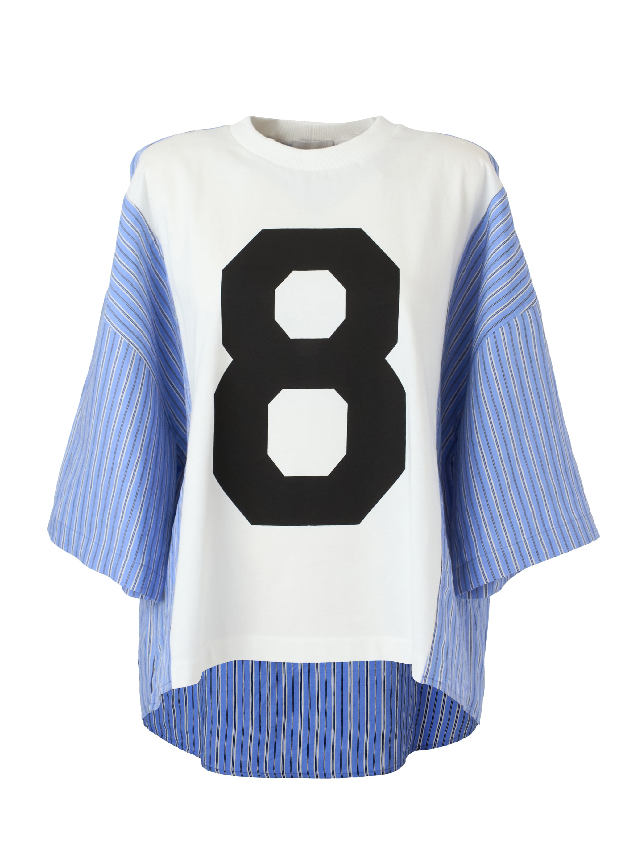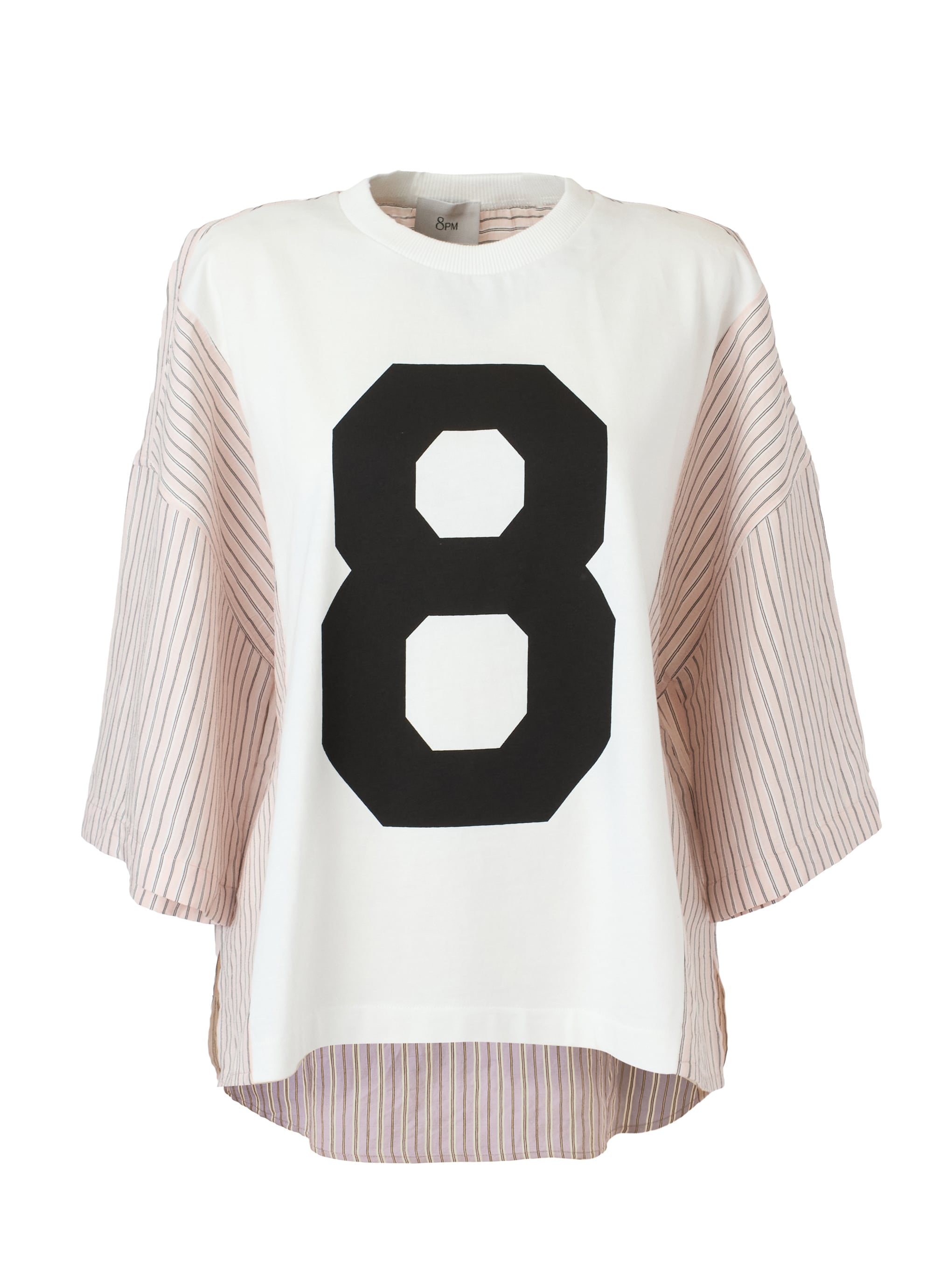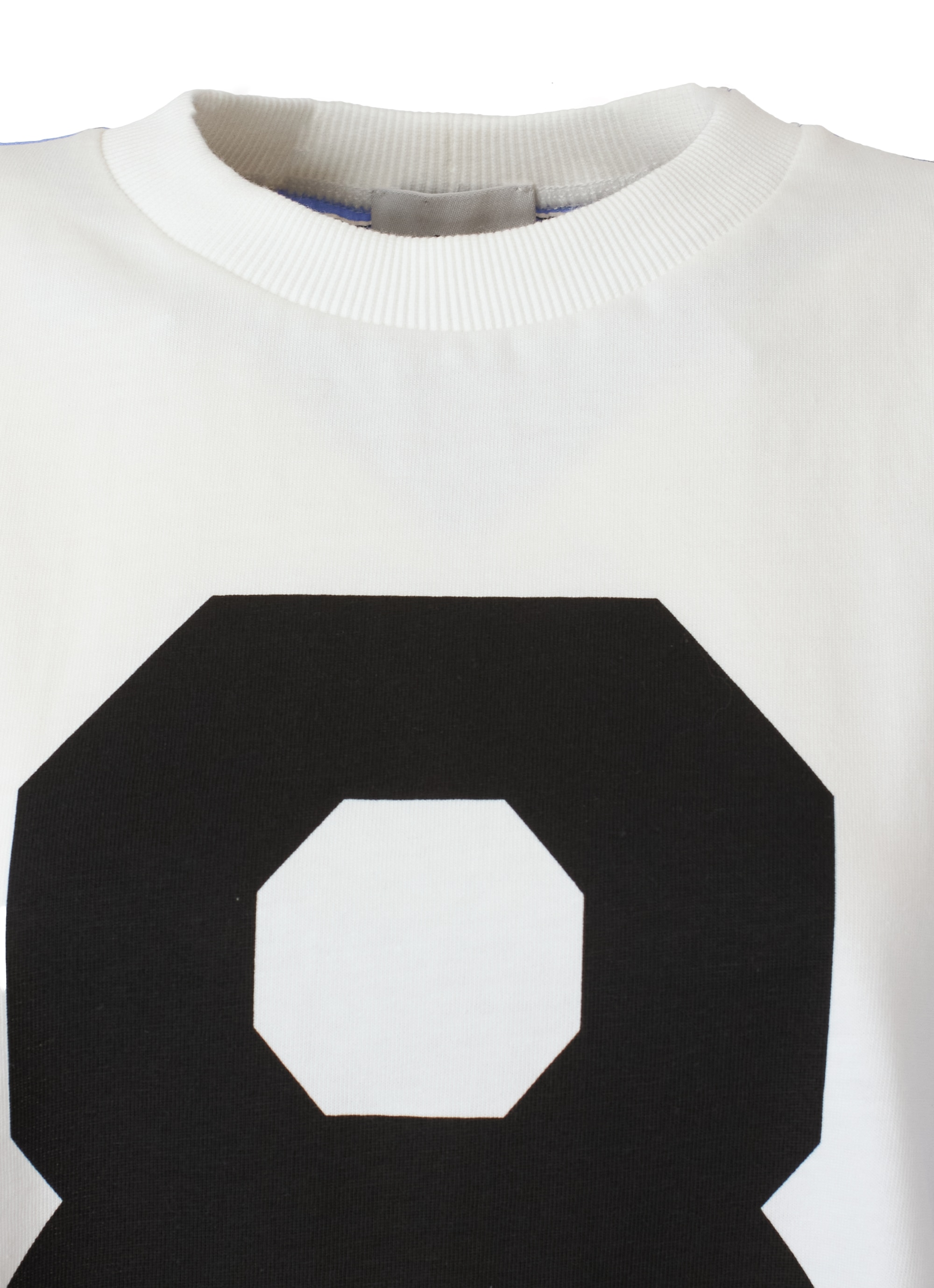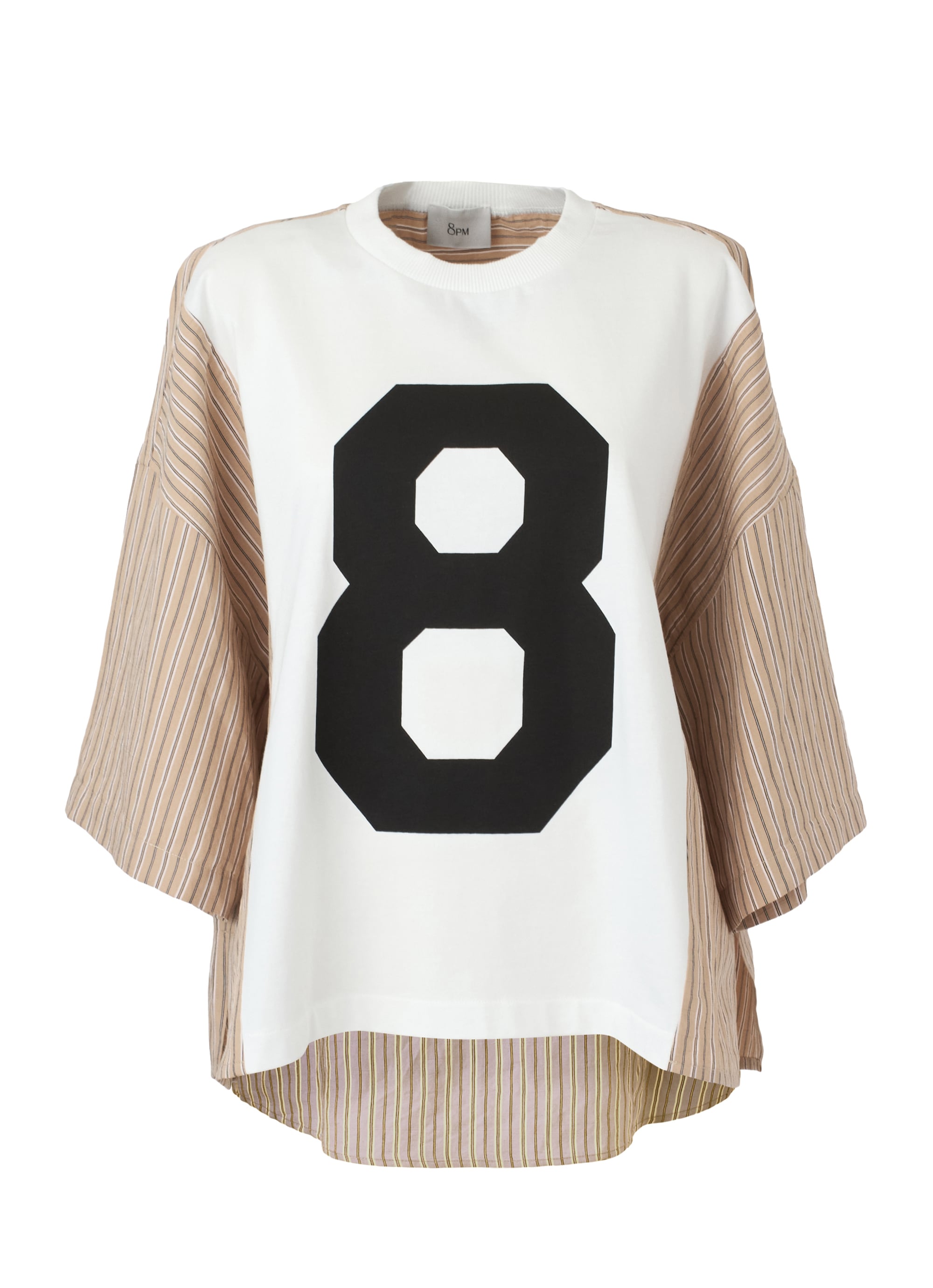 フロント中央に大胆に配置された「8」のプリントが、カジュアルなアクセントとして効いたデザイン。ゆったりとしたシルエットでリラックスした着心地ながら、すっきりとした見え方に整えています。