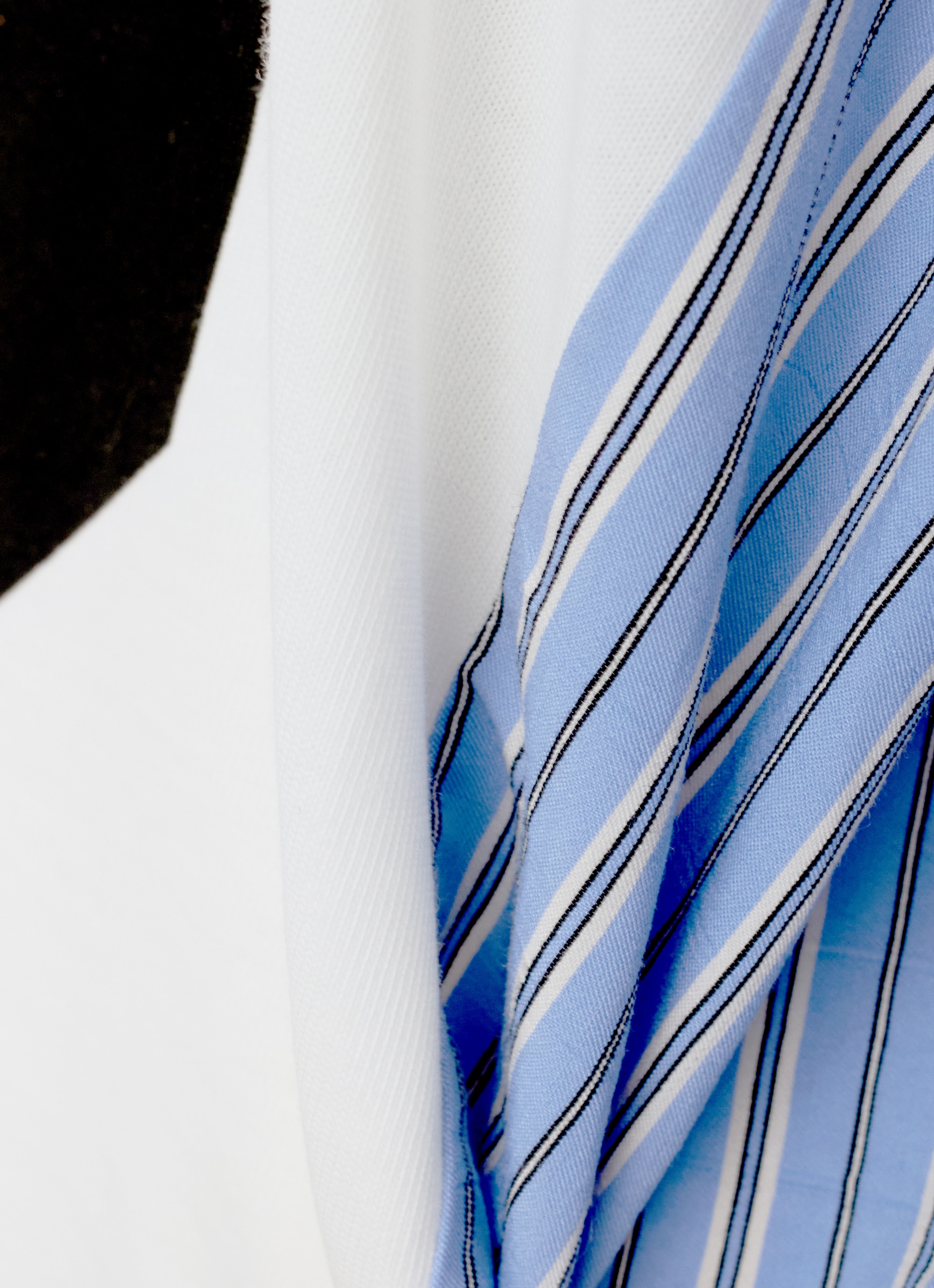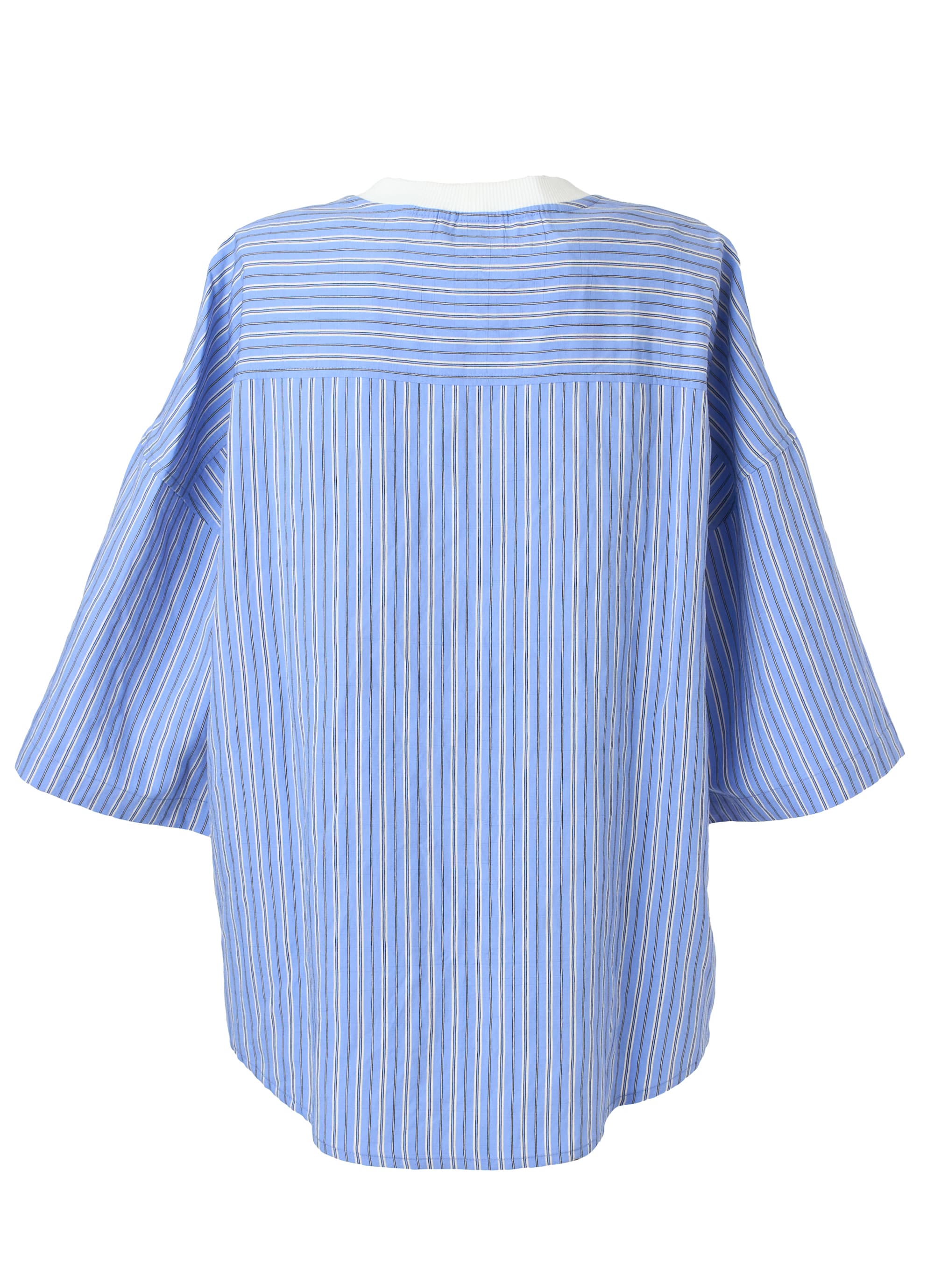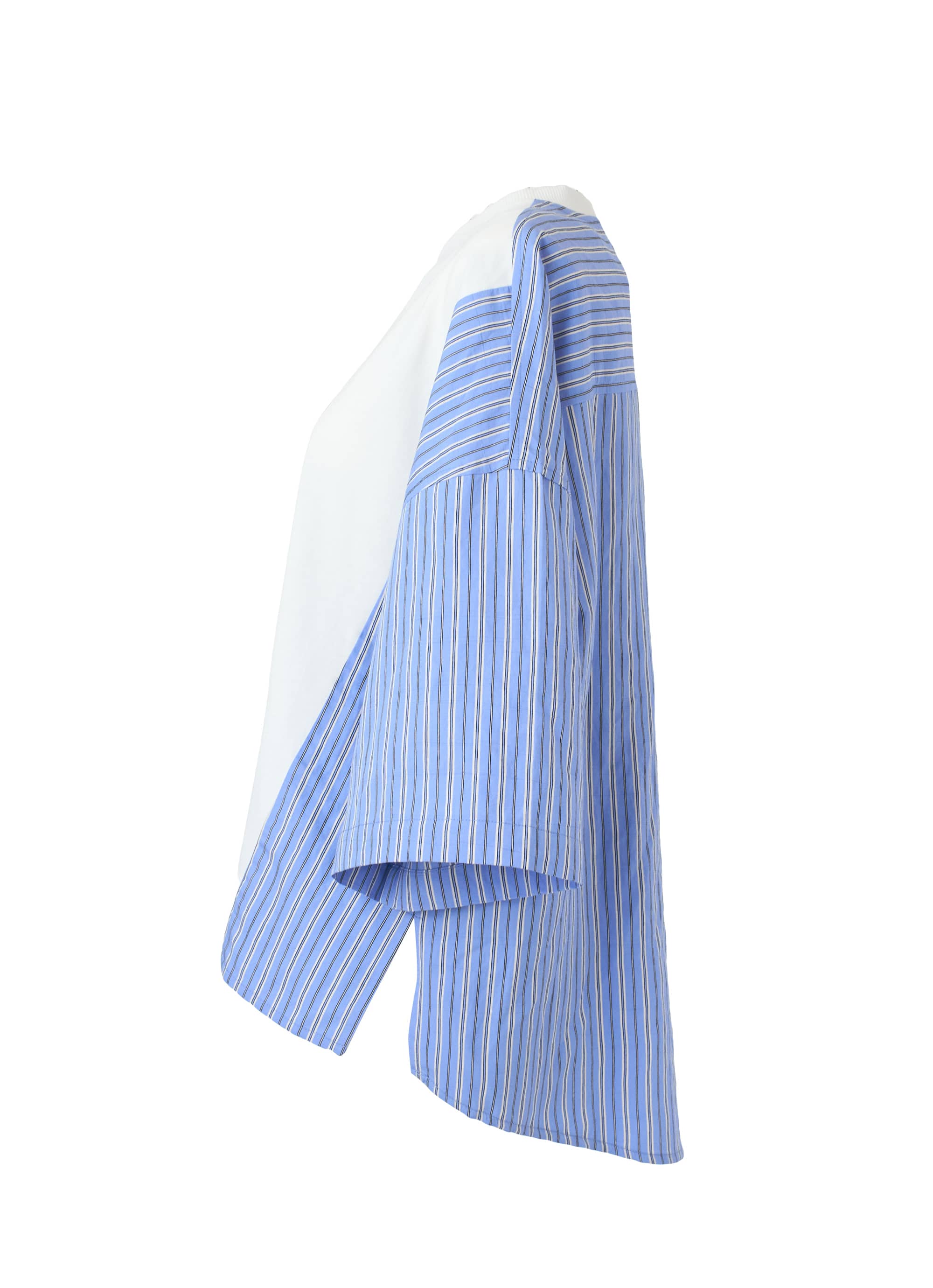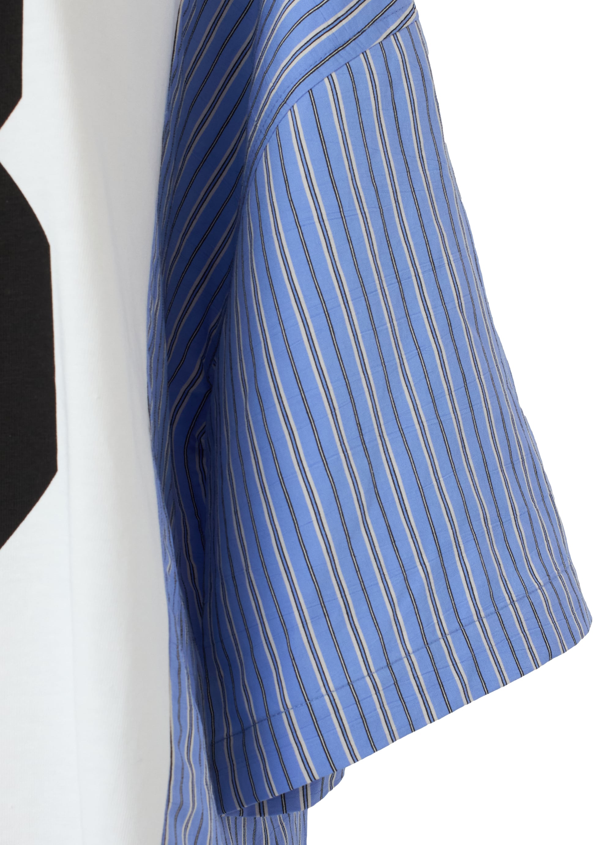 前身頃にはコットンを使用し、袖と後身頃にはレーヨン混のストライプ素材を切り替えたレイヤードデザイントップ。