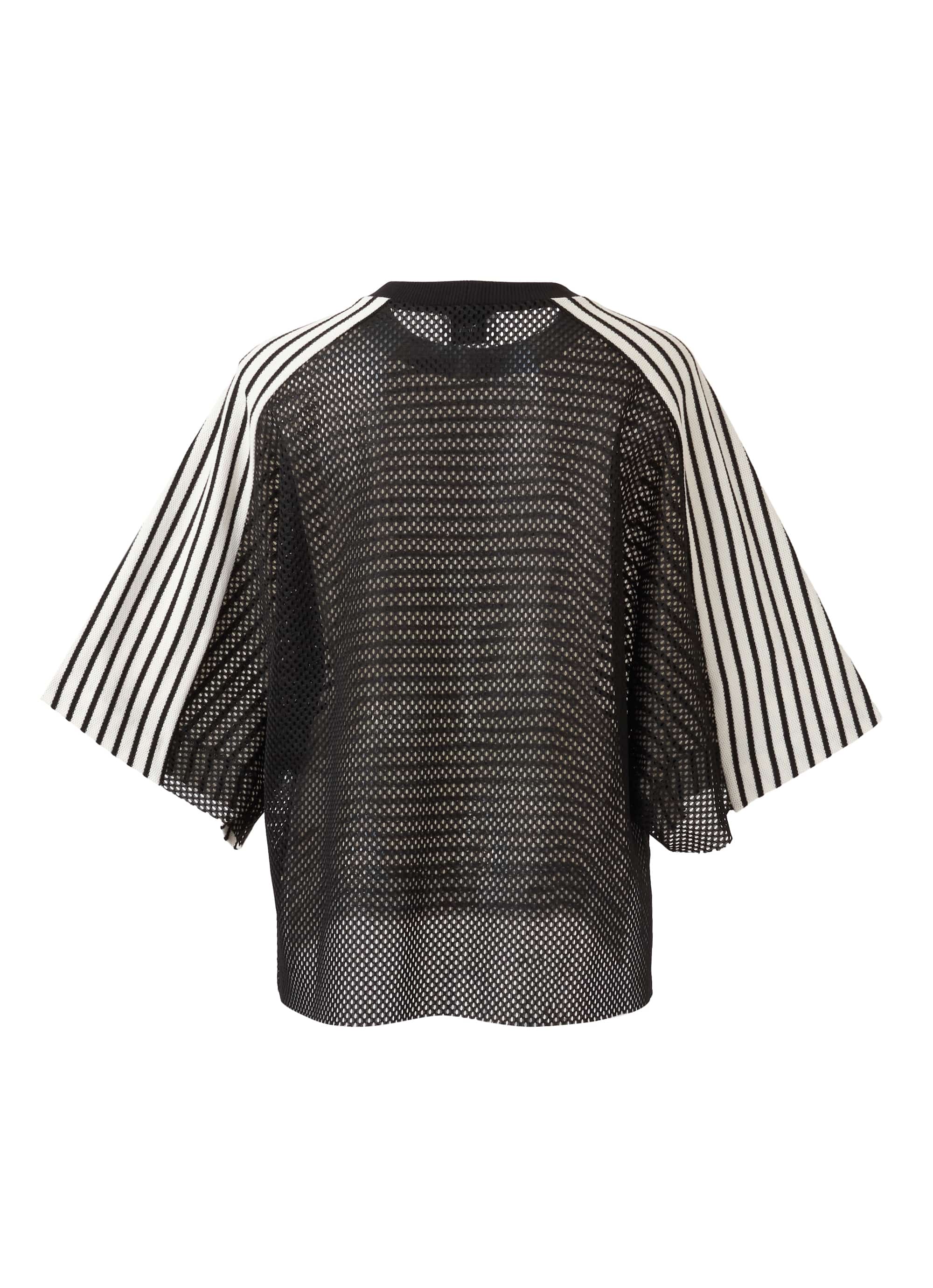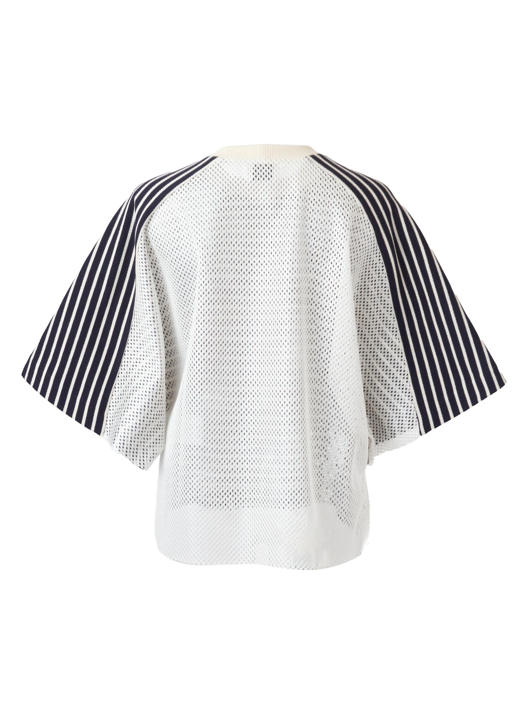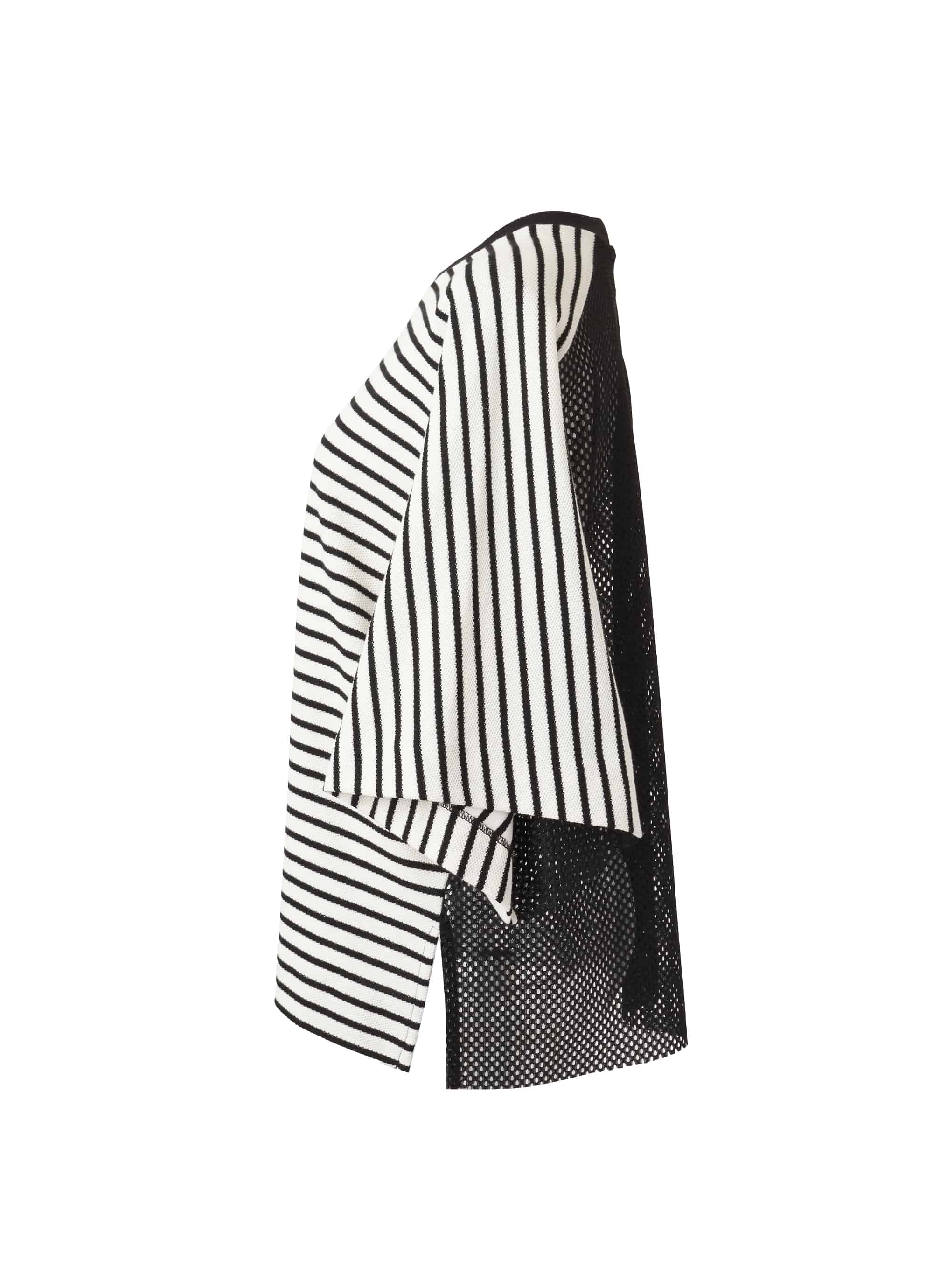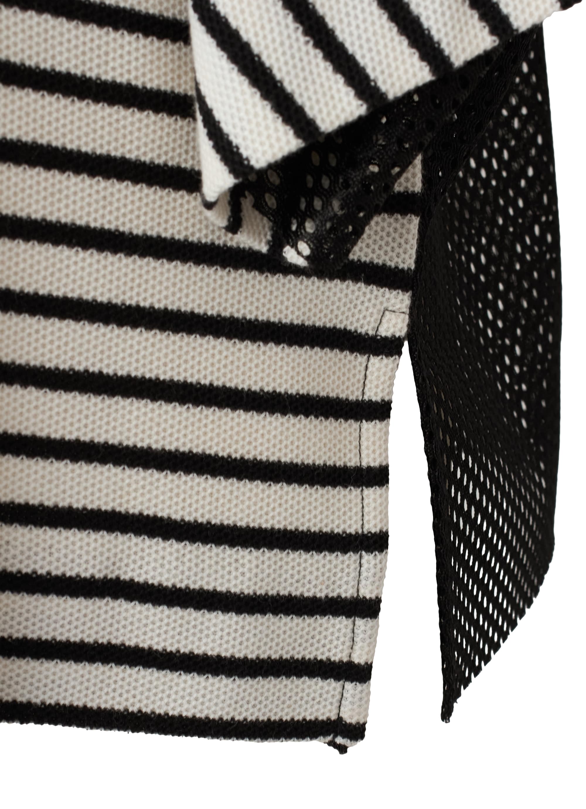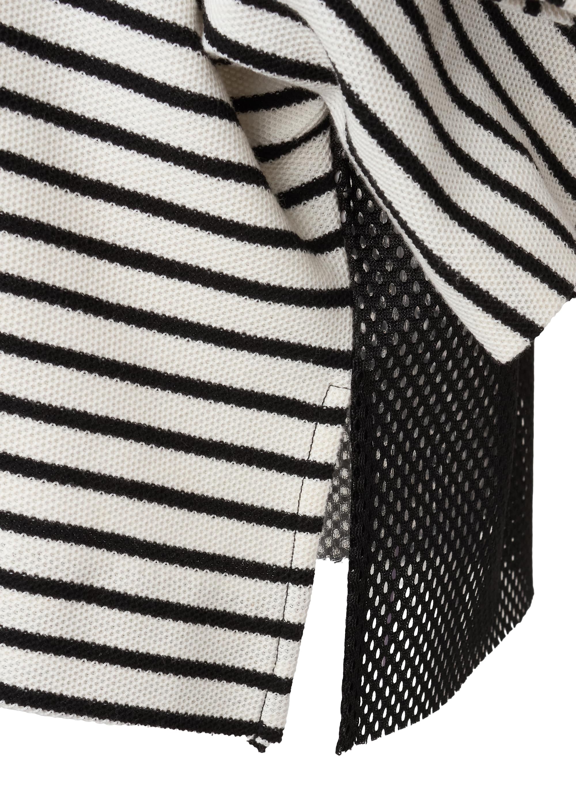 前身頃には綿ベースの柔らかなボーダー素材、後身頃には軽量で通気性の良いメッシュ素材を組み合わせたコンビデザイントップ。