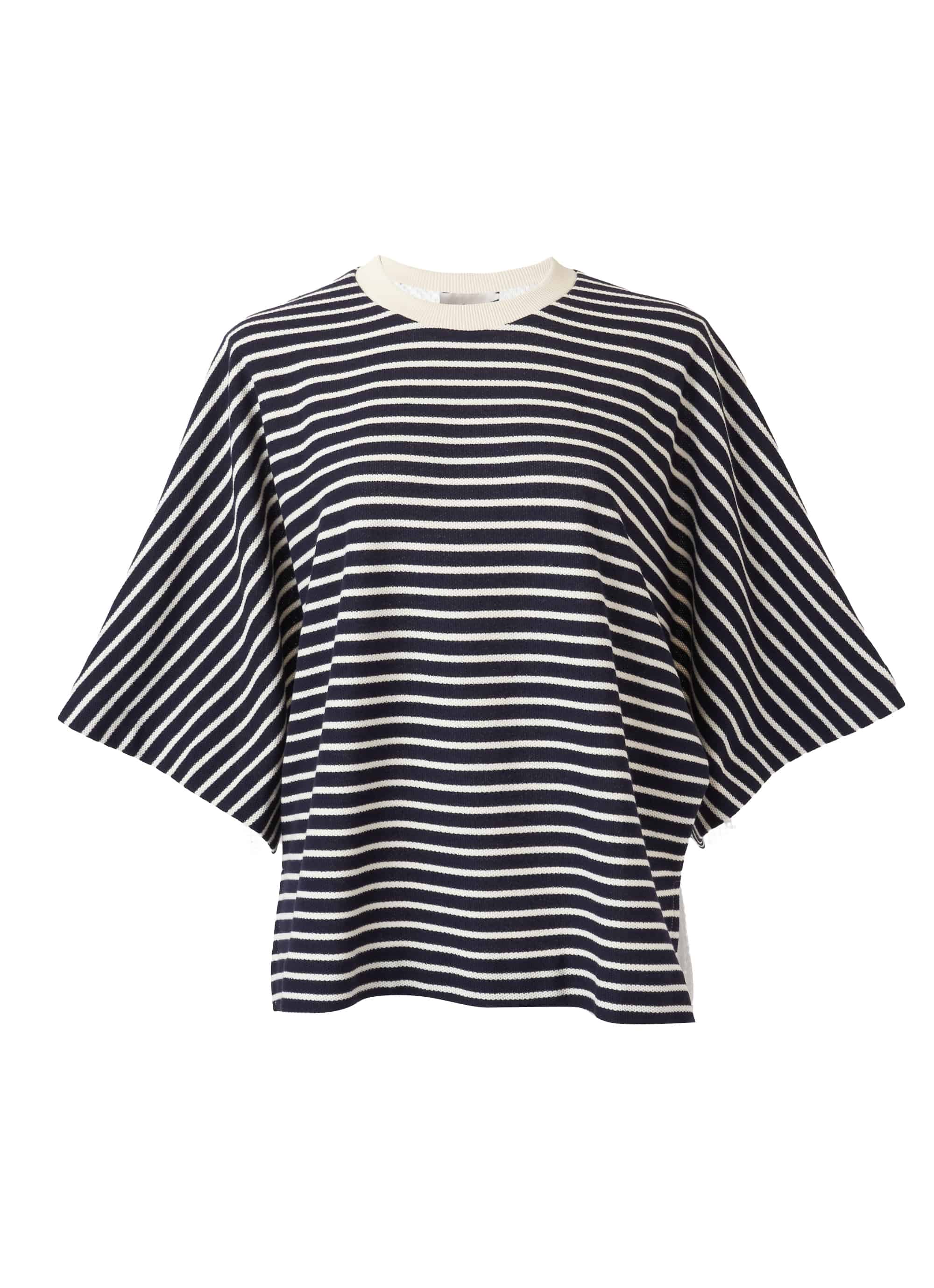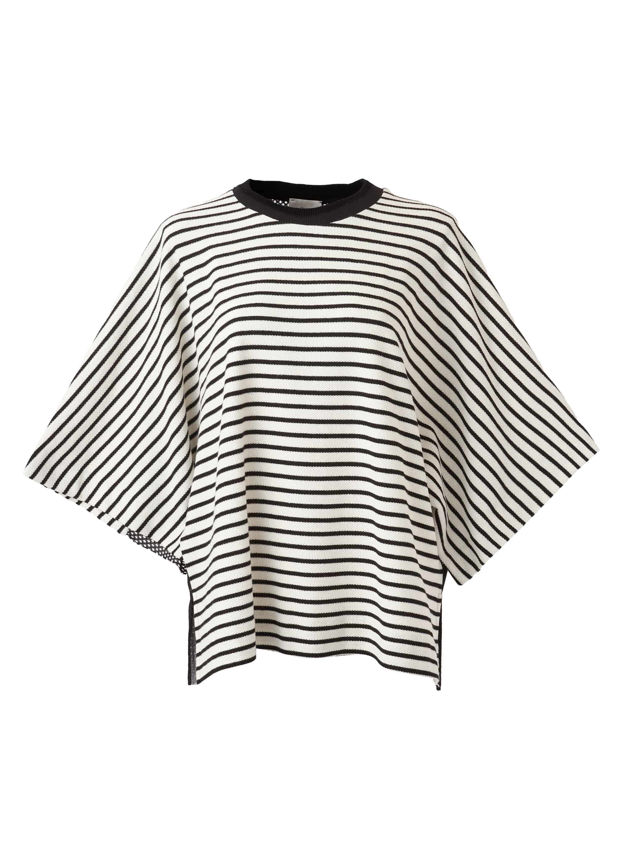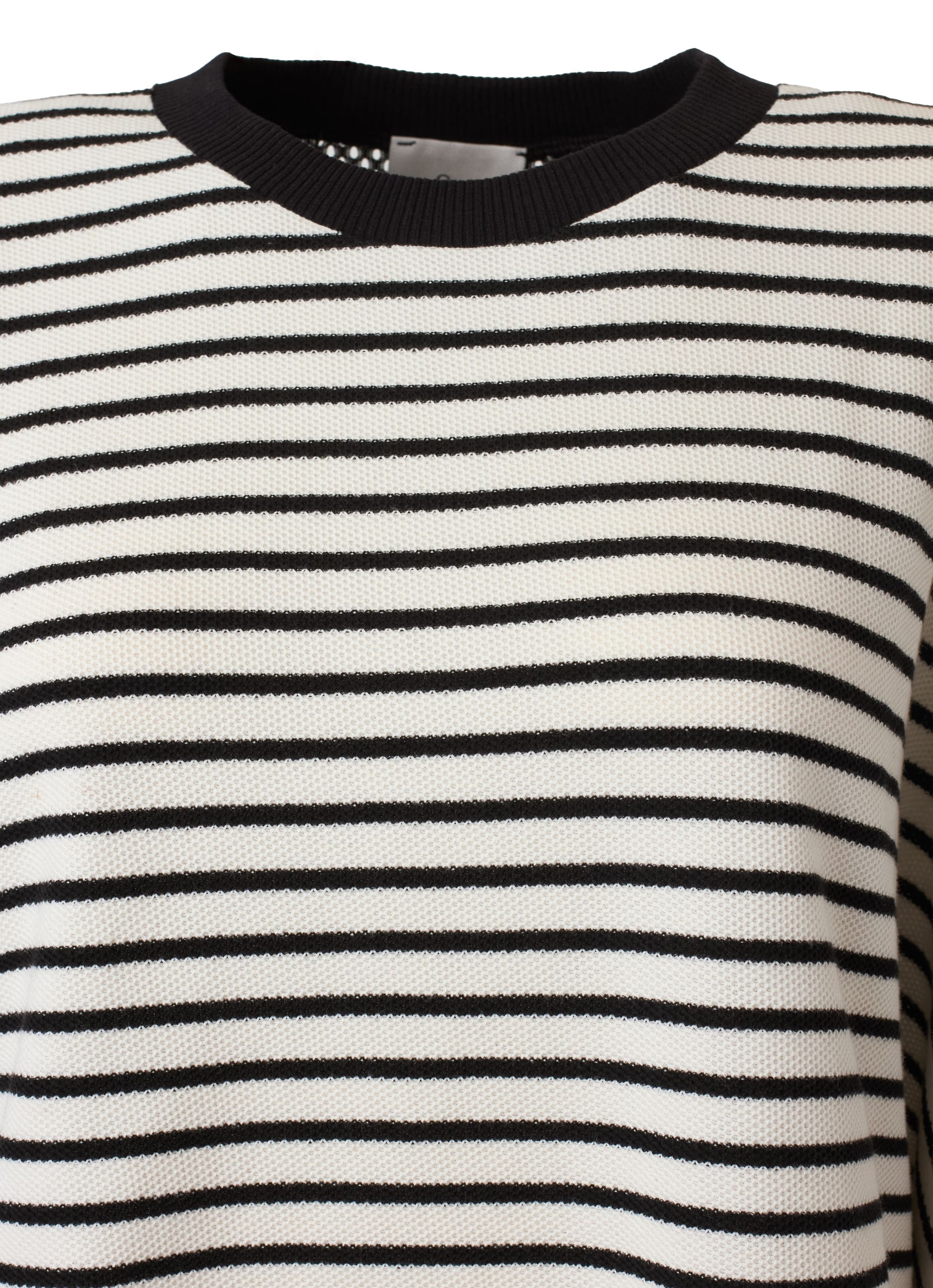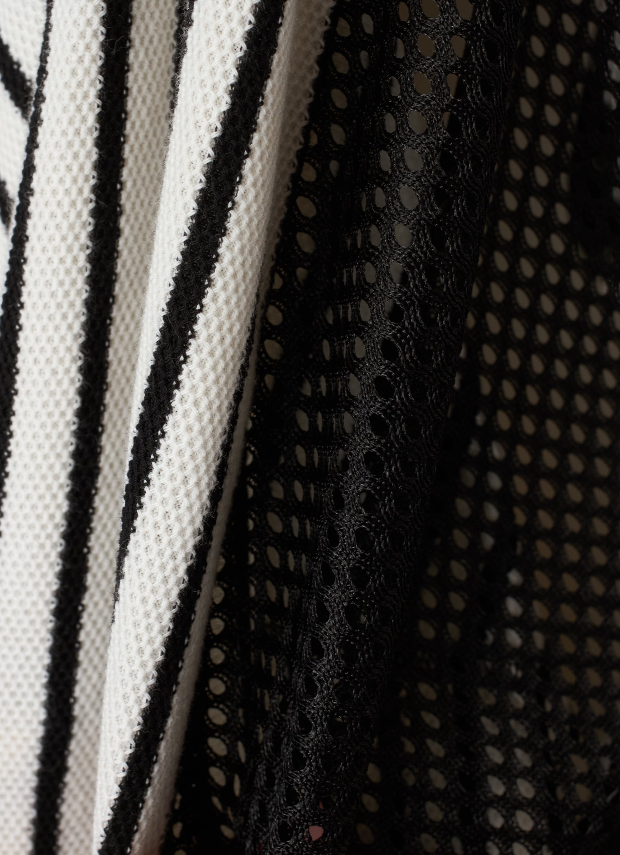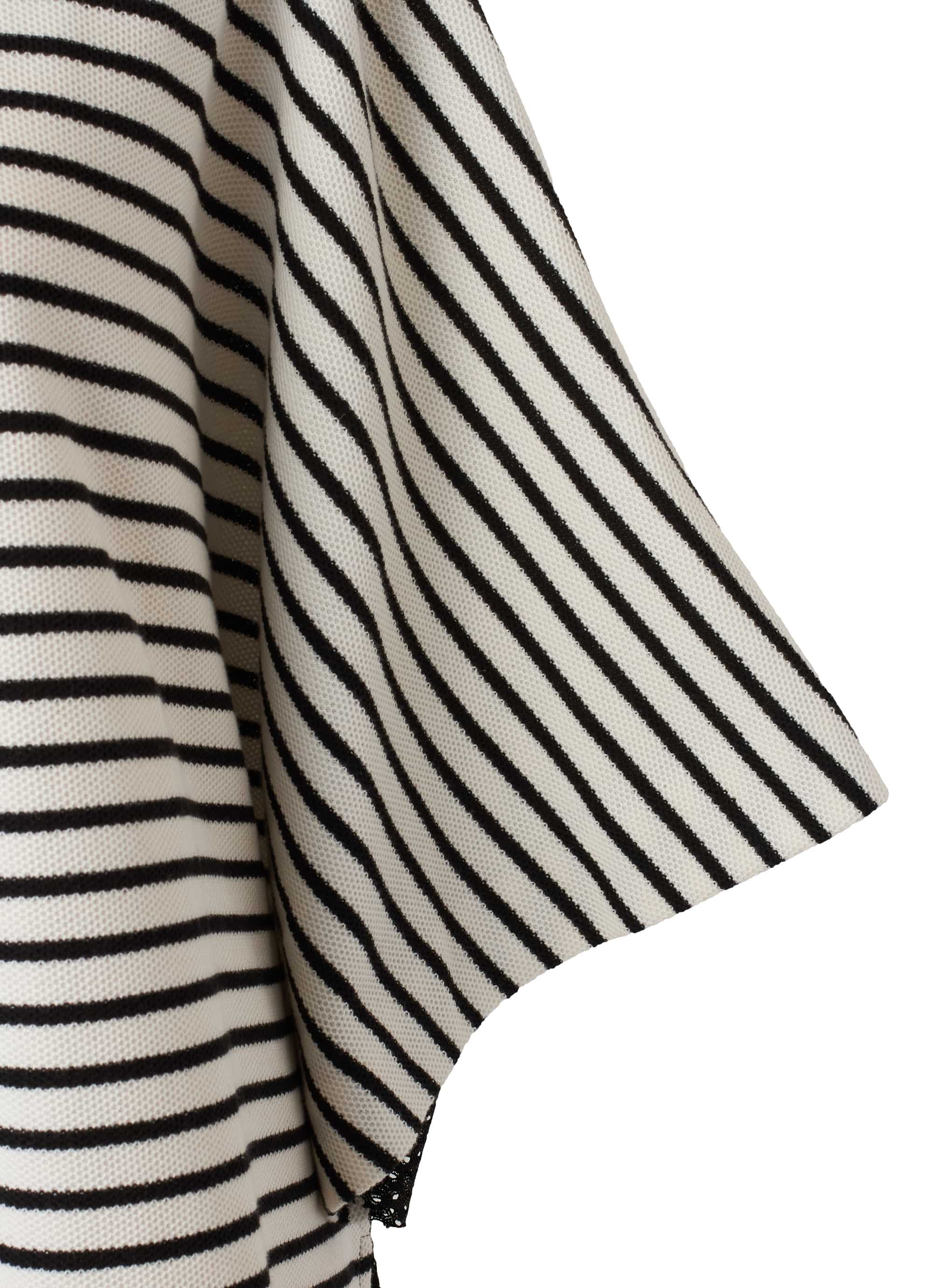 前身頃には綿ベースの柔らかなボーダー素材、後身頃には軽量で通気性の良いメッシュ素材を組み合わせたコンビデザイントップ。