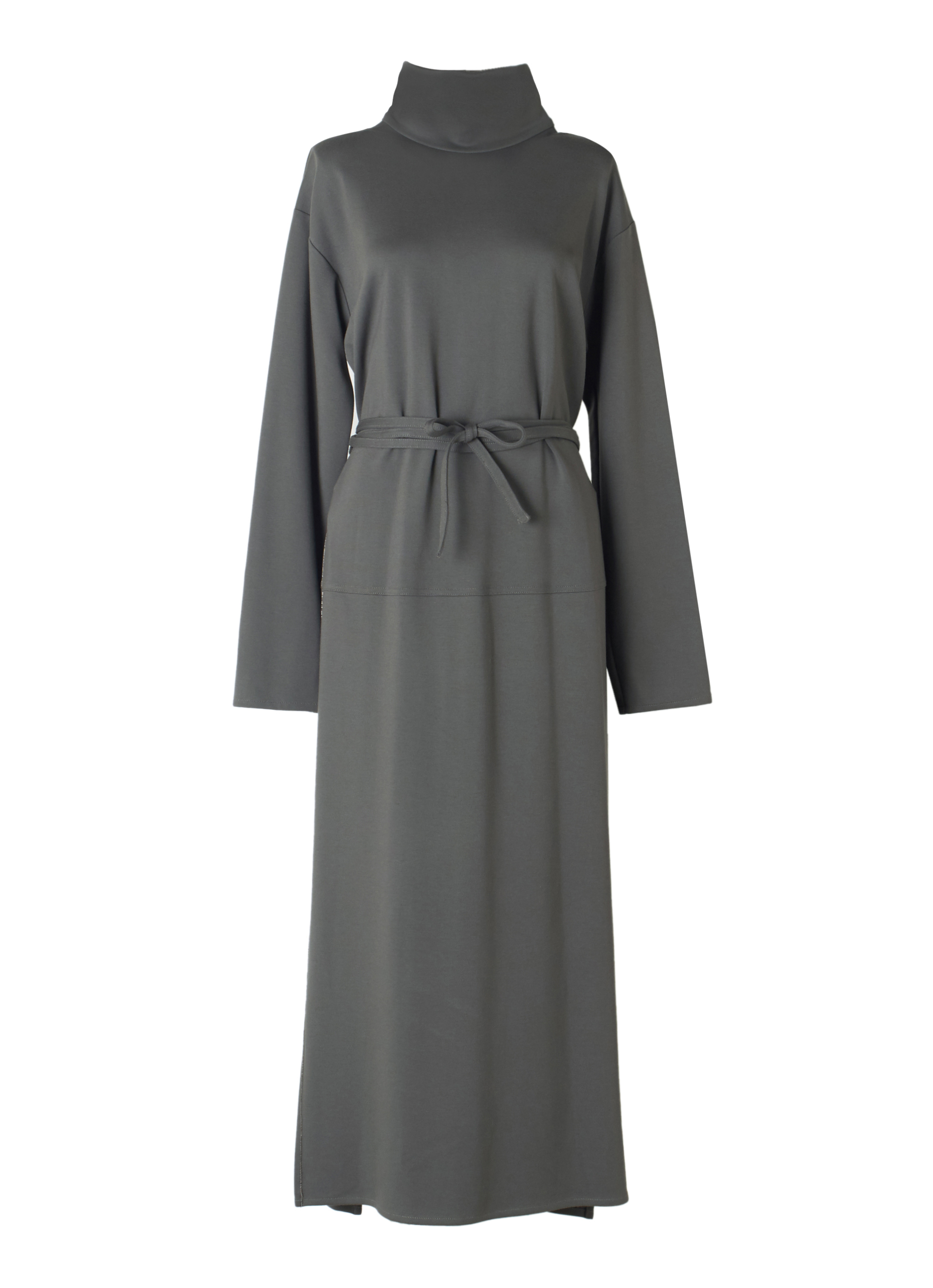 柔らかさとコンパクトさが際立つストレッチ・レーヨンのミラノステッチ・ジャージー製ワンピースドレス。長袖でハイネックという禁欲的なデザインと、サイドに大胆に入ったスリットとのコントラストが効いた一枚。インナーに印象的なレギンスやチュールスカートを合わせてと、着こなしの幅が広がるアイテムです。
