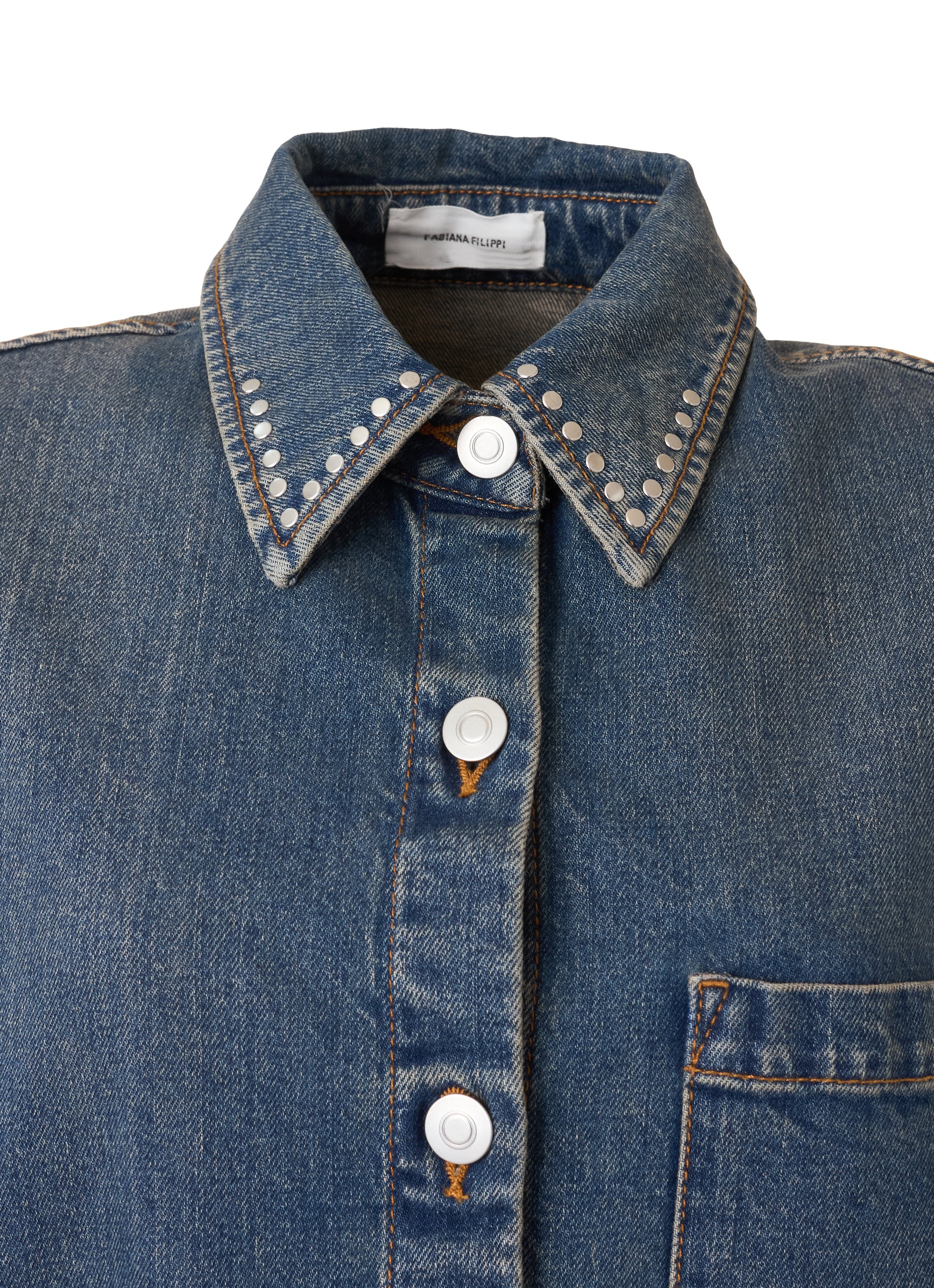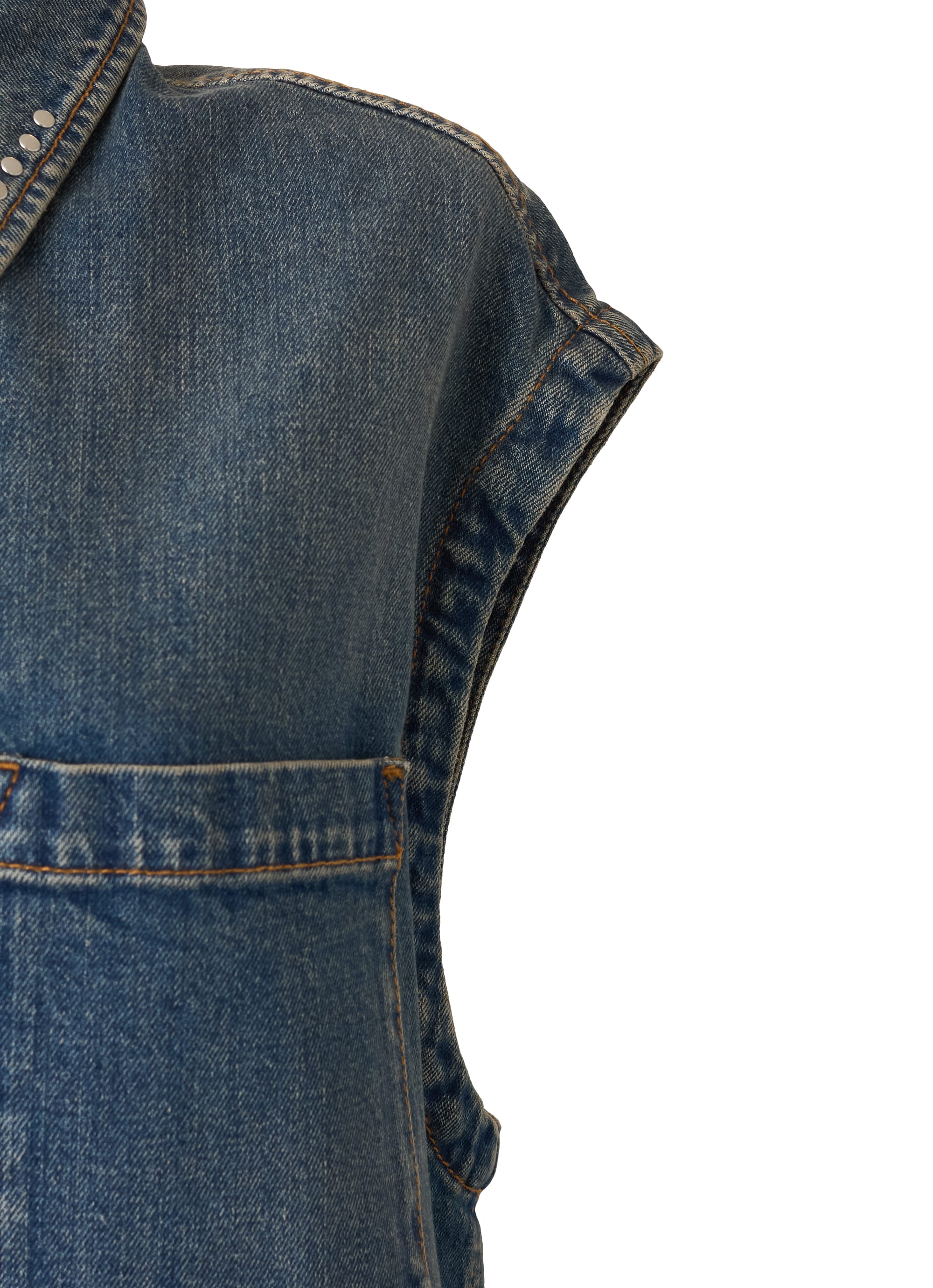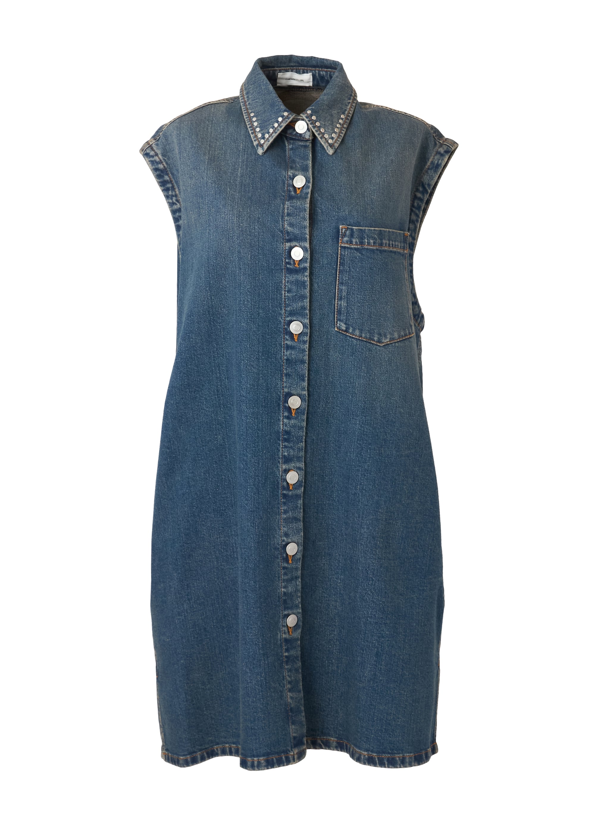 衿元にリベットを打ち込んだ、カジュアルなスタイルのデニムショートドレス。