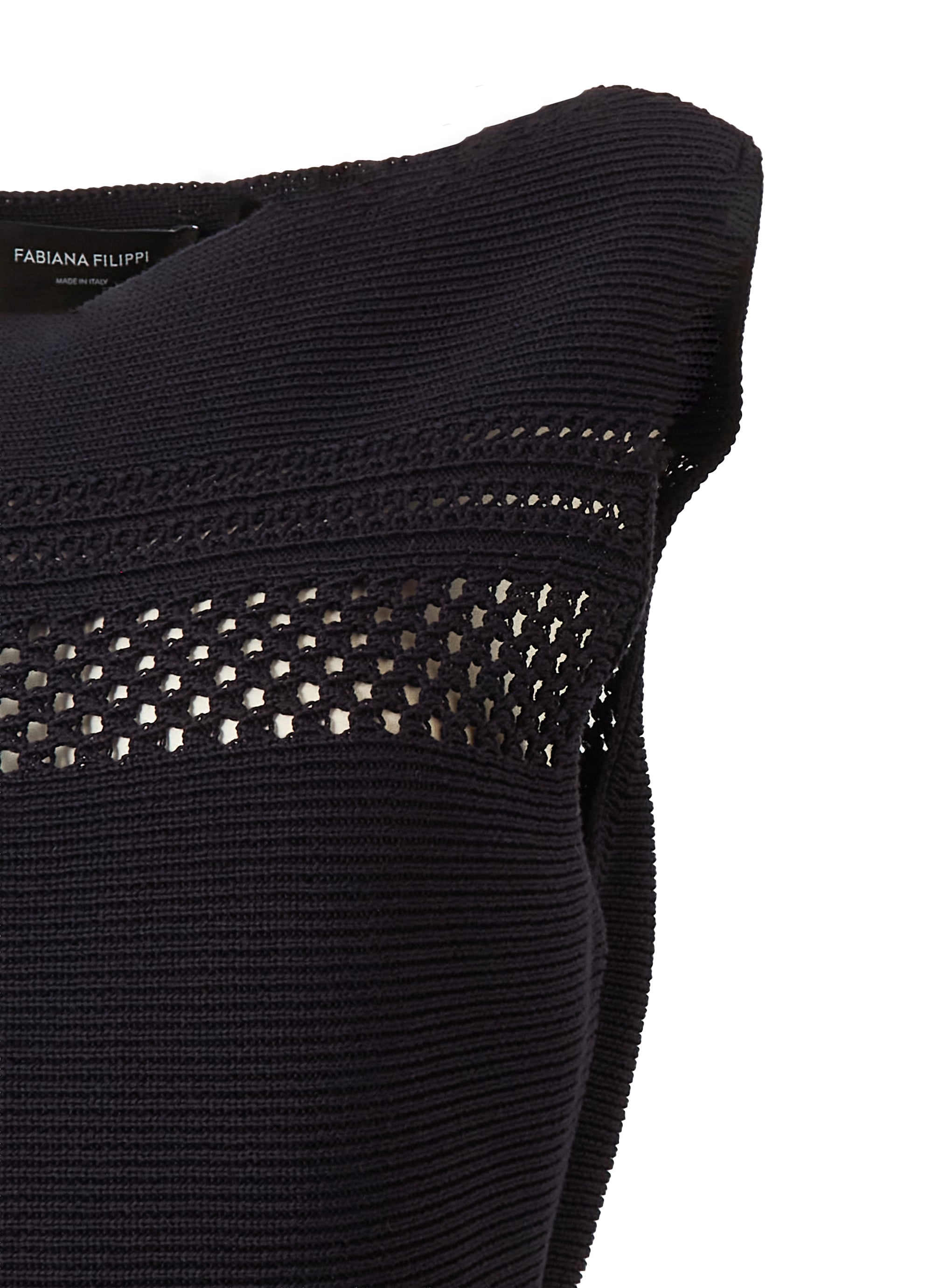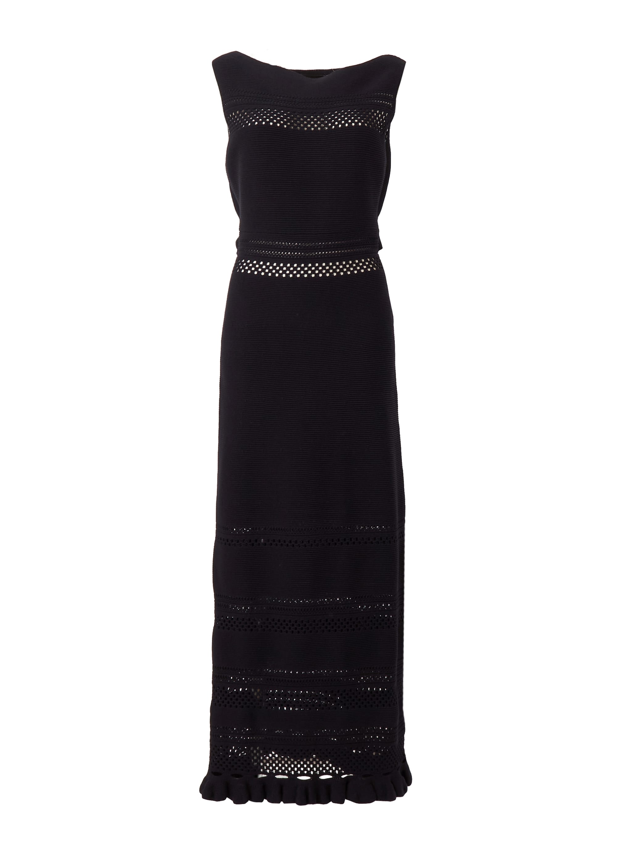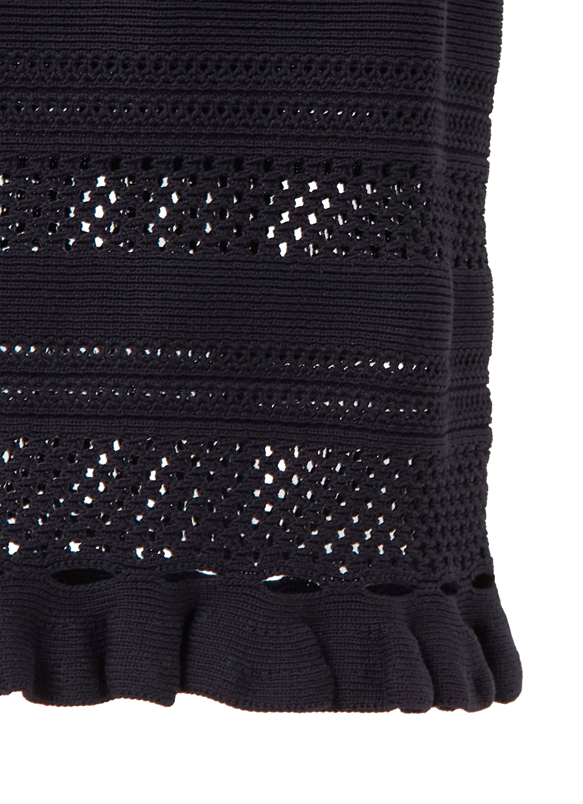 胸元、ウエスト、裾に配された透かし編みが清涼感のあるスタイリングを演出します。