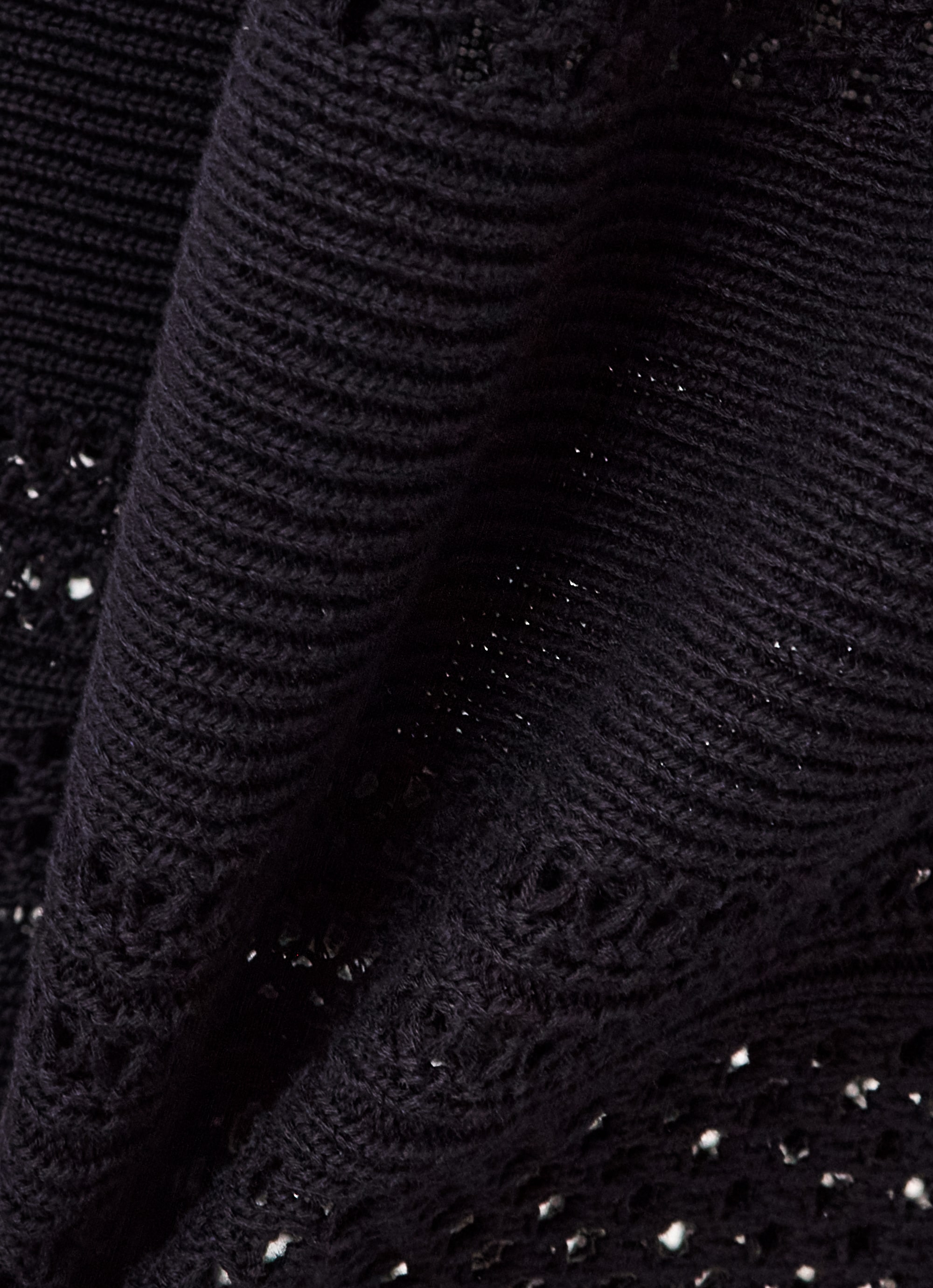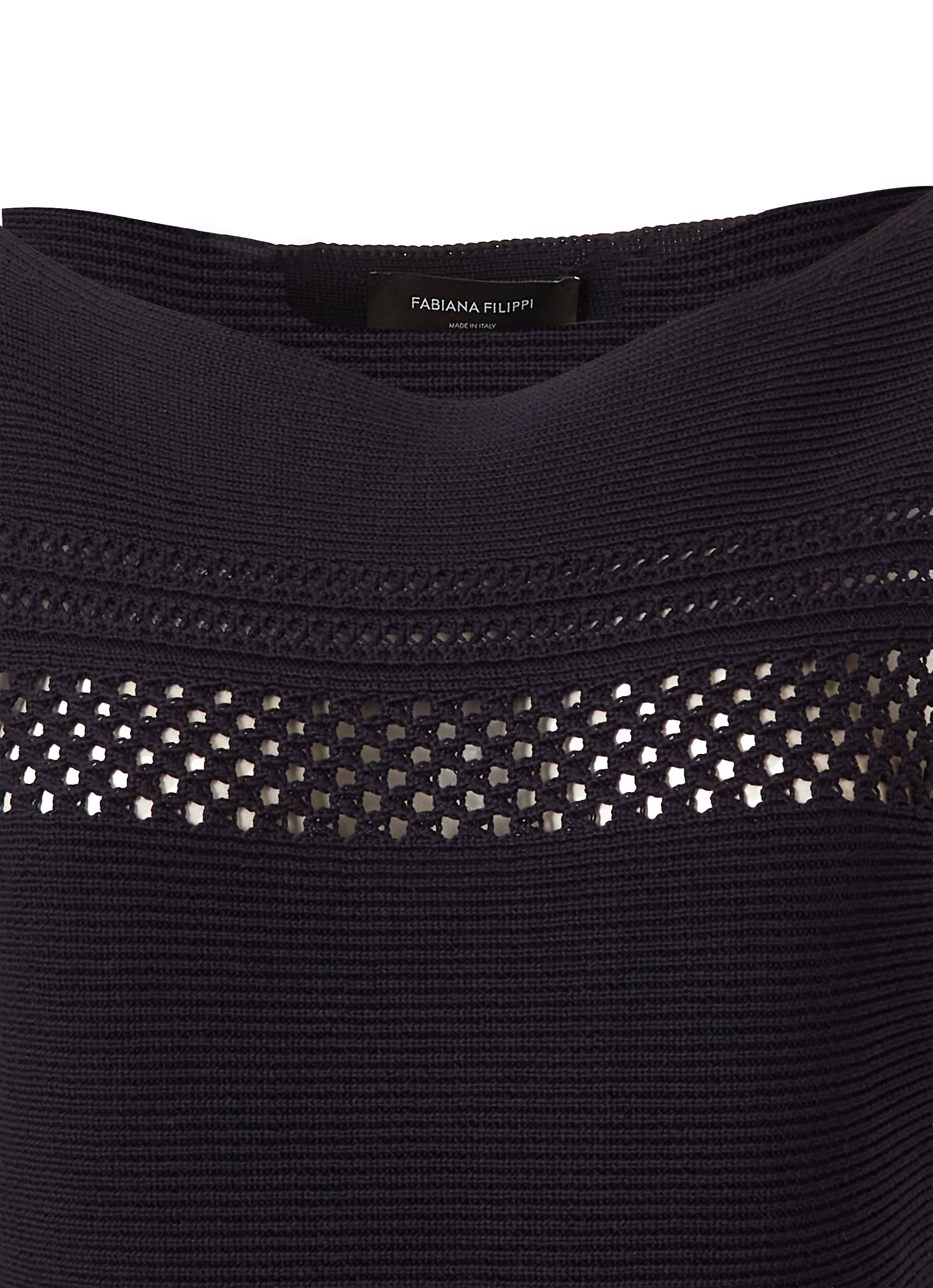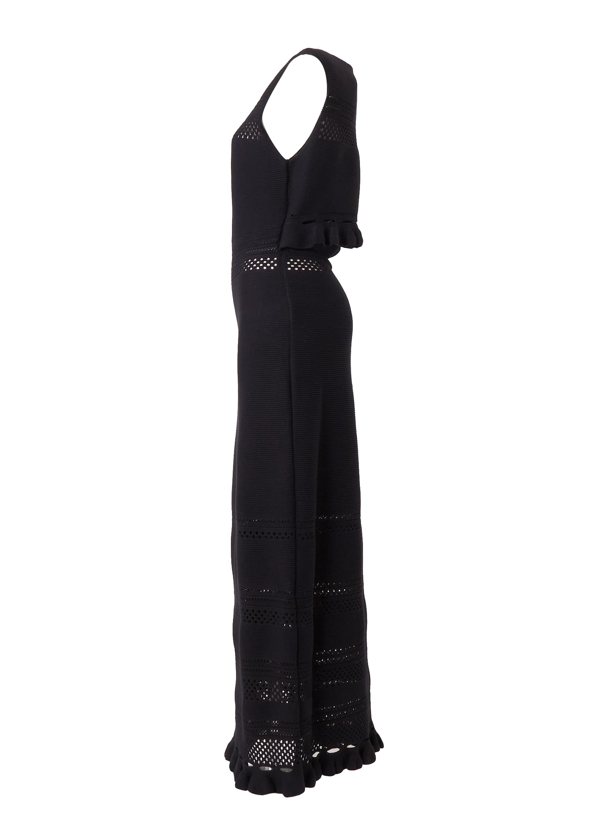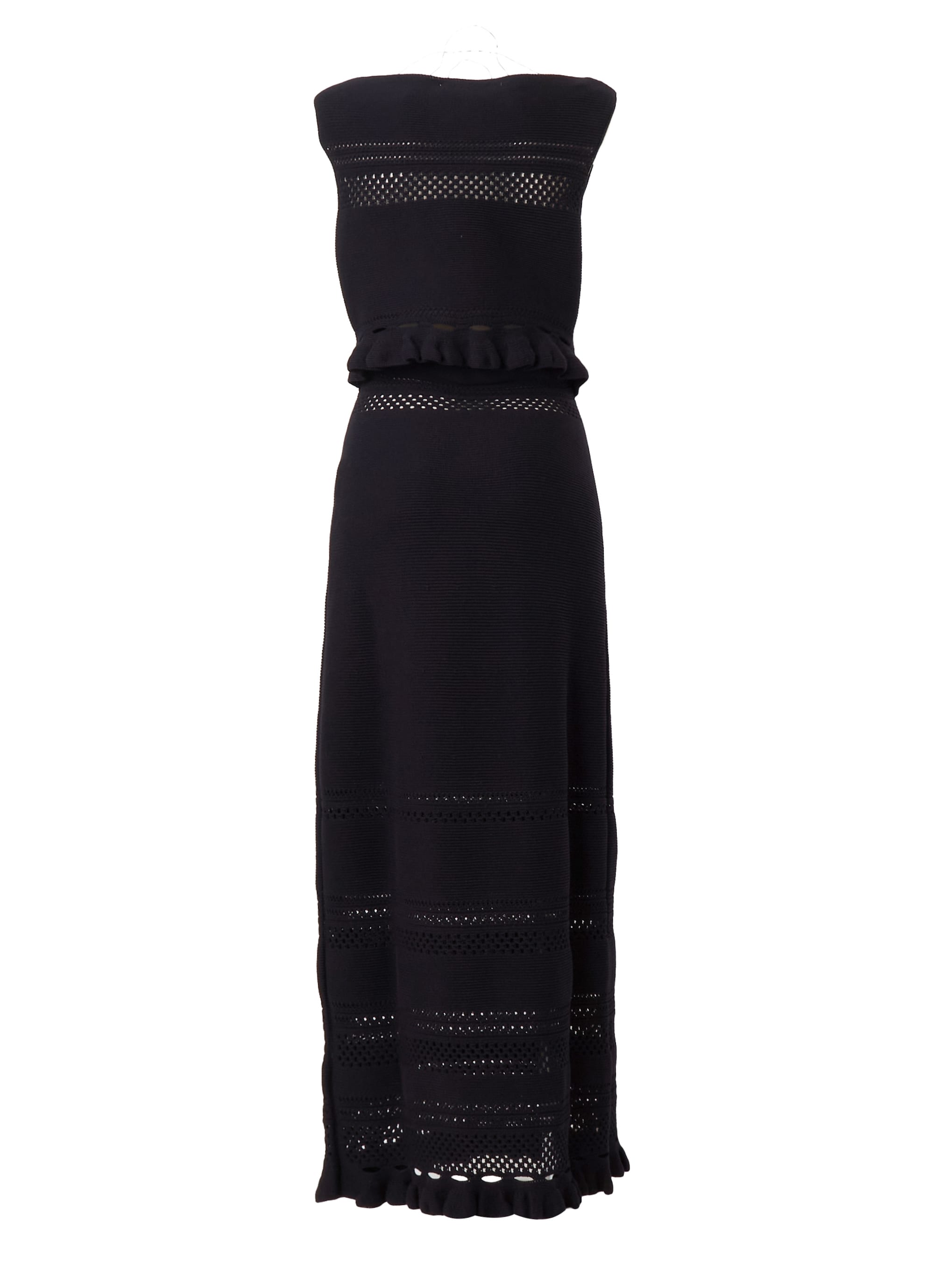 胸元、ウエスト、裾に配された透かし編みが清涼感のあるスタイリングを演出します。