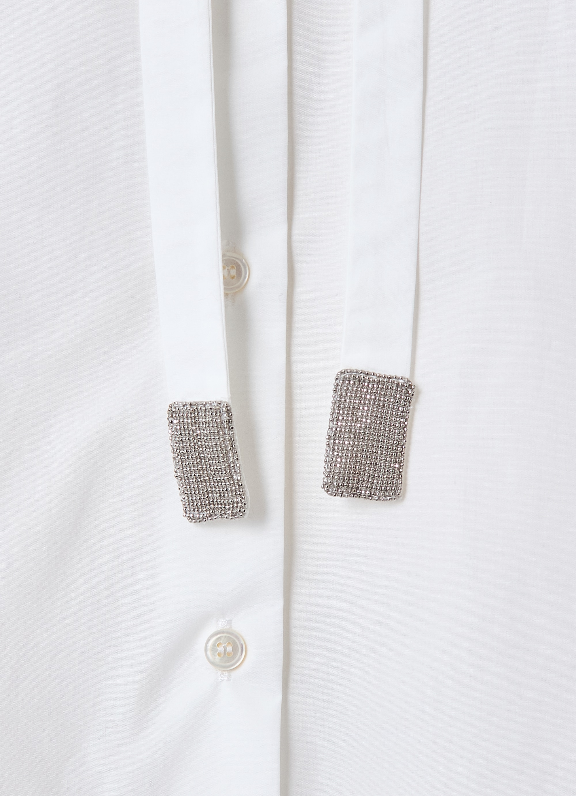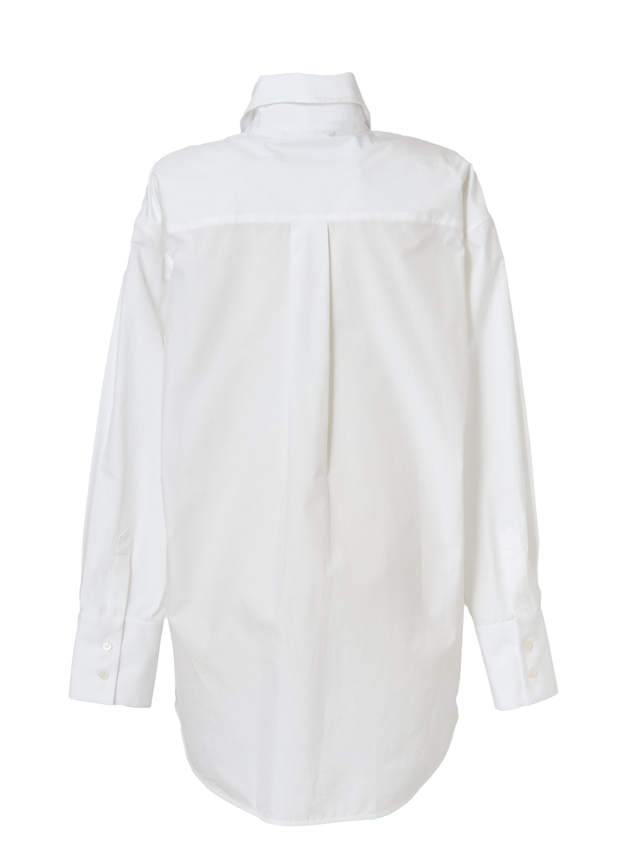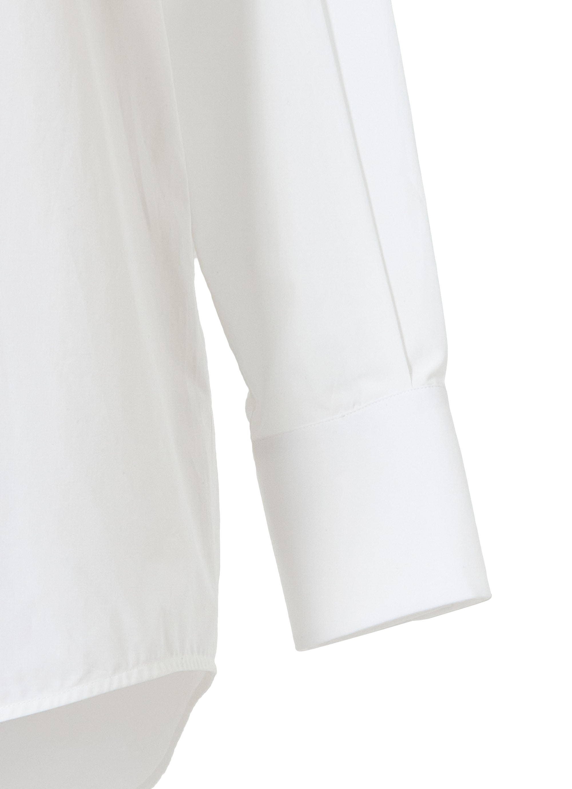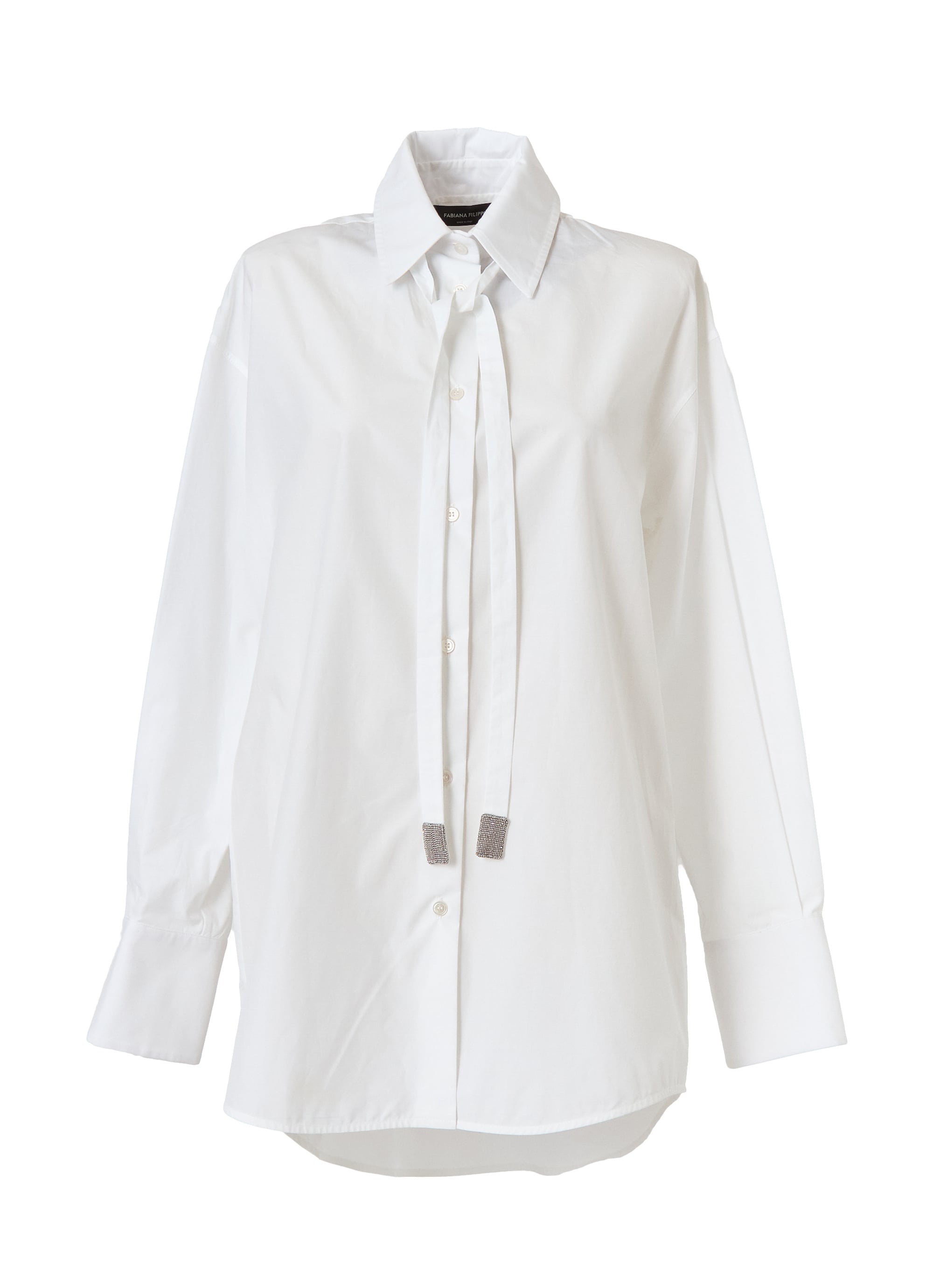 さらりとした肌触りのコットン素材で、季節を問わず快適に着用できる一枚です。シンプルでスタンダードなシャツカラーのデザインに、衿元のボウタイが上品なアクセントに。リボンにはボールチェーンの装飾をあしらい、さりげないきらめきが顔まわりを明るく引き立てます。きちんと感のあるルックスは、オフィススタイルにはもちろん、デニムなどと合わせたカジュアルな着こなしにも好相性。結び方次第で印象の変化も楽しめる、着回し力の高いブラウスです。