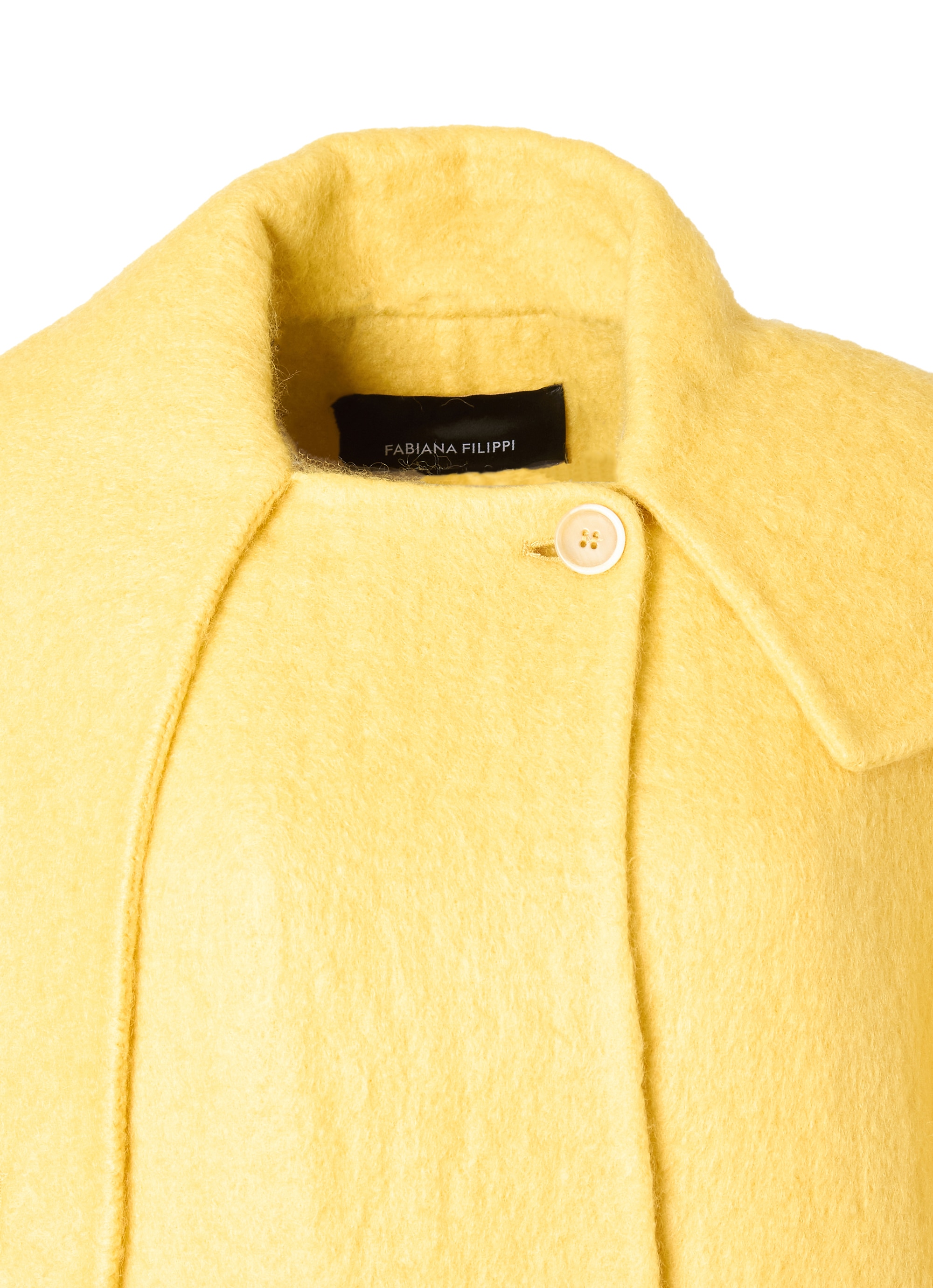 マフラー状の大きなスタンドカラーが特徴的なハーフコート。