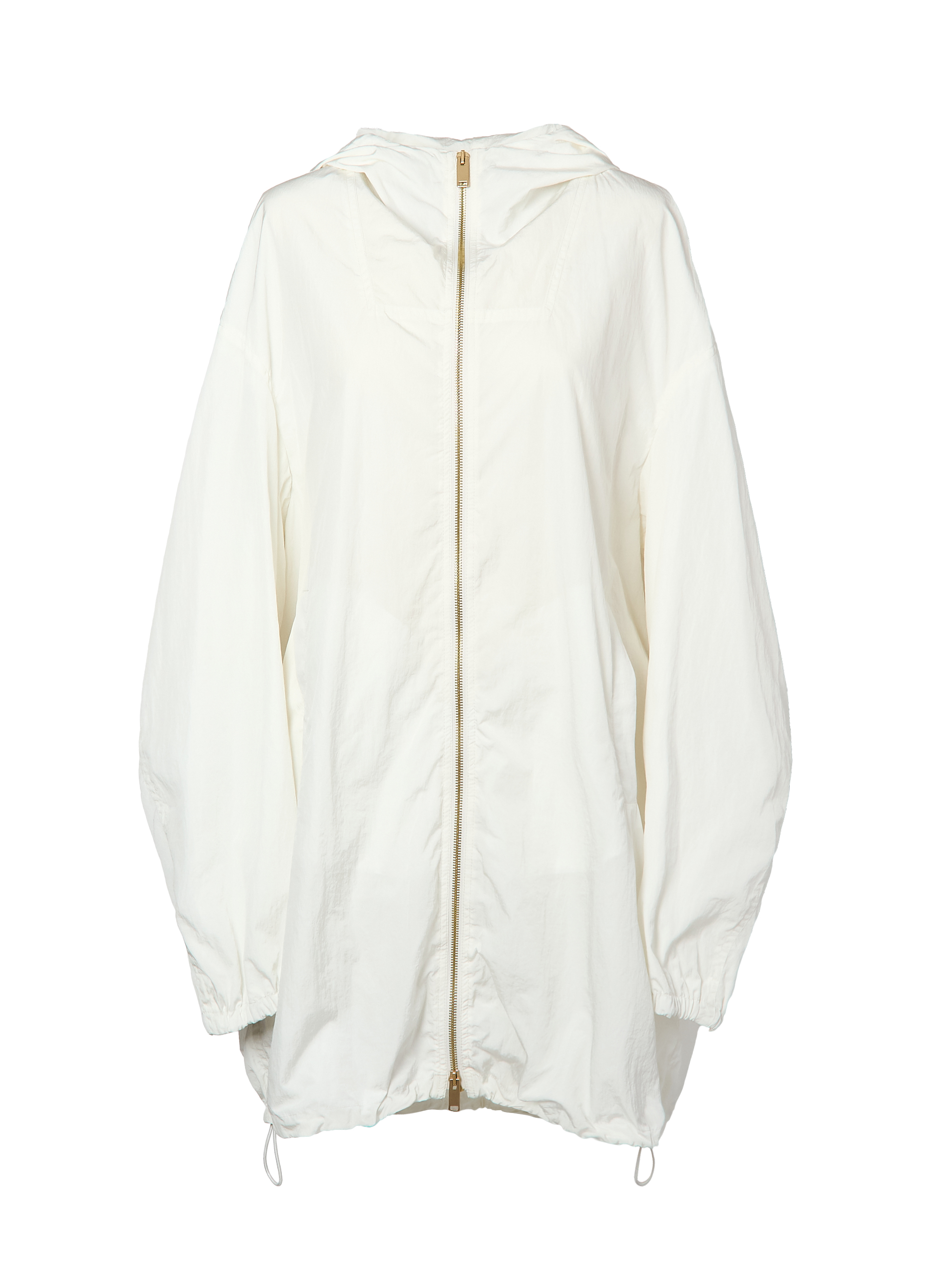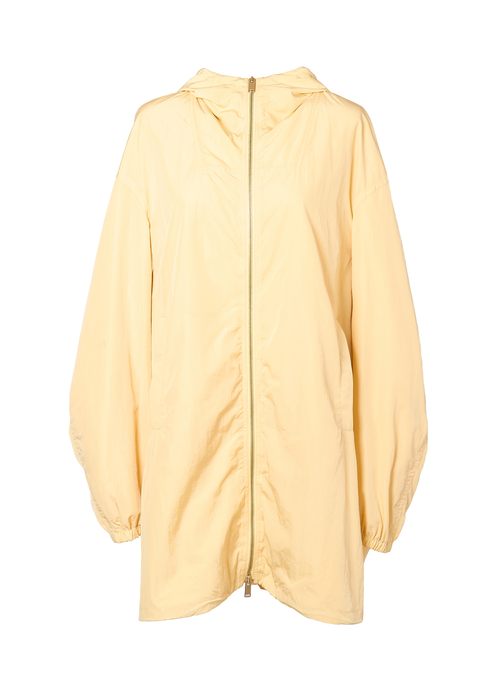耐水性のフード付きナイロンショートコート。海洋や繊維会社から出る廃棄物から作られた再生ナイロンを使用したサステイナブルな生地。リンクル加工がスポーティなデザインにニュアンスを生みます。両サイドにポケット付き。ウエストと裾がドローストリングになっているため、シルエットに変化を付けることが出来ます。両開きオープンファスナー。