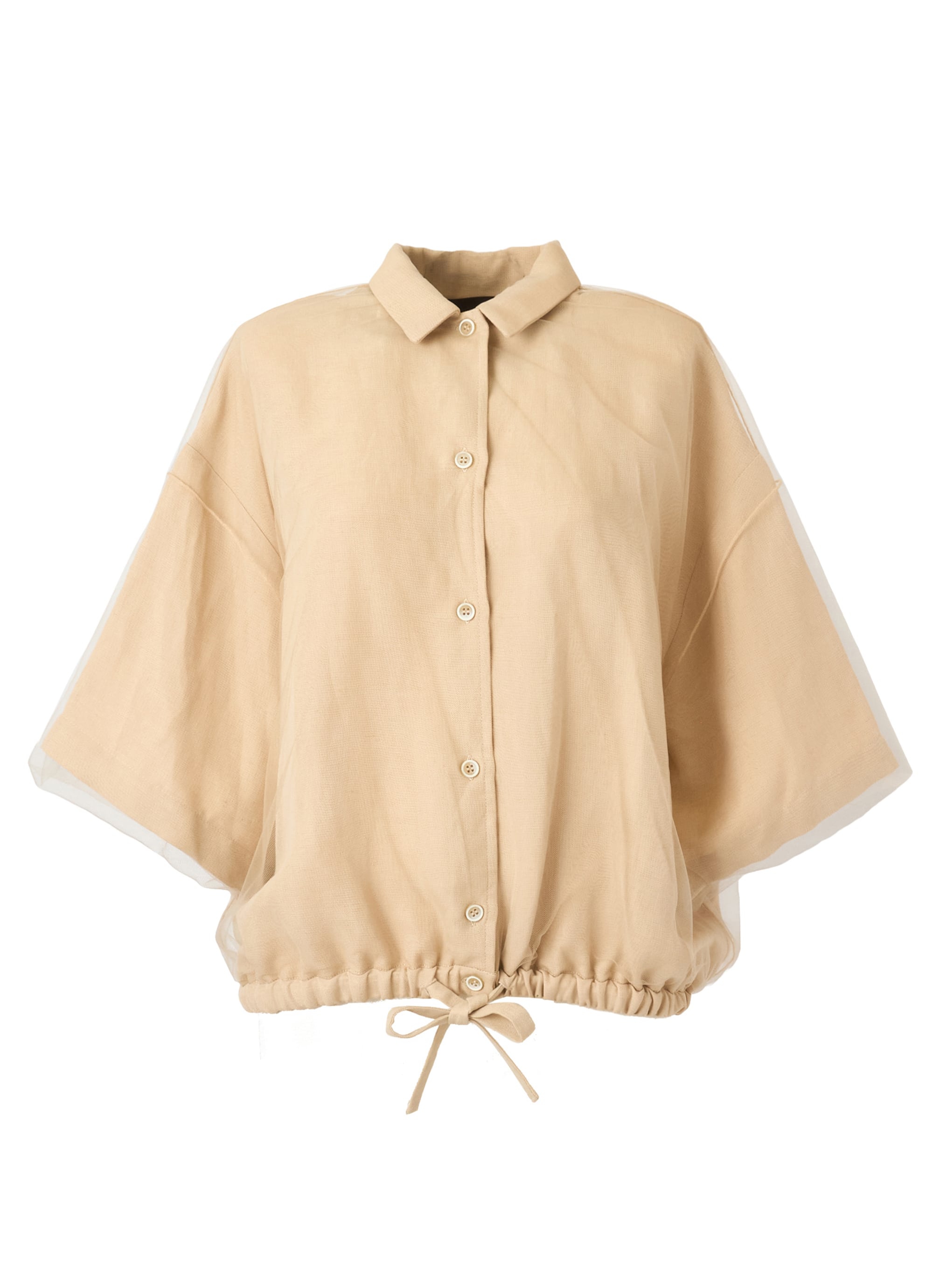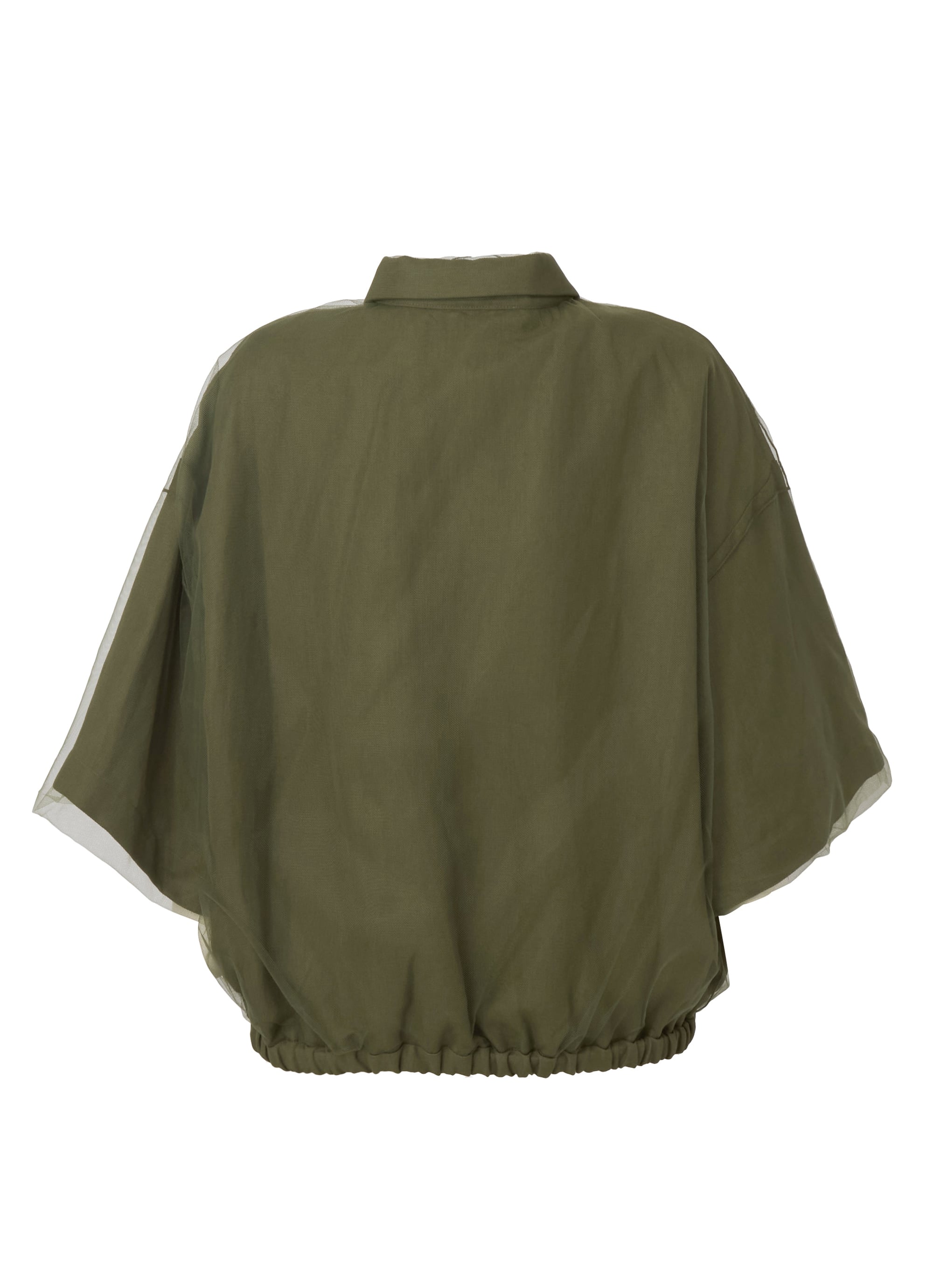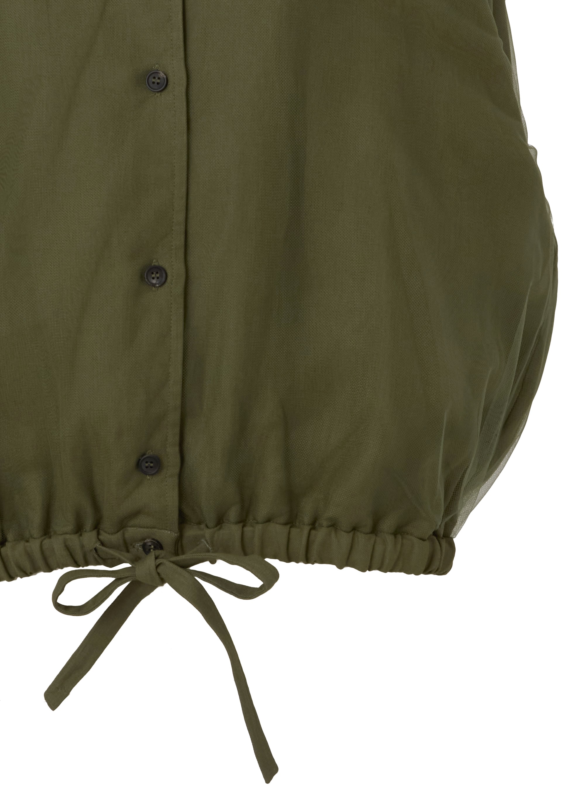 さらりとしたレーヨンリネン素材のジャケットに、チュールを組み合わせたカジュアルエレガントなアイテム。