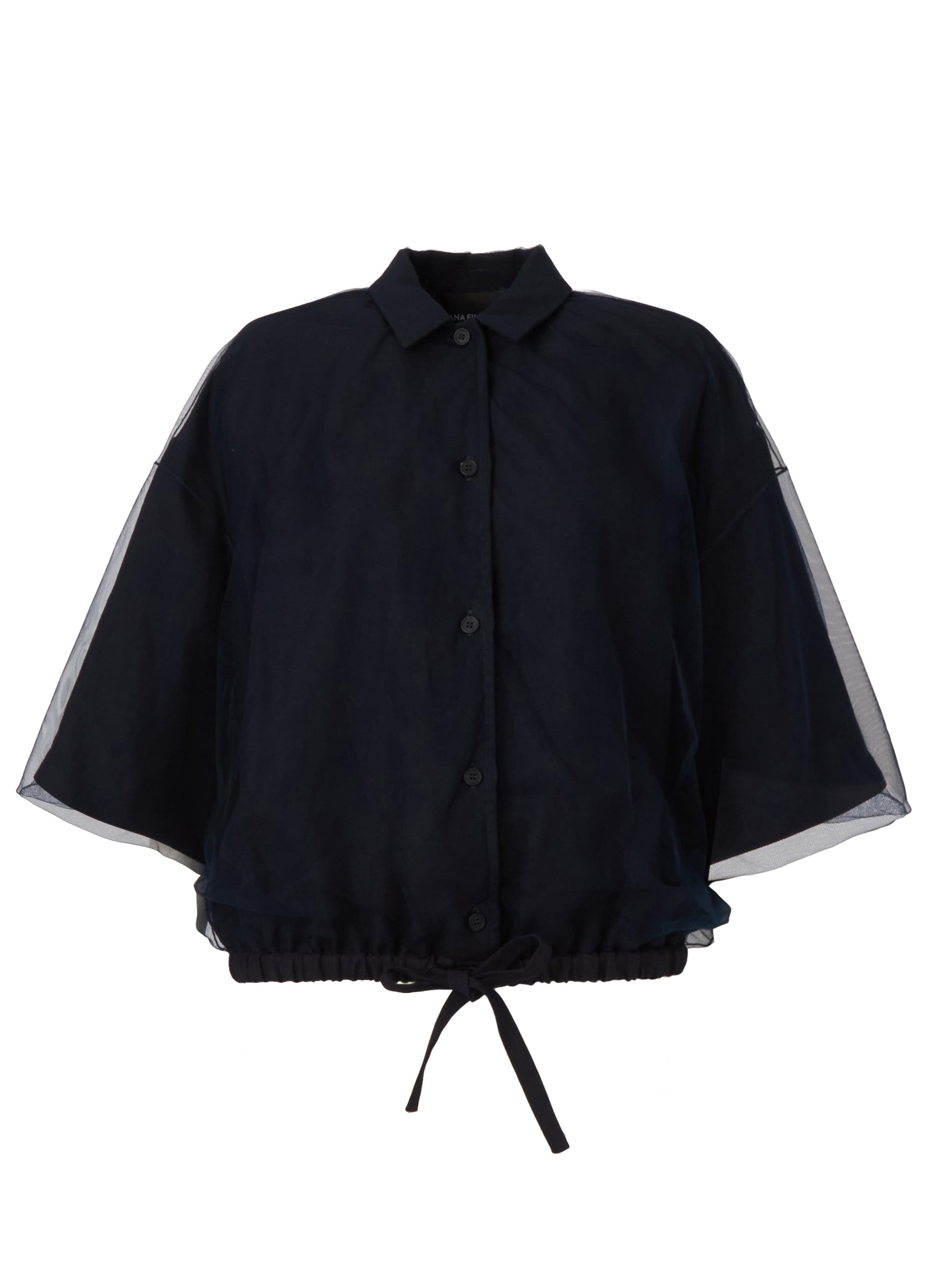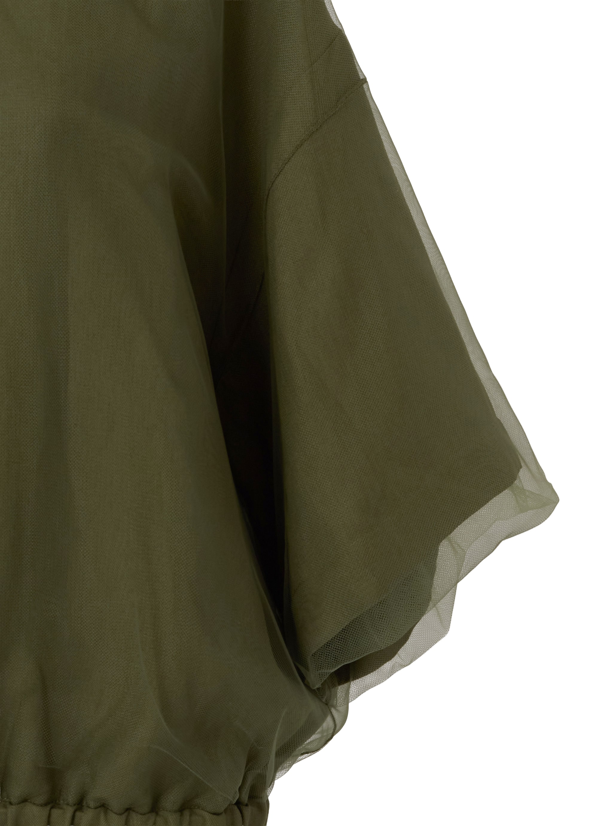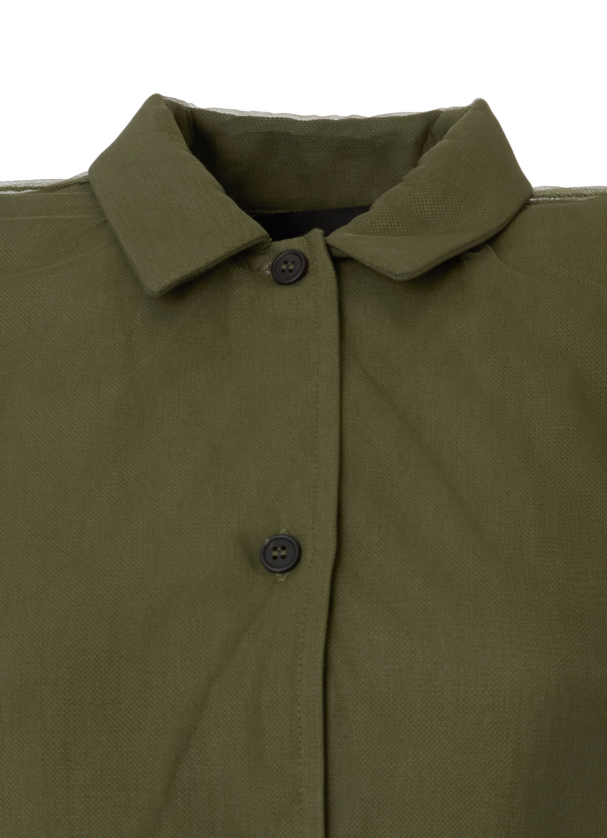 さらりとしたレーヨンリネン素材のジャケットに、チュールを組み合わせたカジュアルエレガントなアイテム。