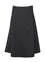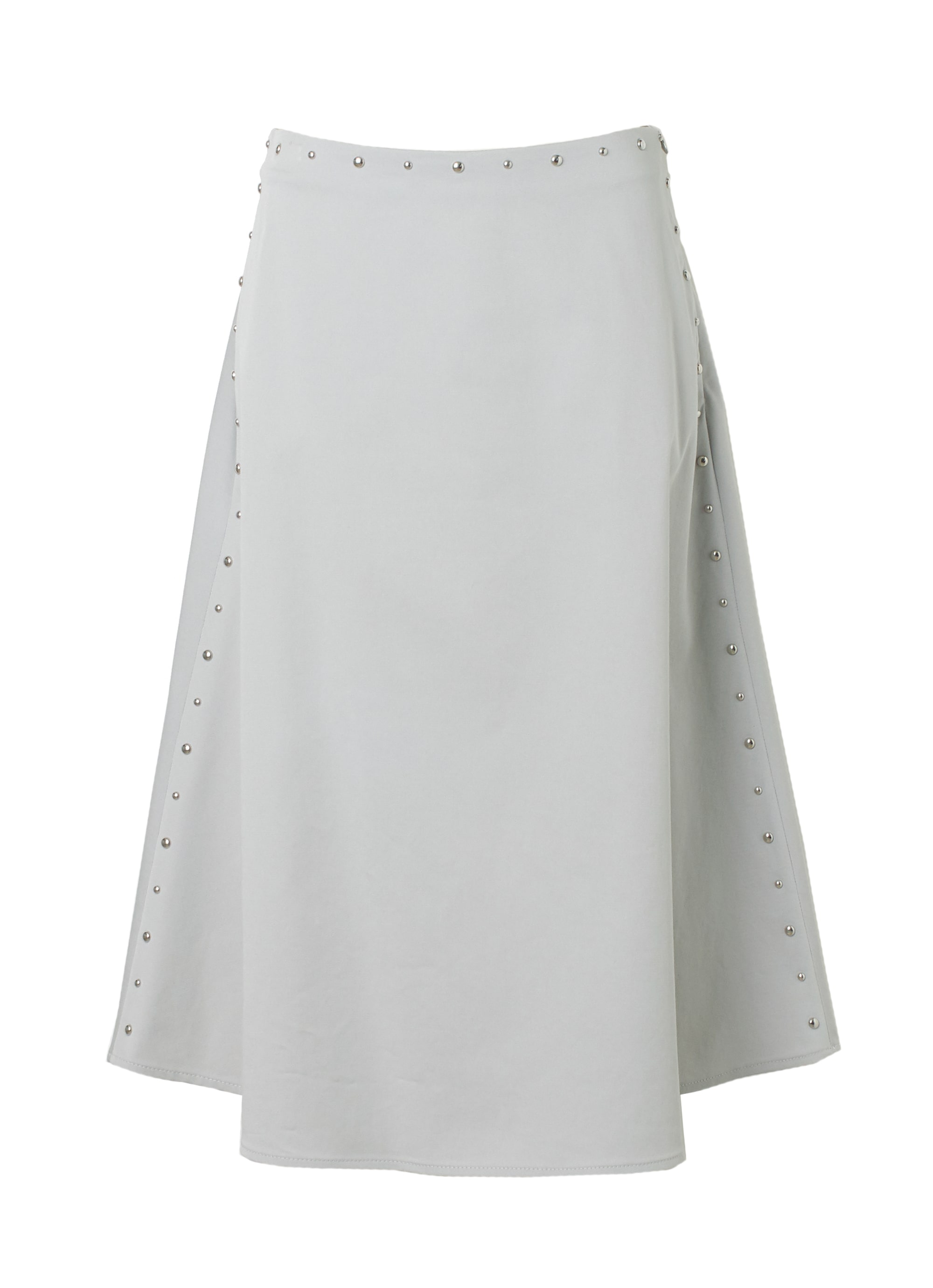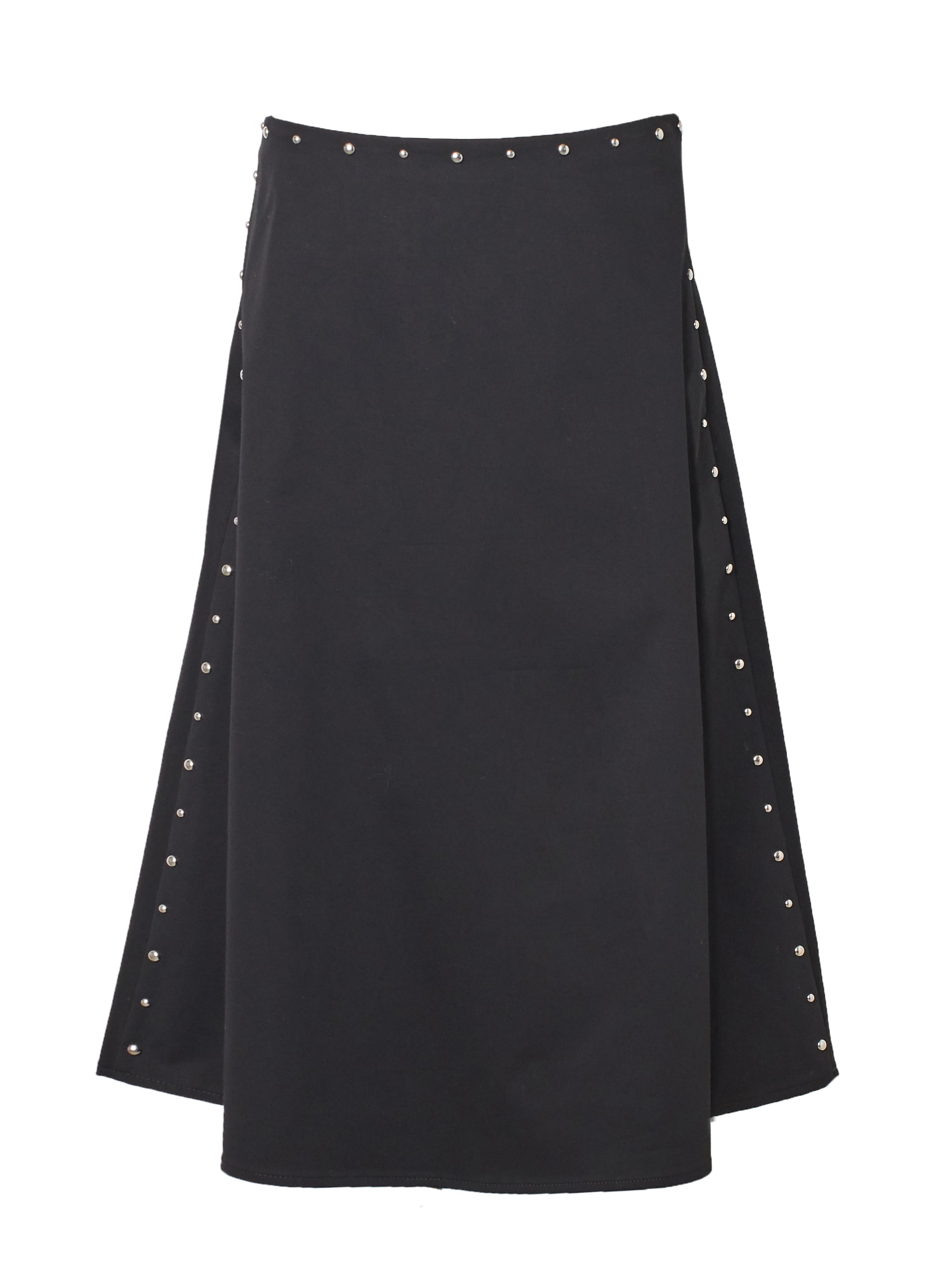 両サイドとウエスト廻りに、丸みのあるスタッズをぐるりと配したモダンなアクセントの効いたデザイン。ひざ下丈のフレアは風をはらむので、抜け感があり涼しく着用いただけます。