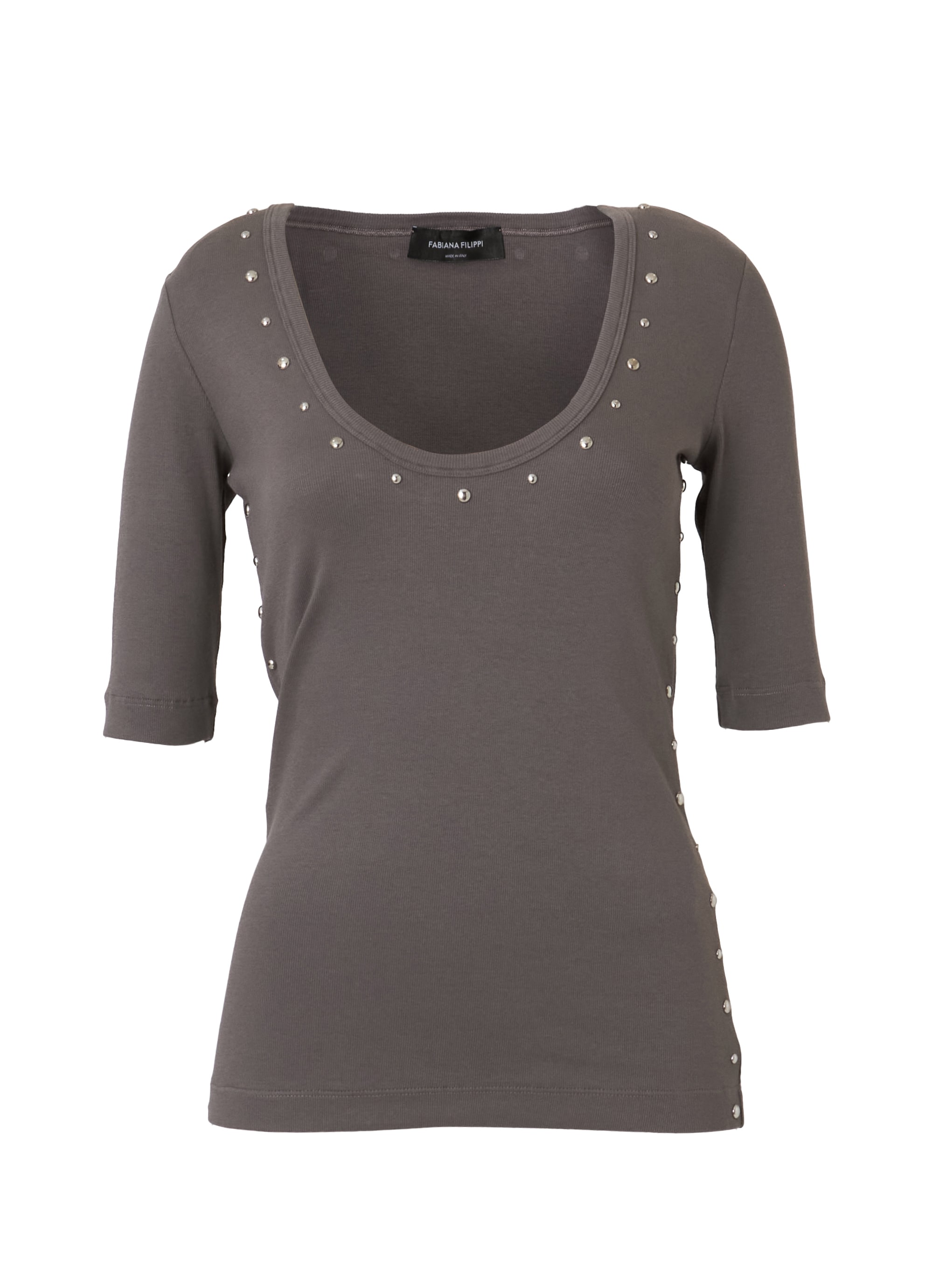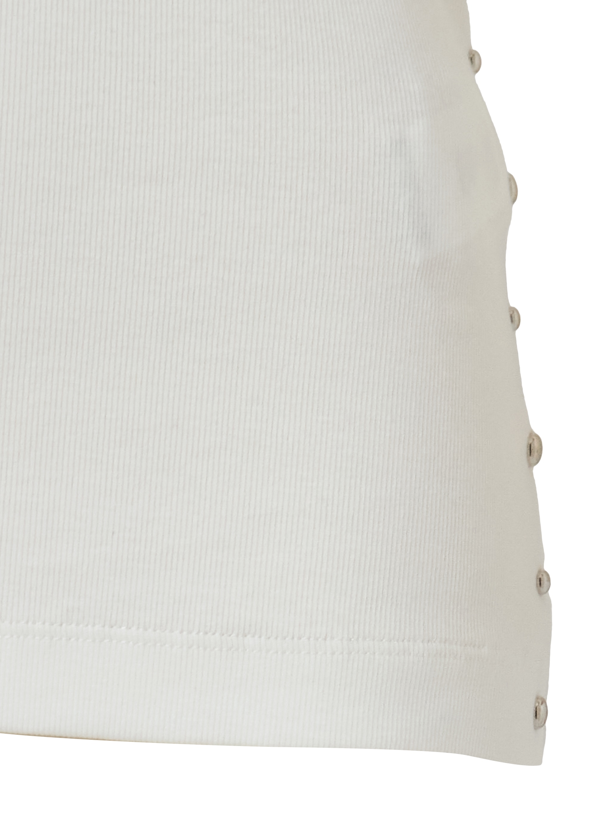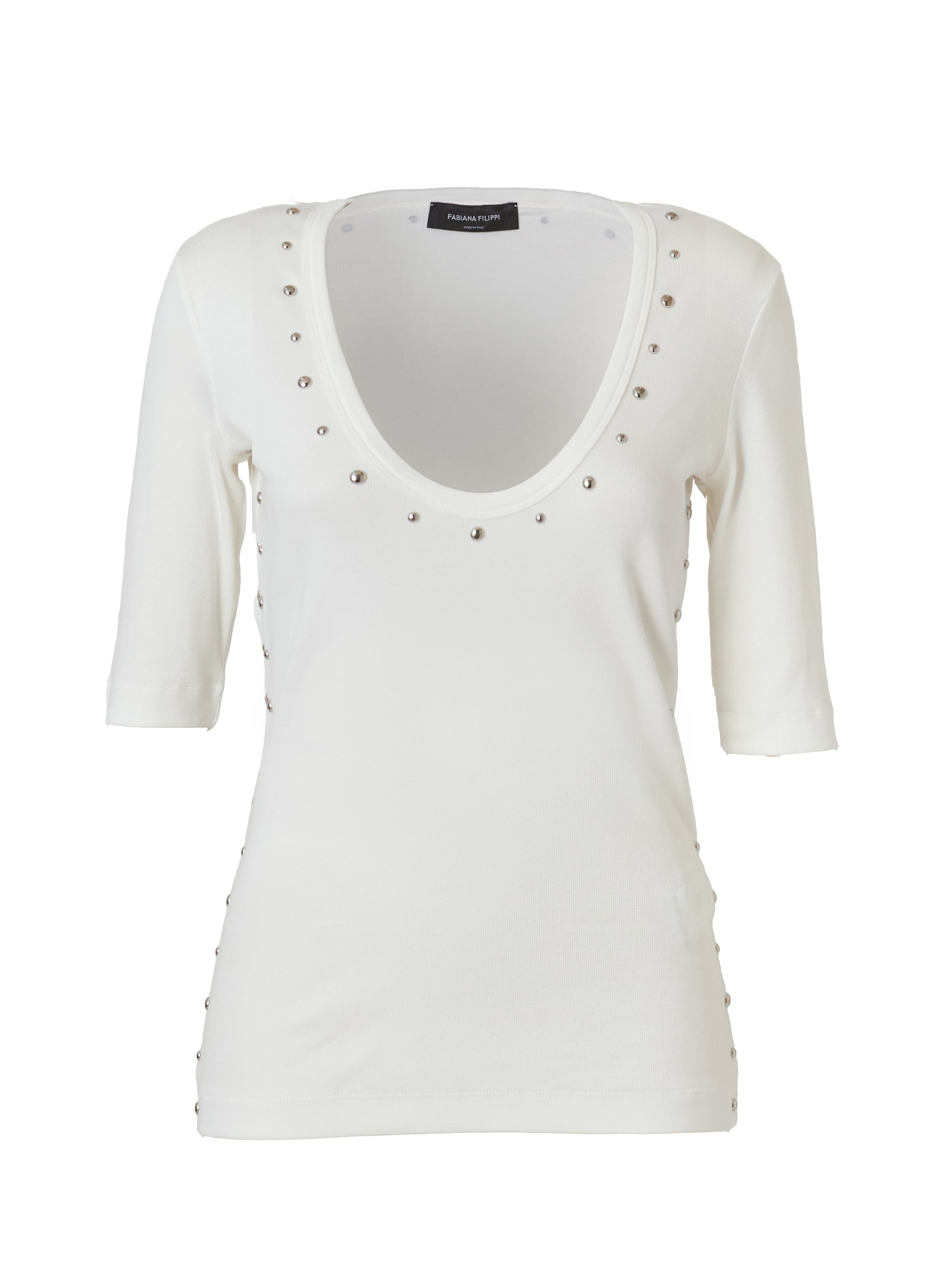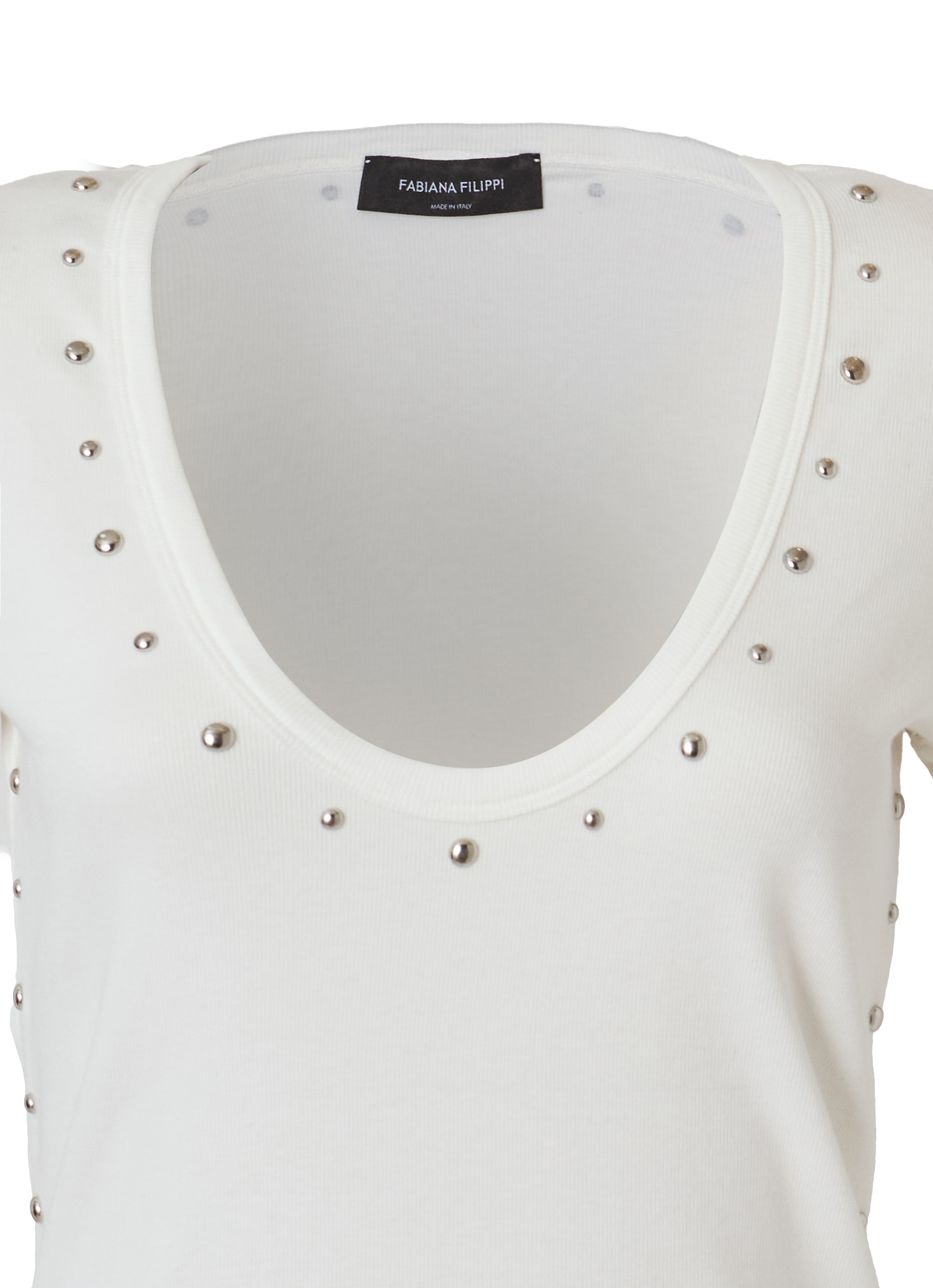 緩やかなカーブを描くオーバルネックがデコルテを美しく見せ、女性らしい印象に。ネックまわりとサイドラインには丸いスタッズをあしらい、シンプルな中にほどよいアクセントをプラスしました。