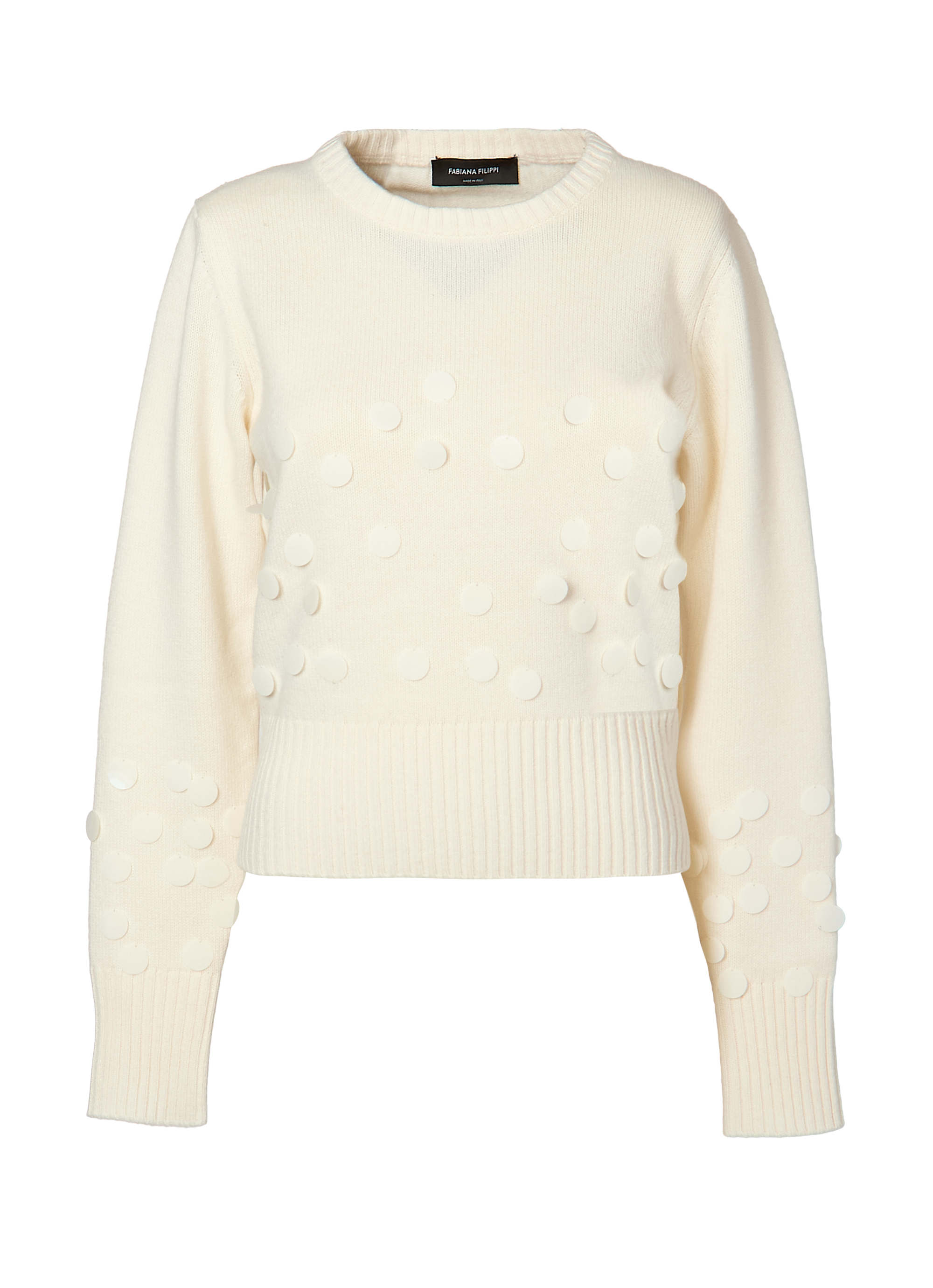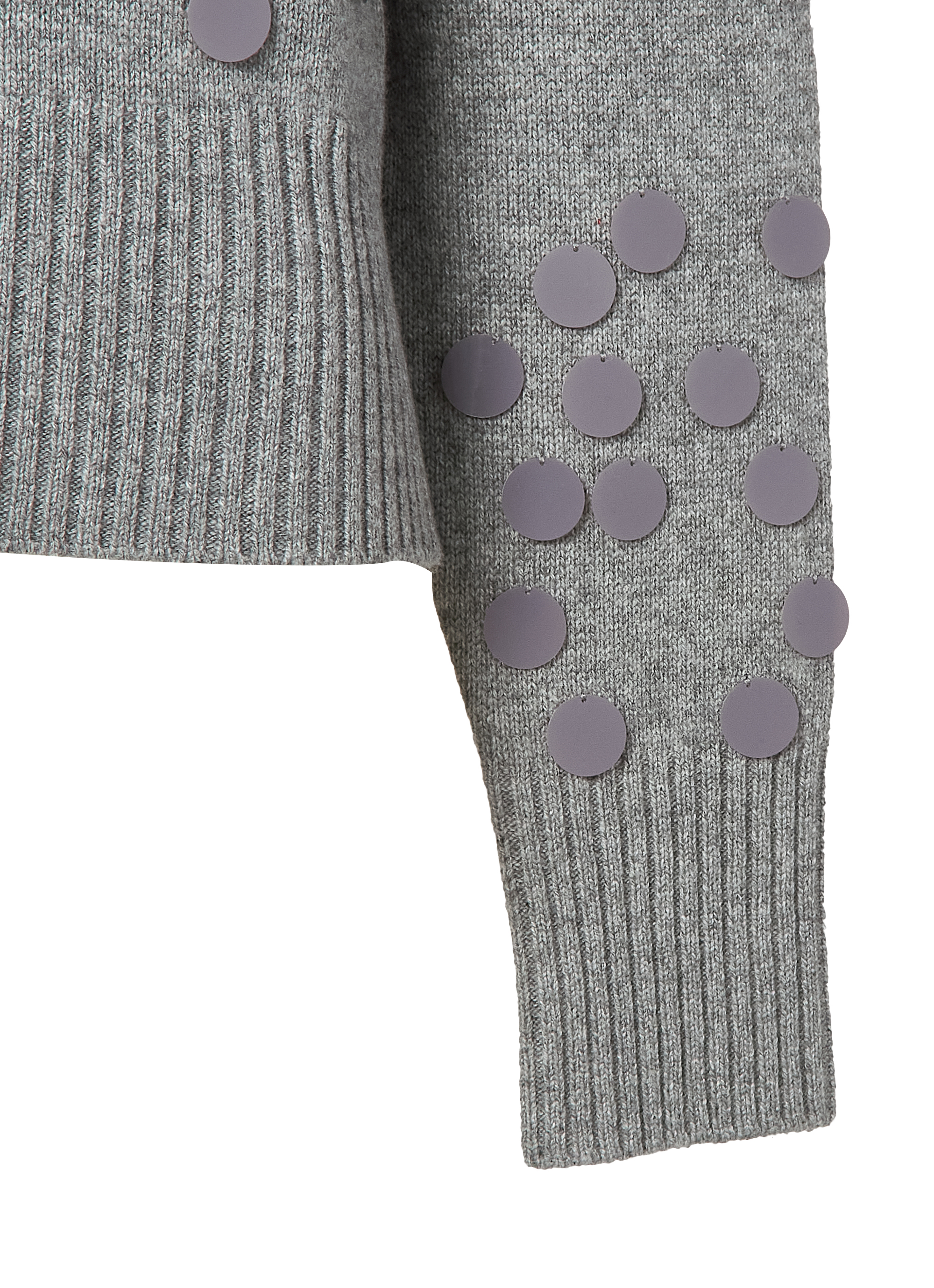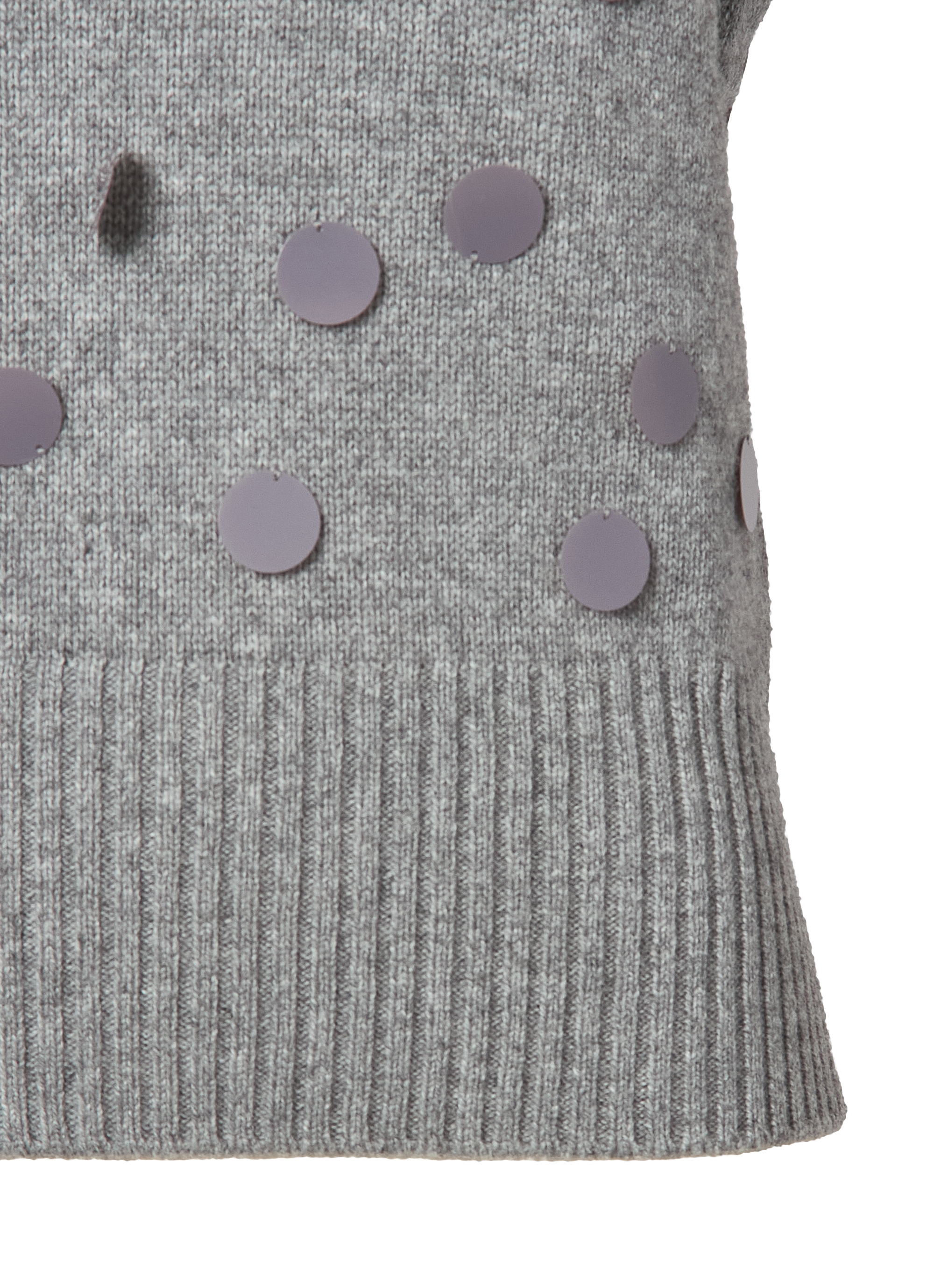 プレーンなデザインのクルーネックのニットプルオーバーは、使いやすいコンパクトなシルエット。大き目のリブとポップなスパンコールを配し、シンプルなボトムと合わせれば大人のカジュアルスタイルが完成です。