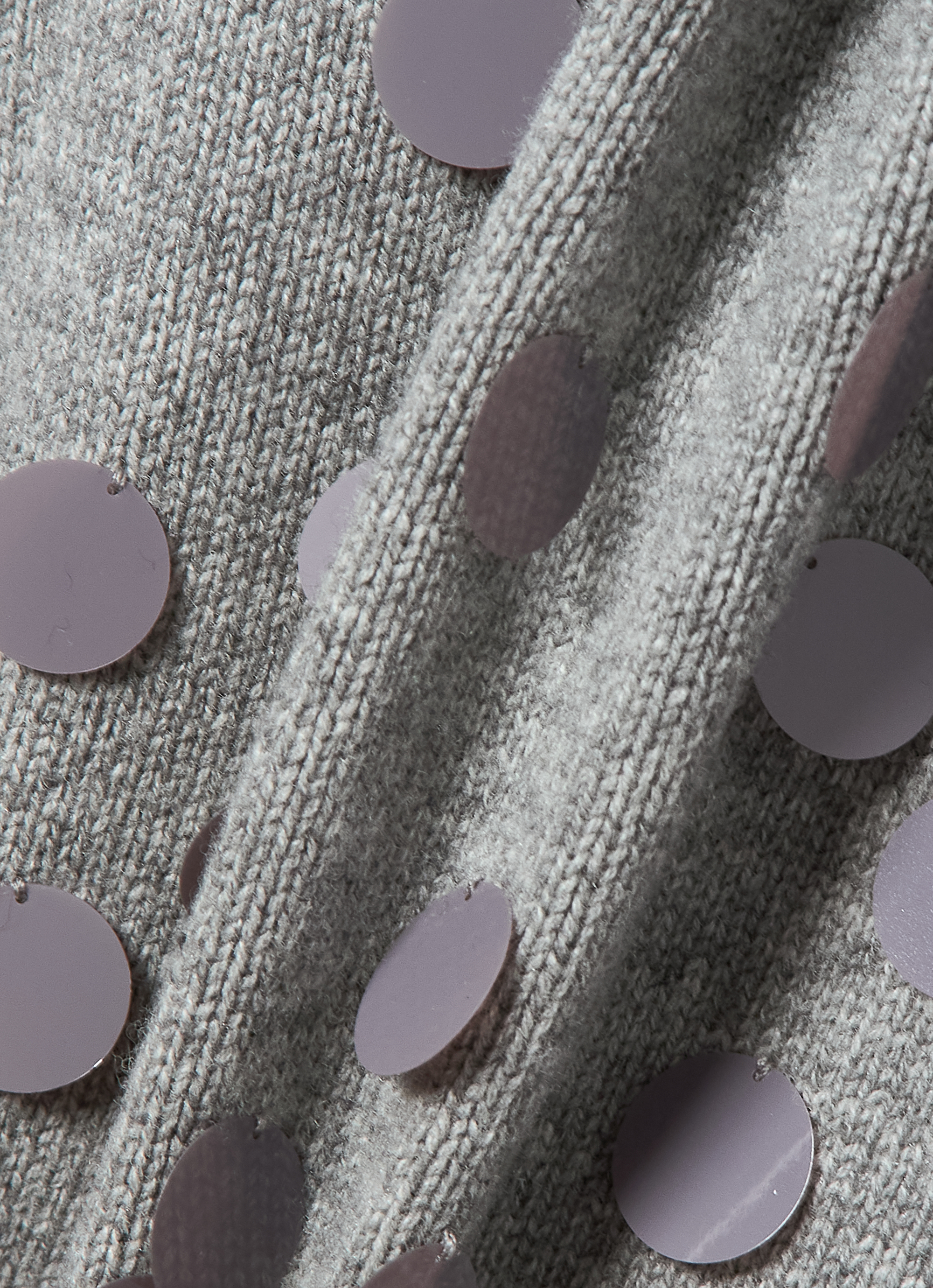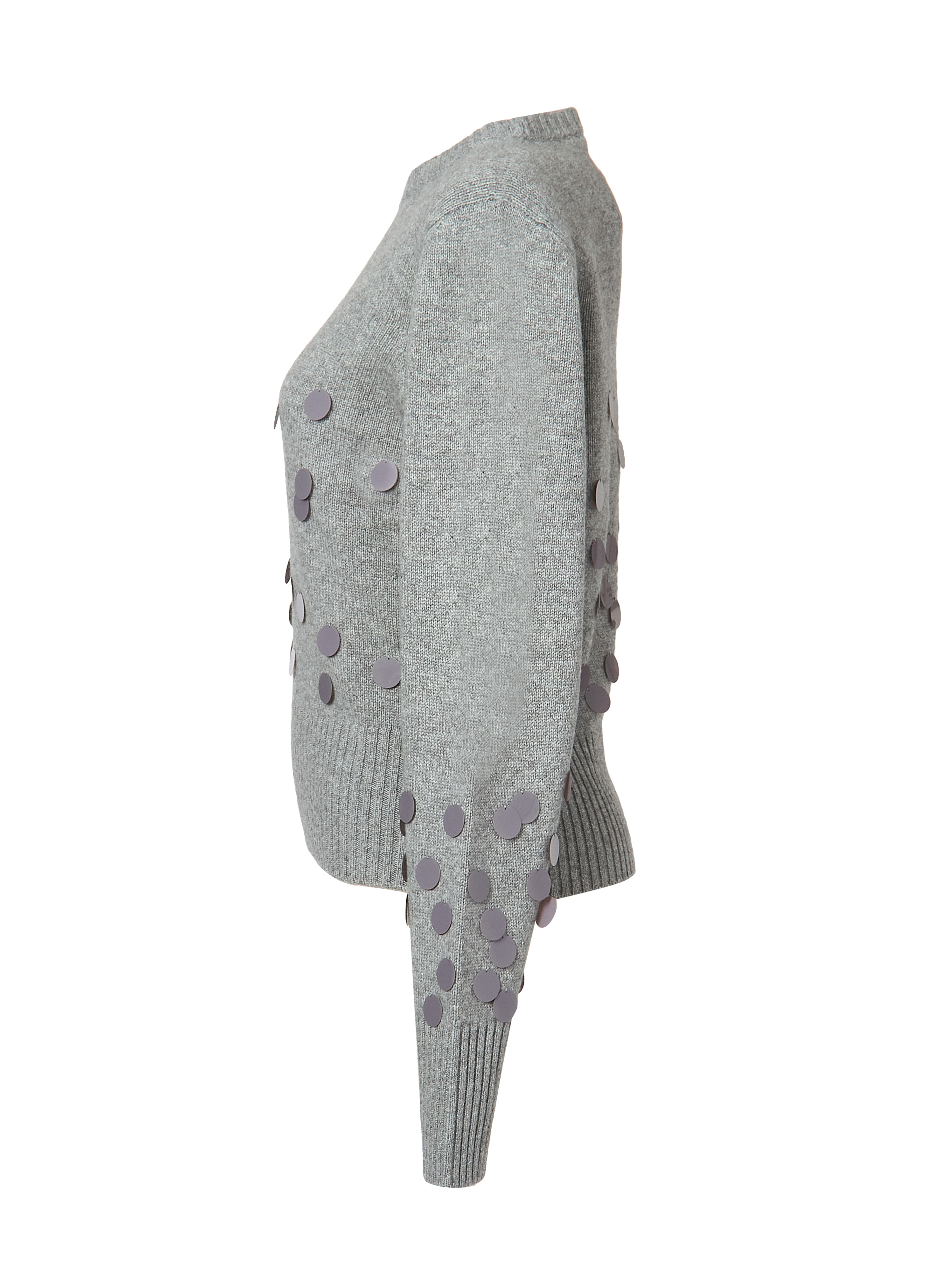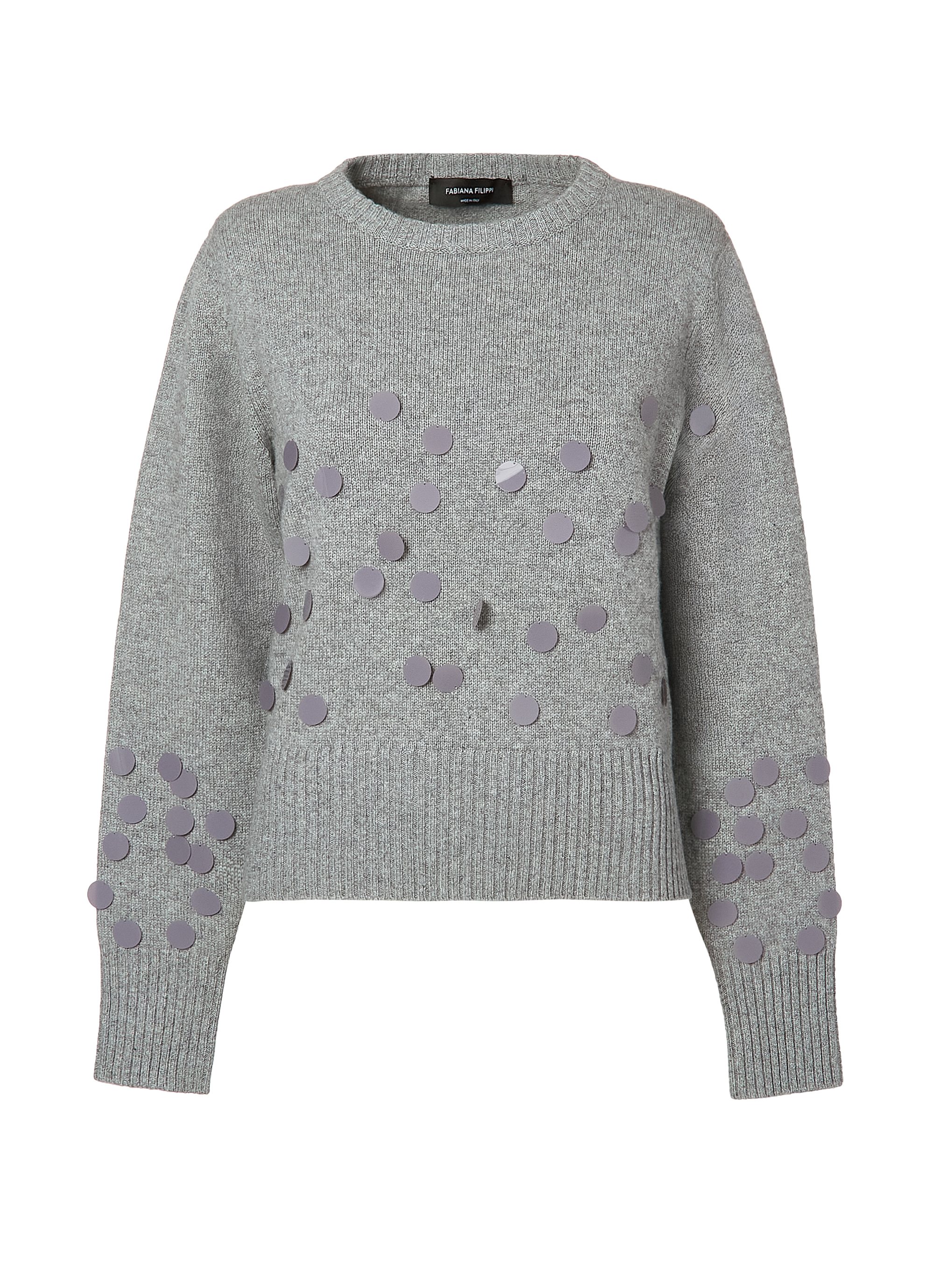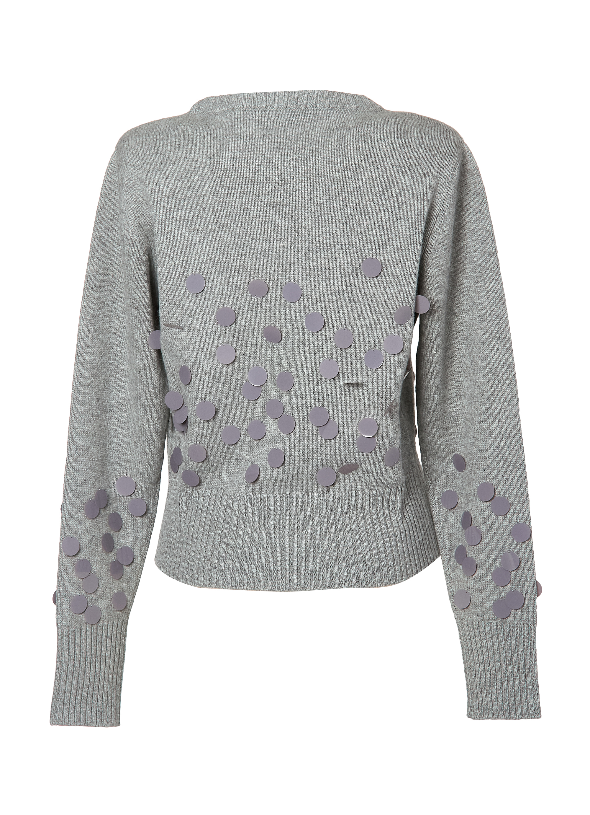 プレーンなデザインのクルーネックのニットプルオーバーは、使いやすいコンパクトなシルエット。大き目のリブとポップなスパンコールを配し、シンプルなボトムと合わせれば大人のカジュアルスタイルが完成です。