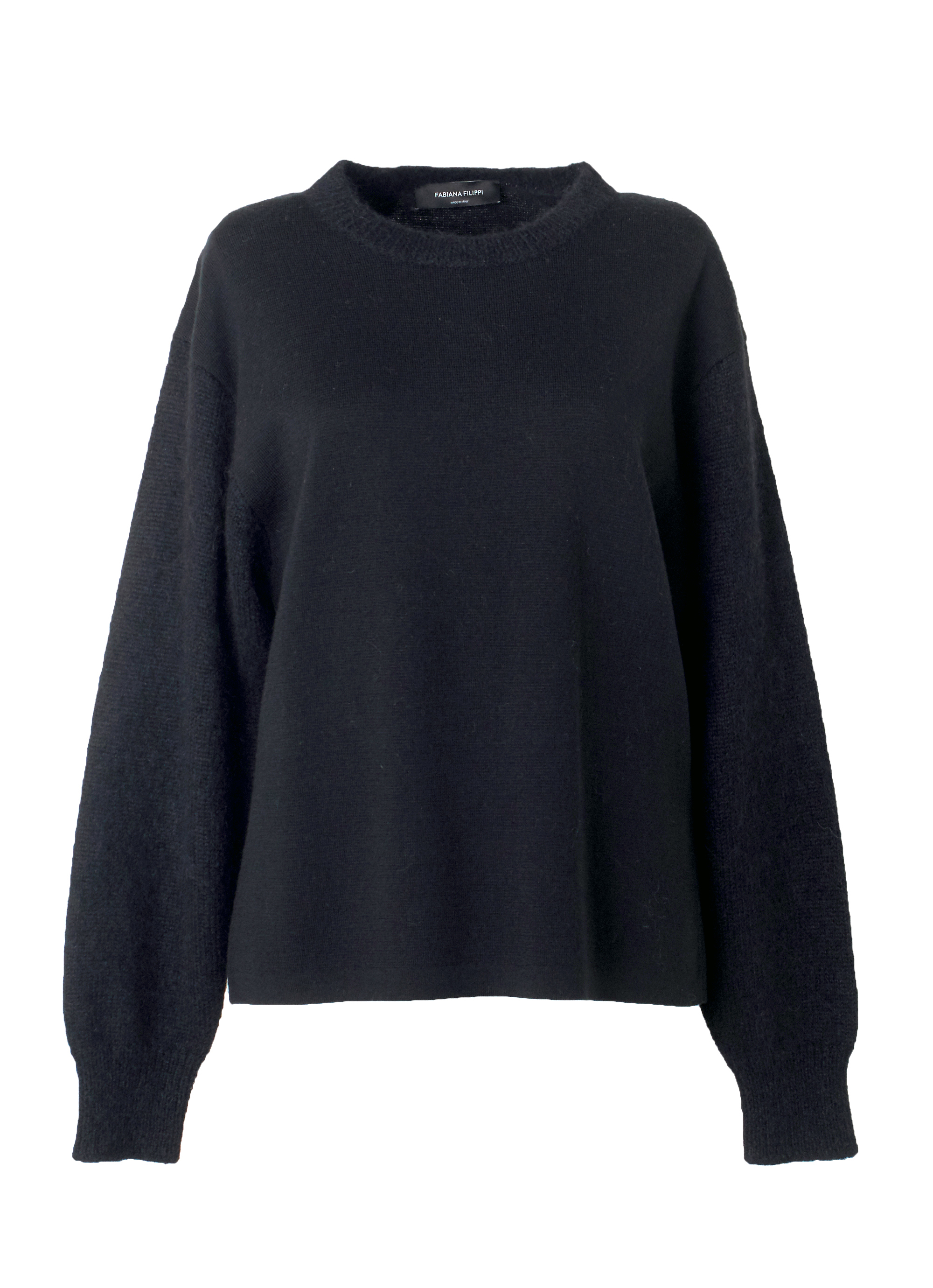 コンパクトな編地のボディに、ふわふわとしたアルパカモヘアのボリューム袖がポイントのプルオーバーニット。