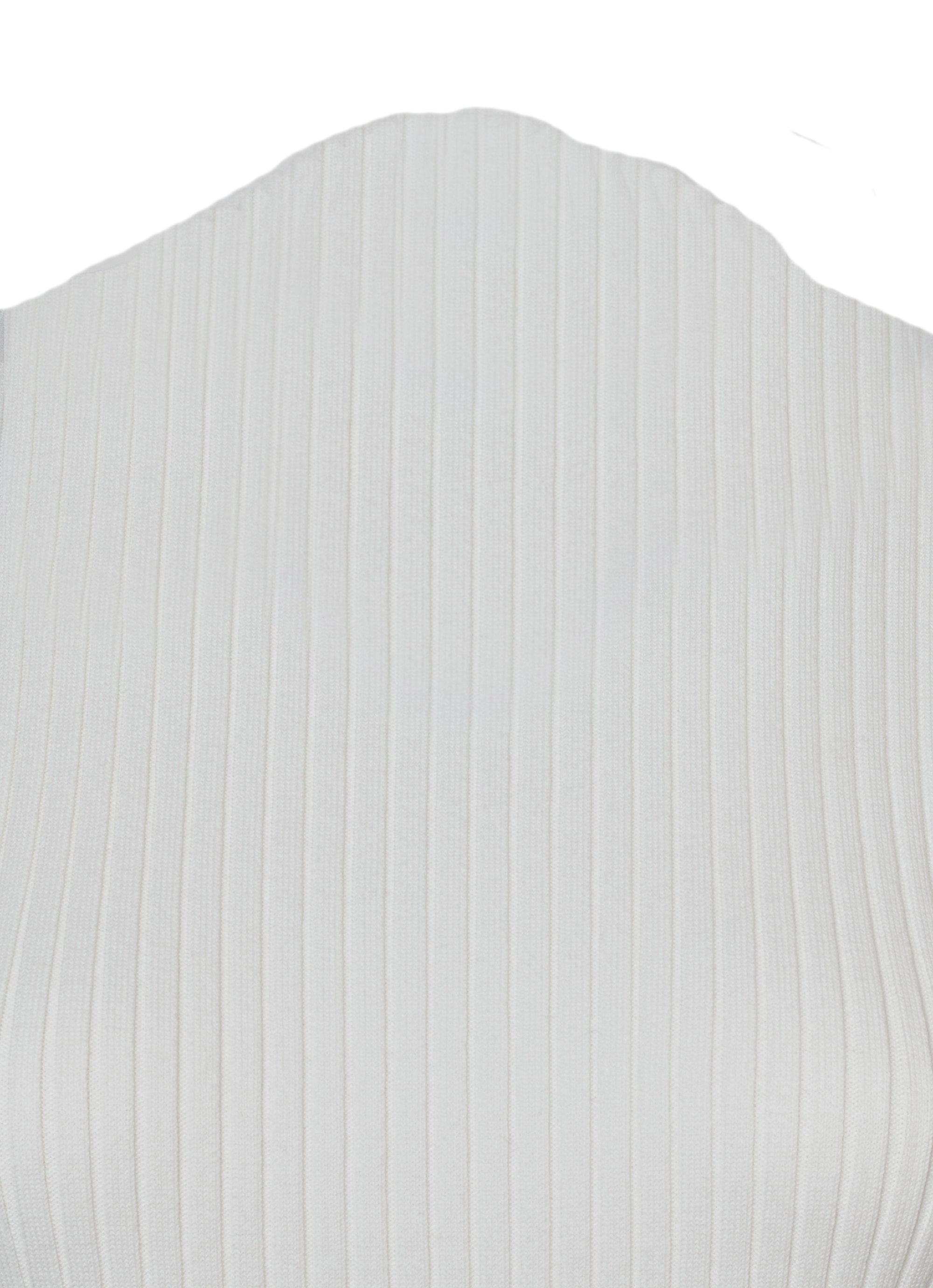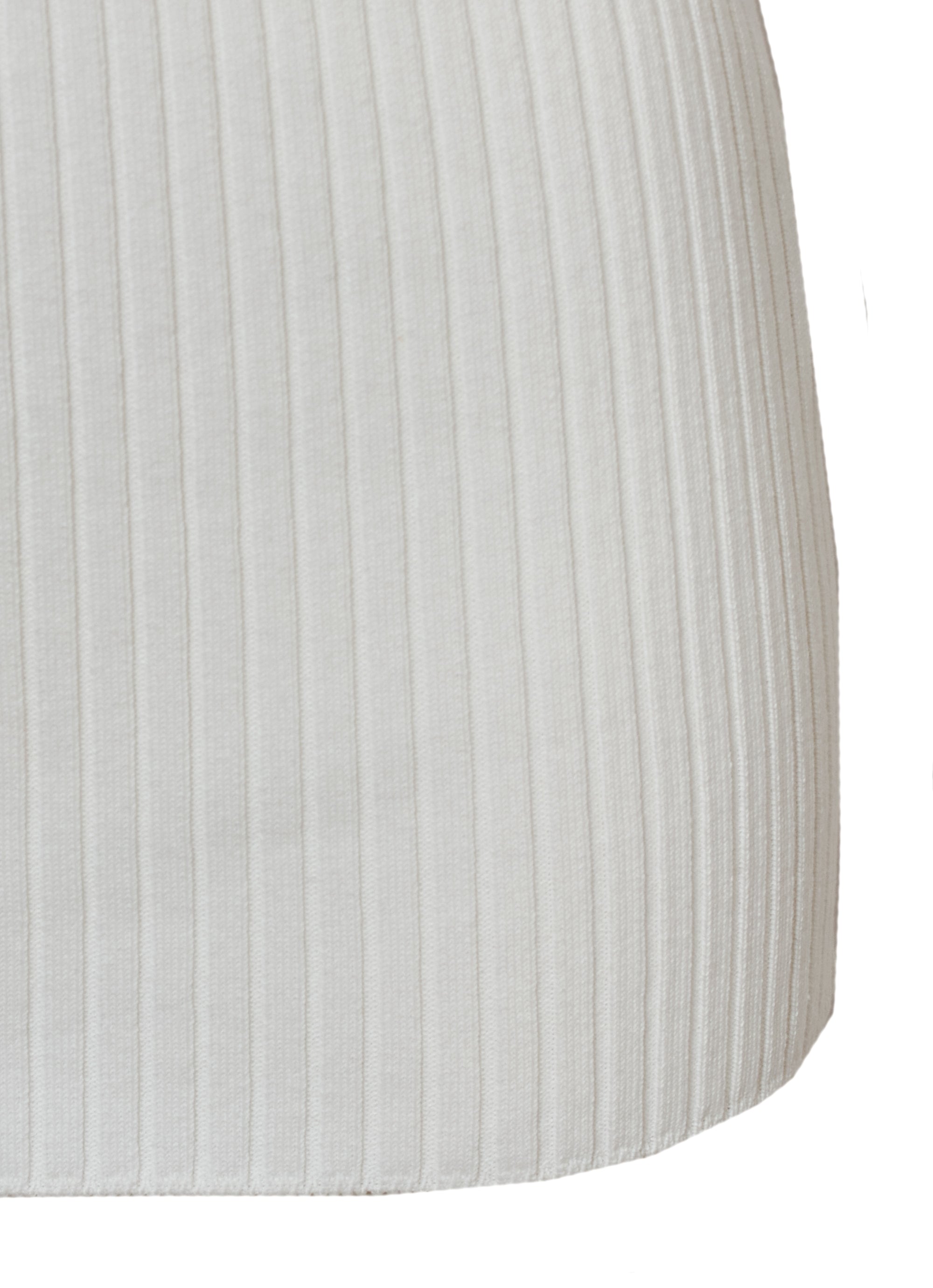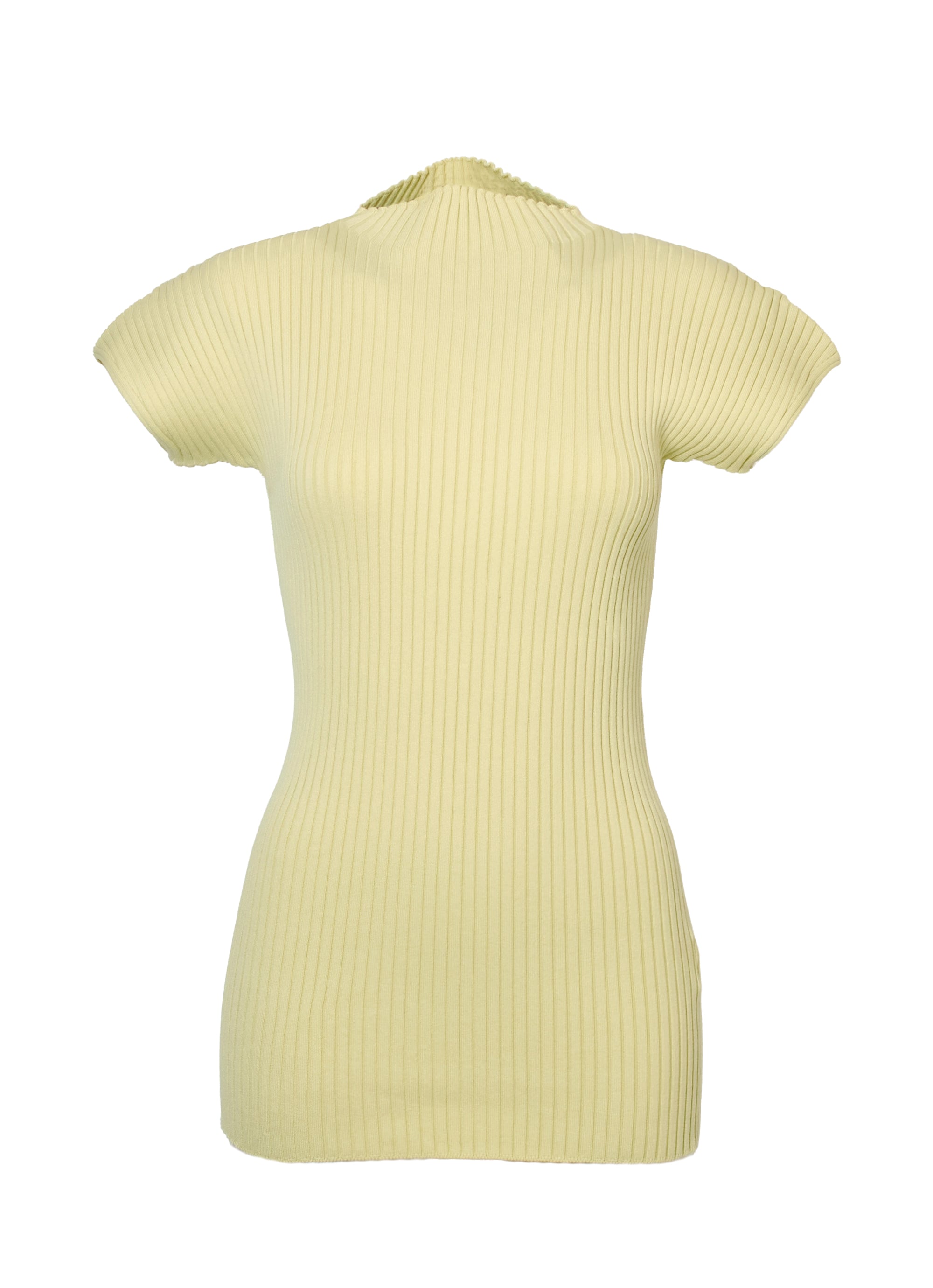 コンパクトなリブニットをハイネックのデザインにすることで、さらにフェミニンな雰囲気に。