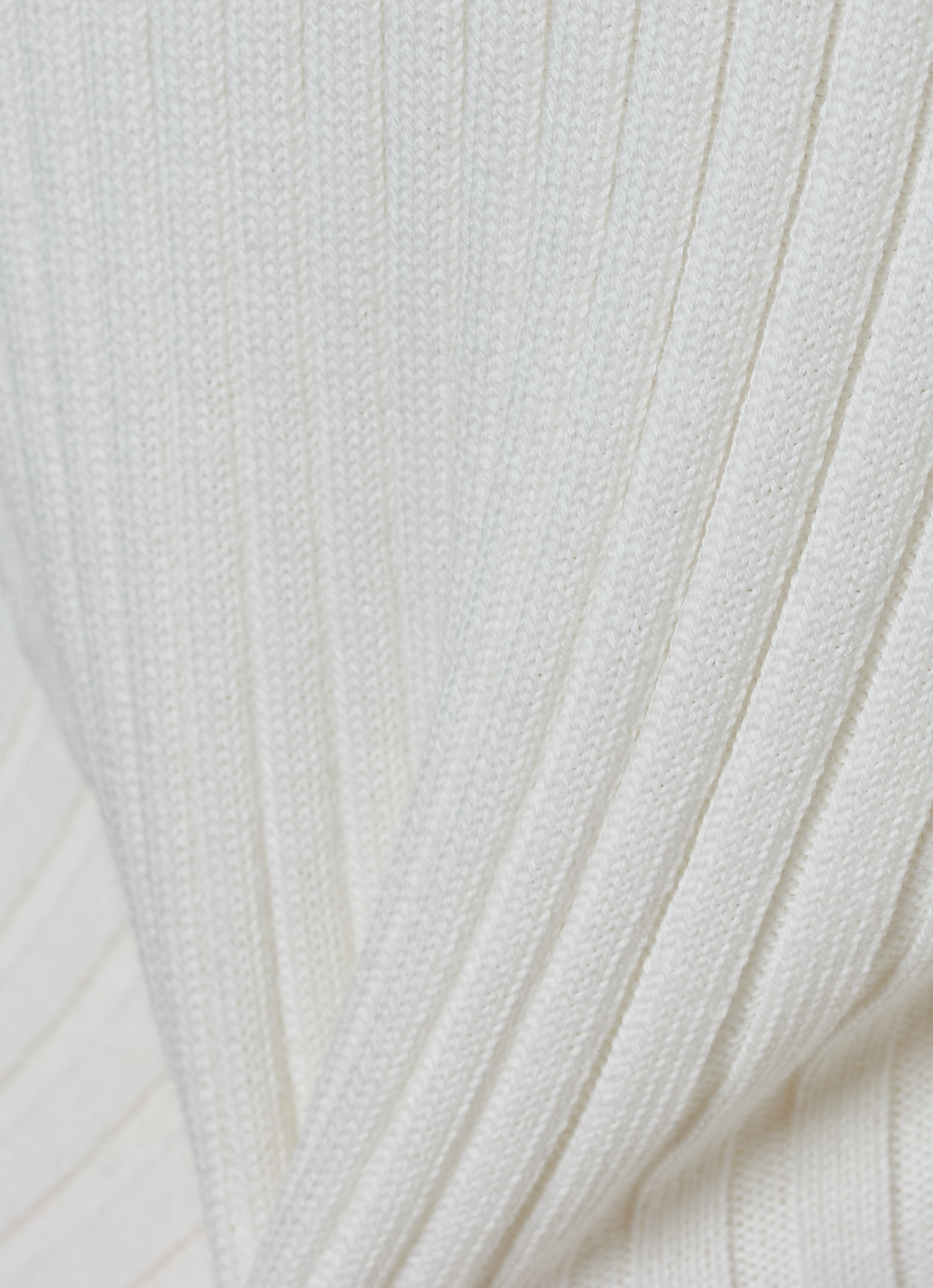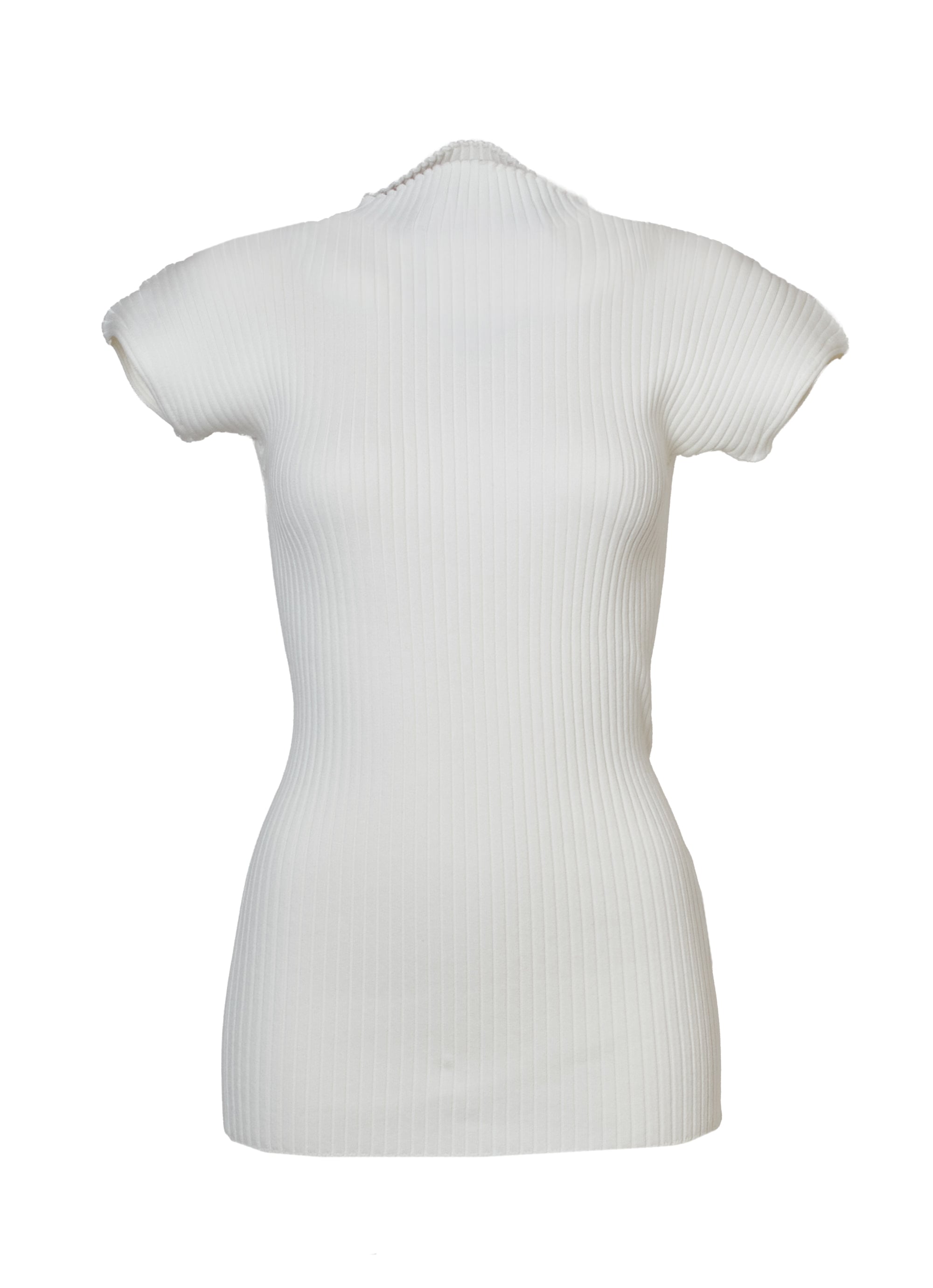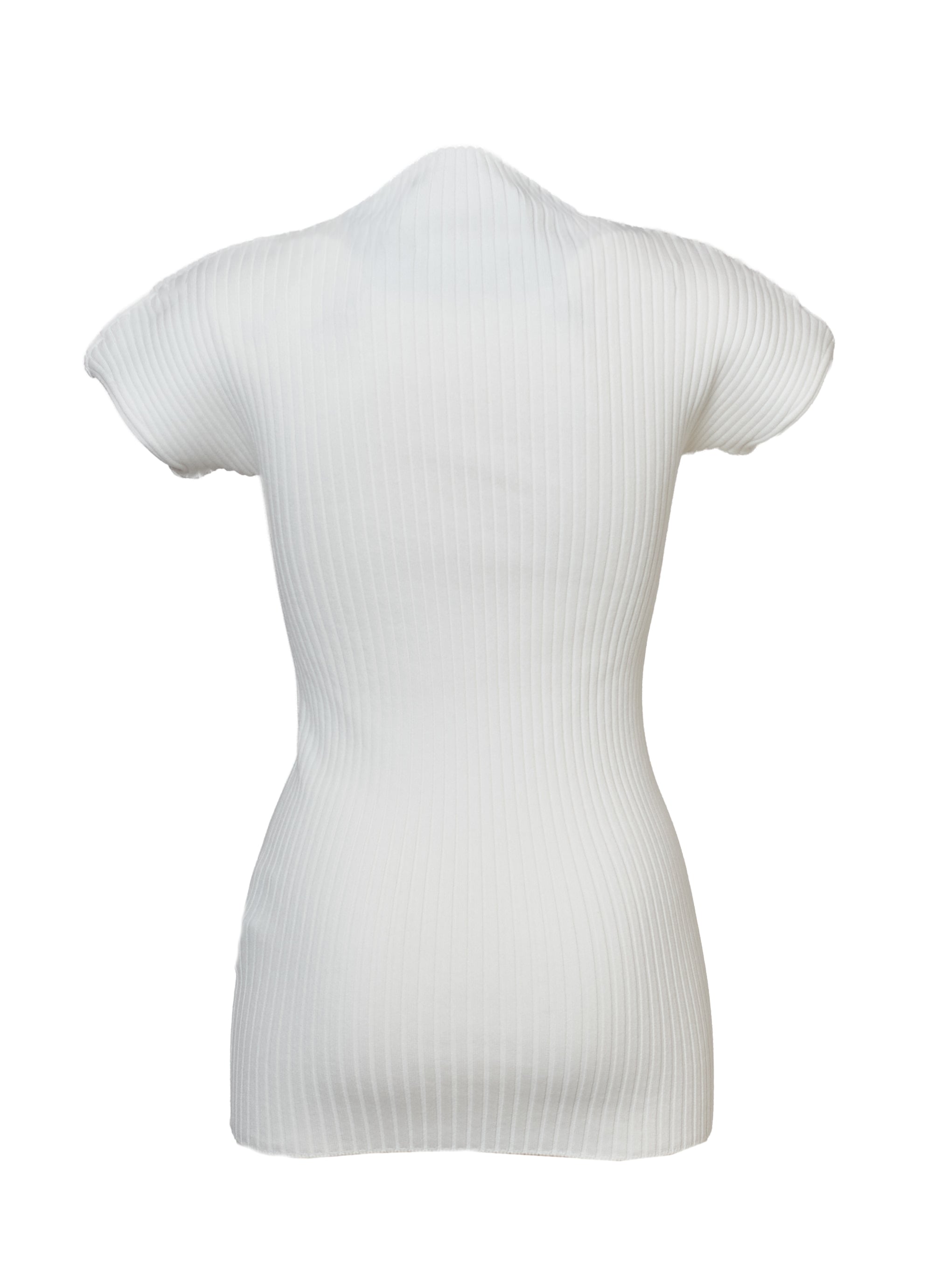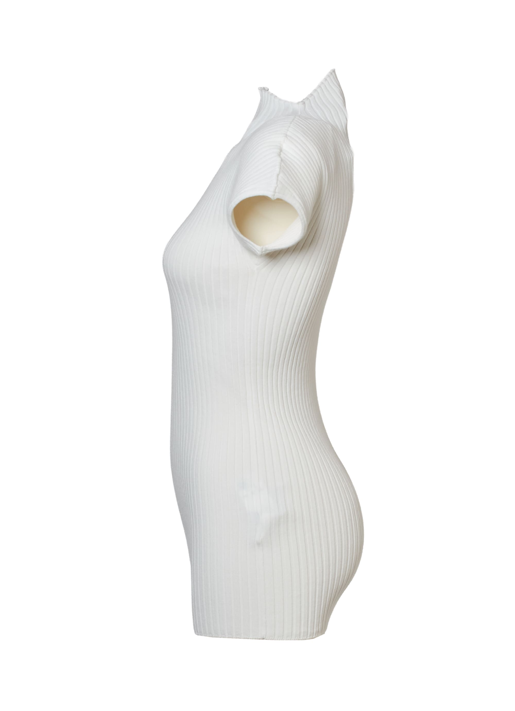 コンパクトなリブニットをハイネックのデザインにすることで、さらにフェミニンな雰囲気に。