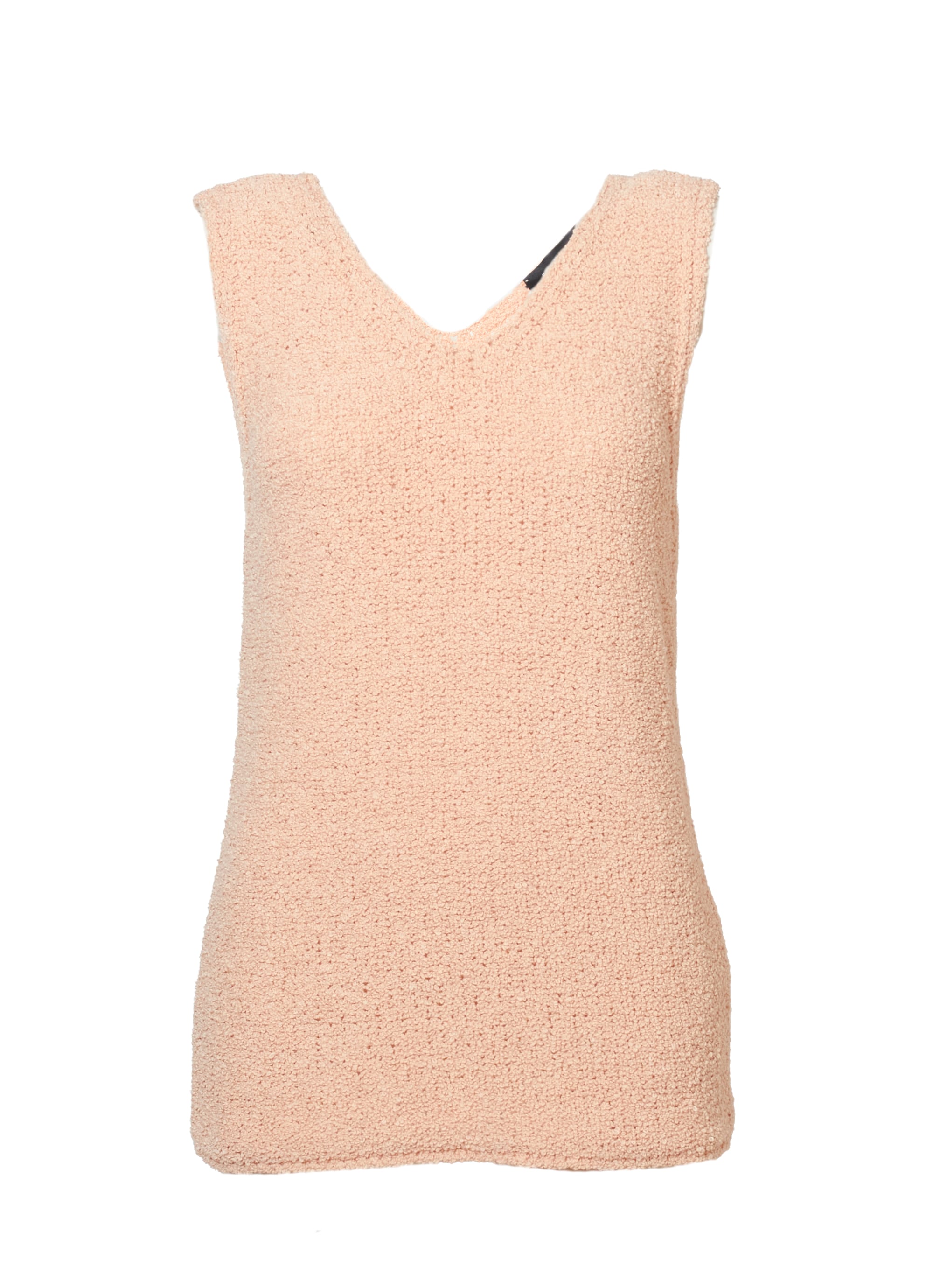 もこもことした立体的素材感が際立つコットンブークレーのノースリーブニット。ボリューム感のある編地は、軽やかな素材の多い夏のスタイリングに、ラグジュアリーなアクセントになります。深めのVネックが知的なセクシーさを演出。ヒップ丈なのでスカートにもパンツにも合わせやすい使い勝手の良い一枚です。
