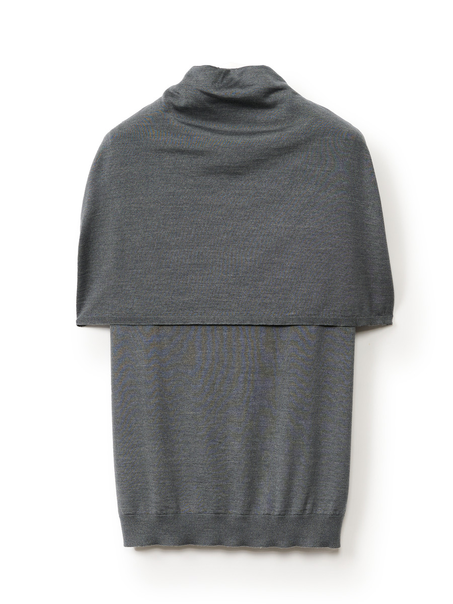 両肩にかぶせてケープ状にも、首元に垂らしてオフタートル風にもと活用の幅が広い一枚。