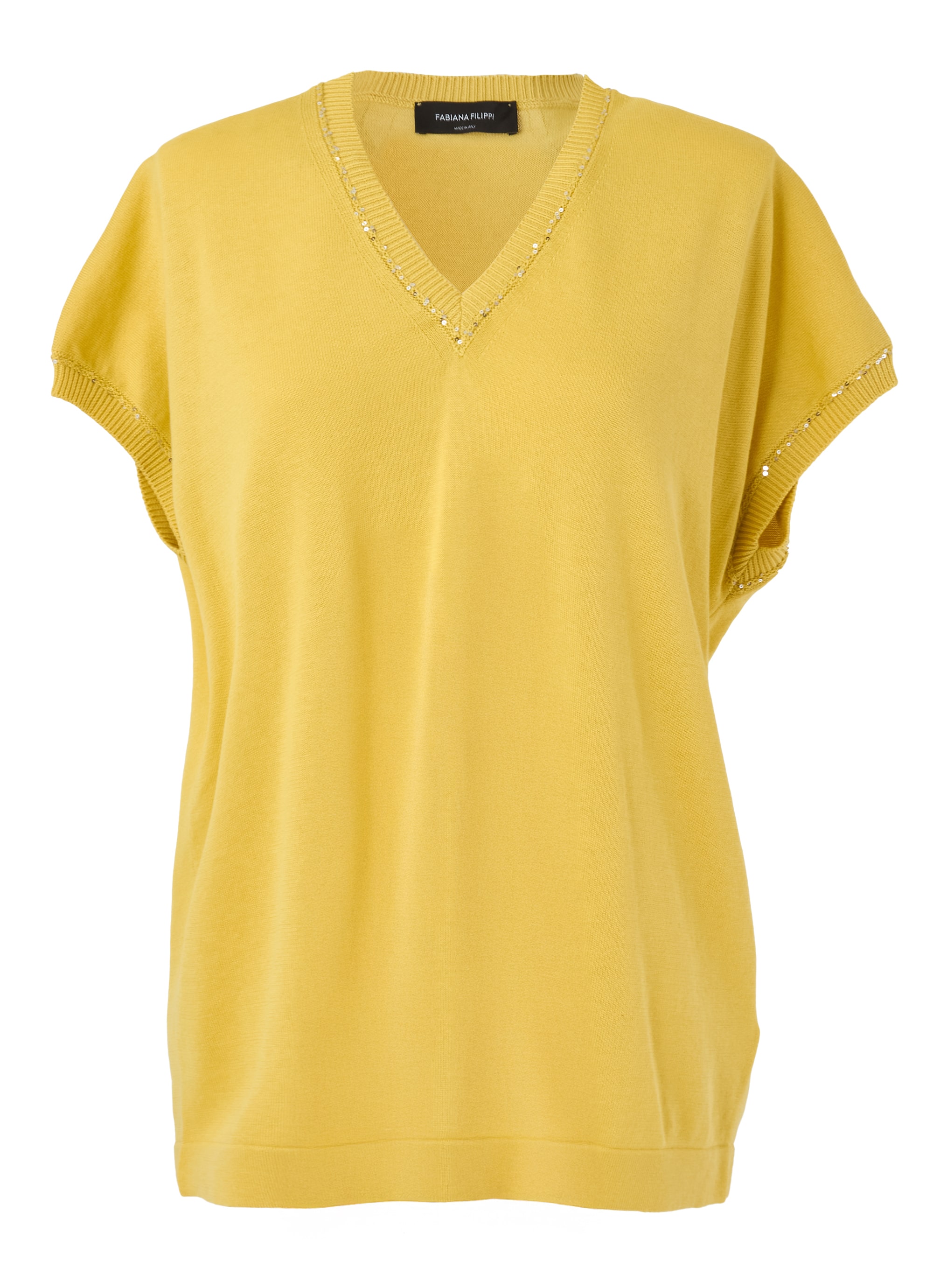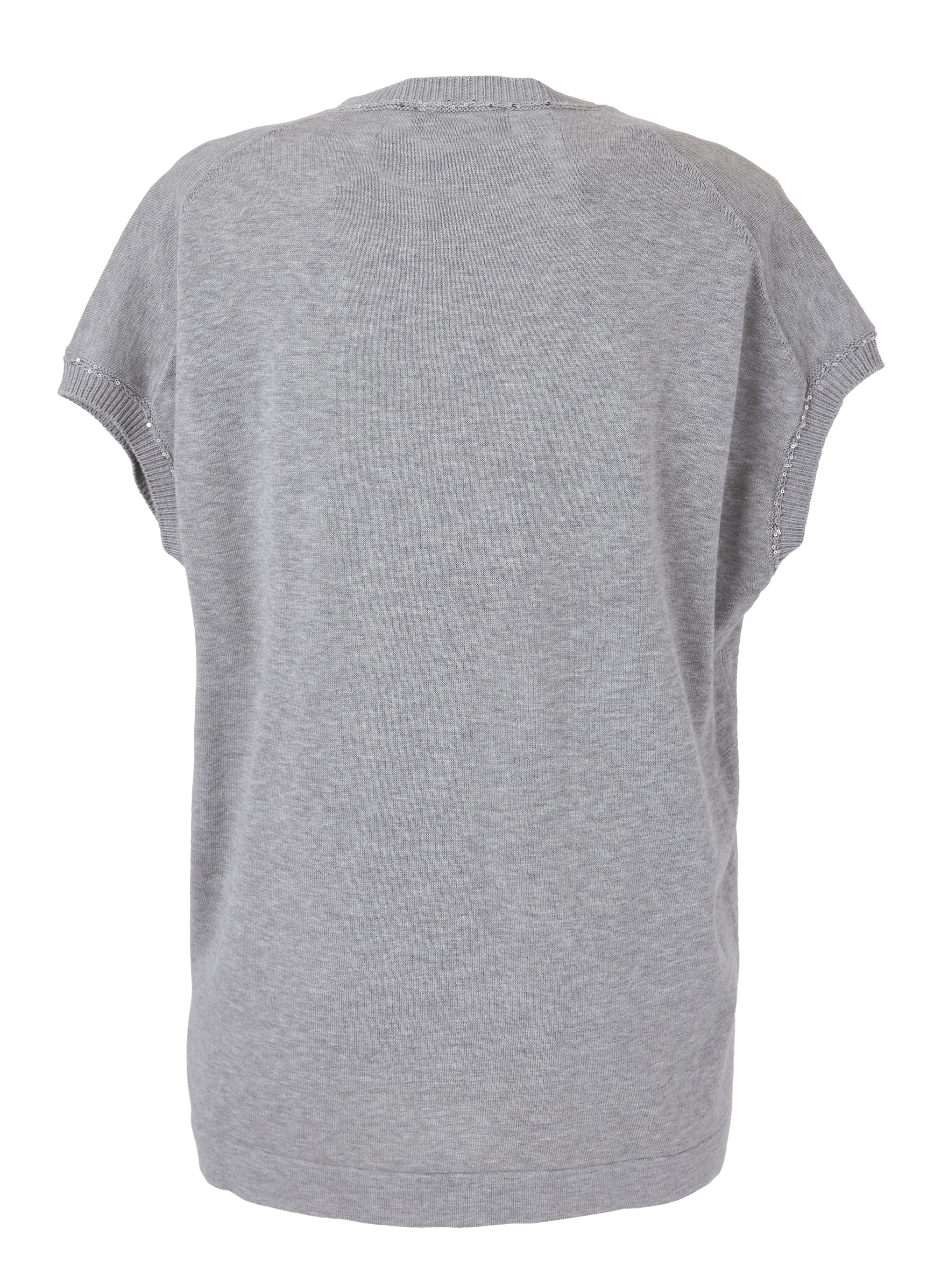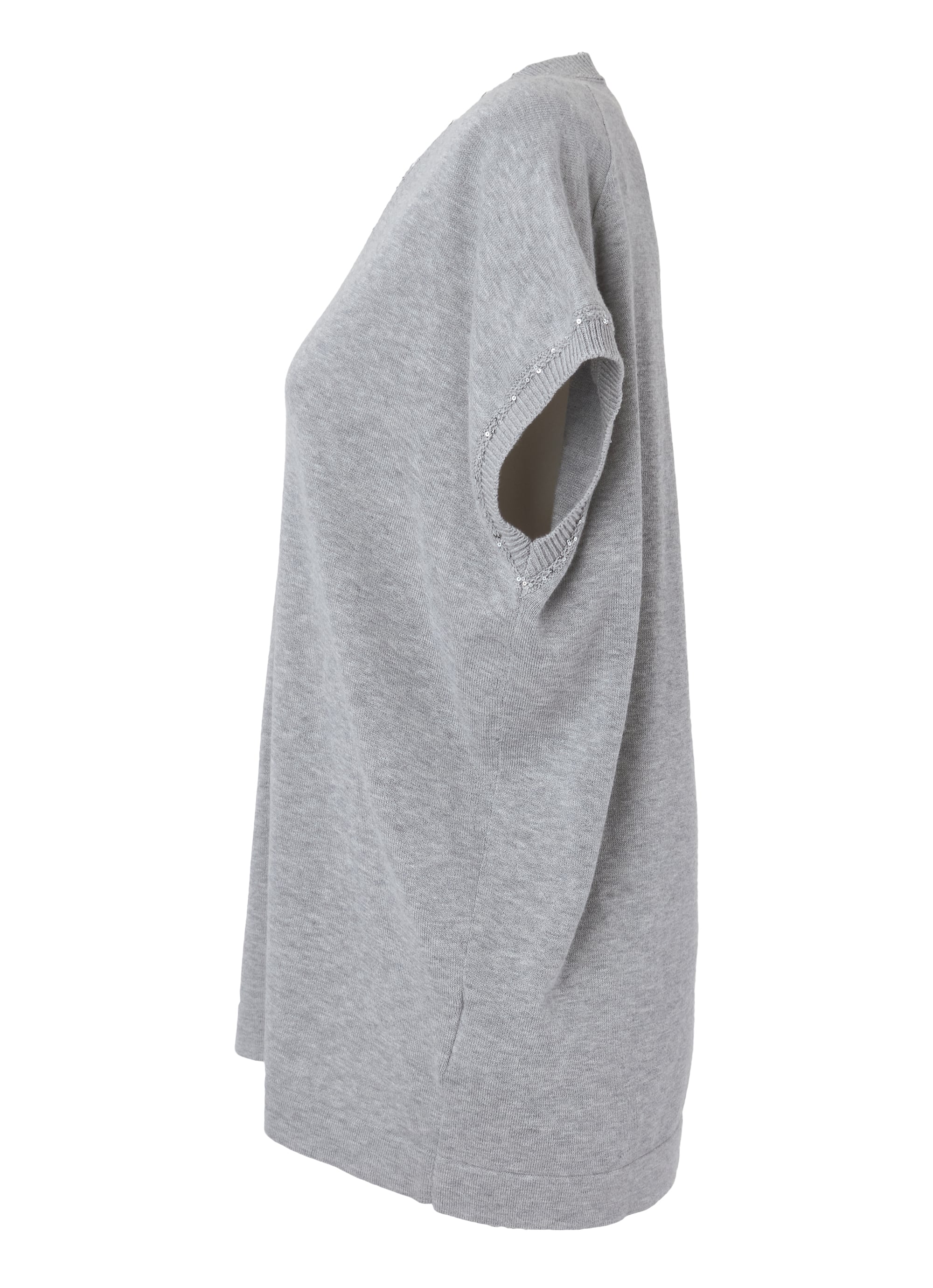デザインのポイントは、深めのVネックに沿うように丁寧に配されたスパンコール。光を受けてさりげなく輝き、顔まわりに上品な華やぎを添えます。装飾はあくまで控えめに、大人の女性にふさわしい洗練された印象に仕上げました。