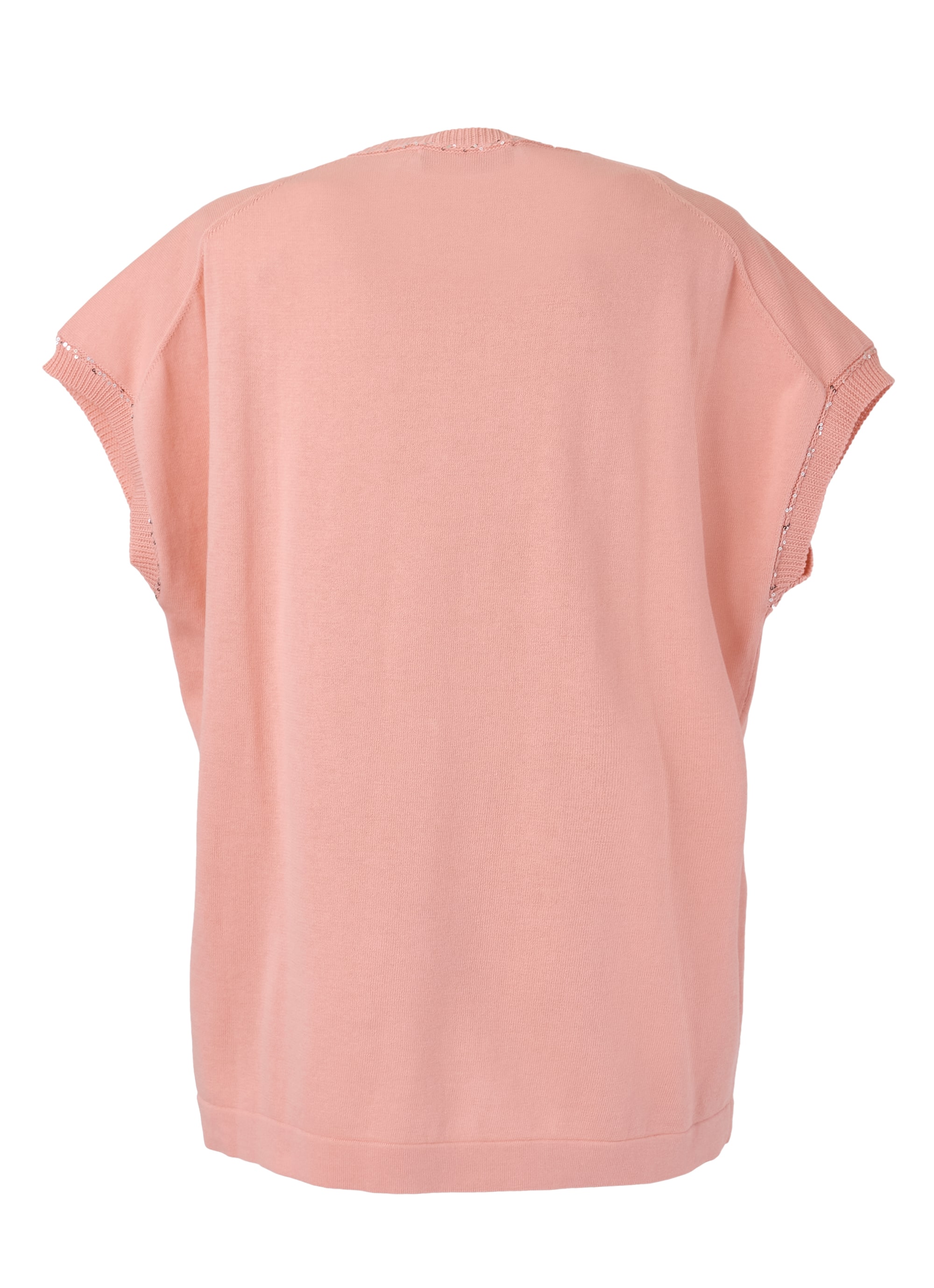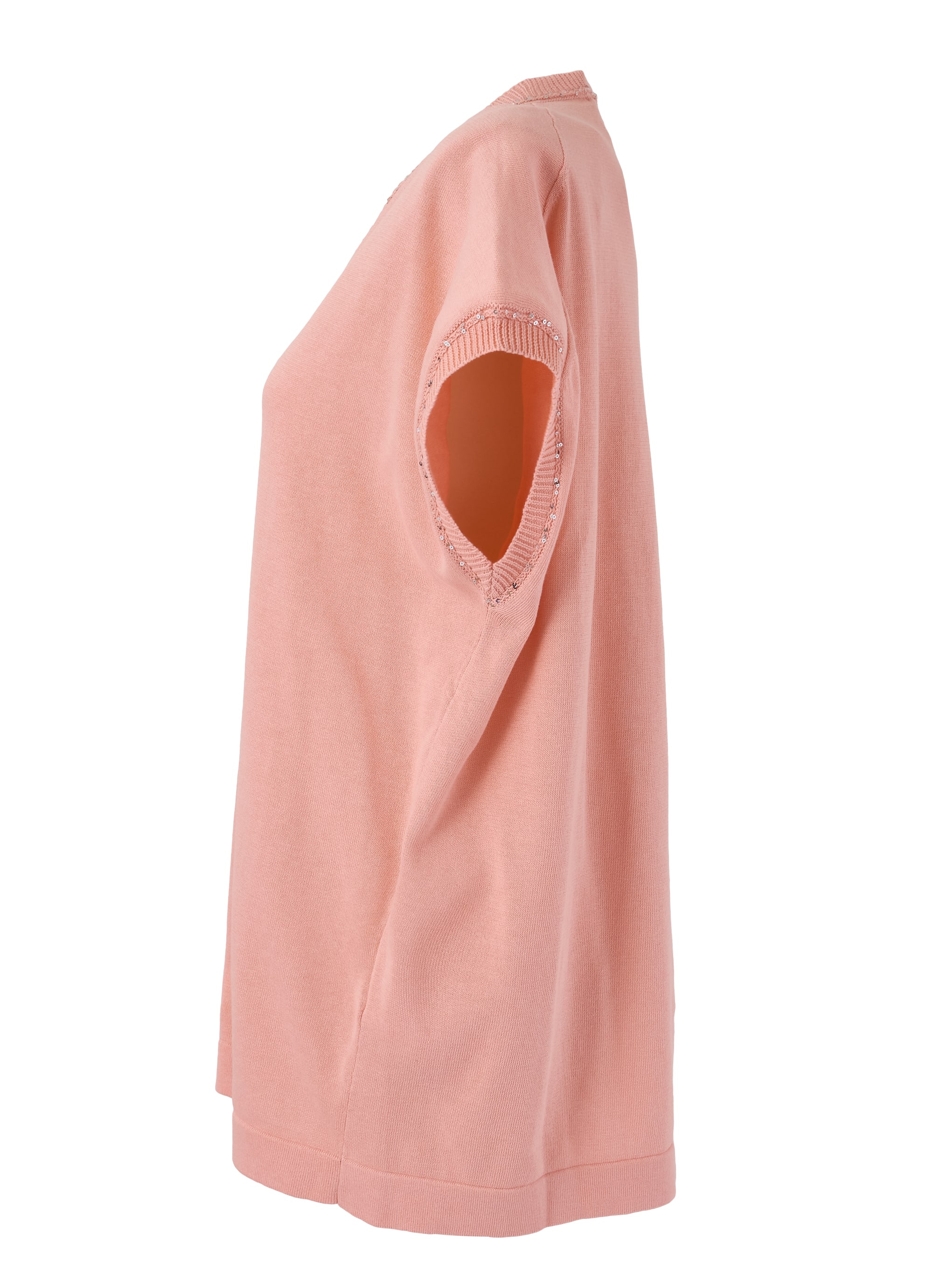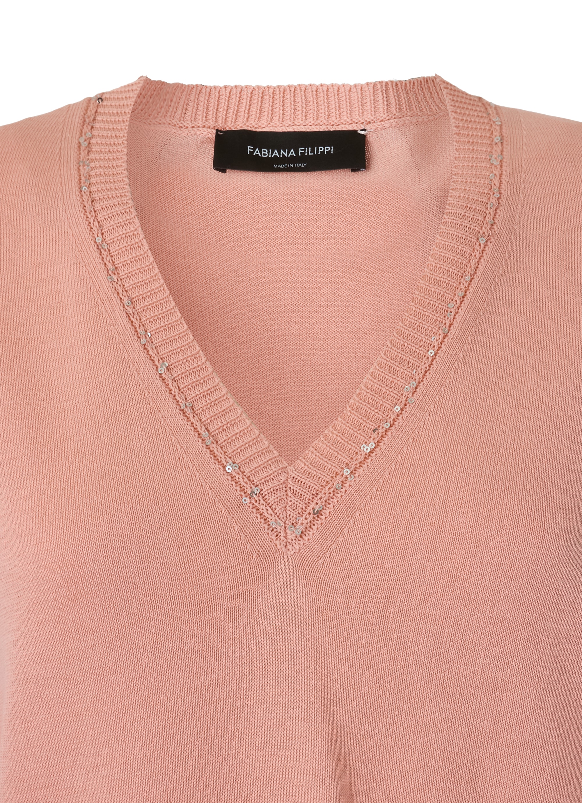 デザインのポイントは、深めのVネック。首元をすっきりと見せ、デコルテラインを美しく演出します。さらに、ネックまわりのリブ部分には繊細なスパンコールをあしらい、動くたびに控えめにきらめく上品なアクセントをプラス。