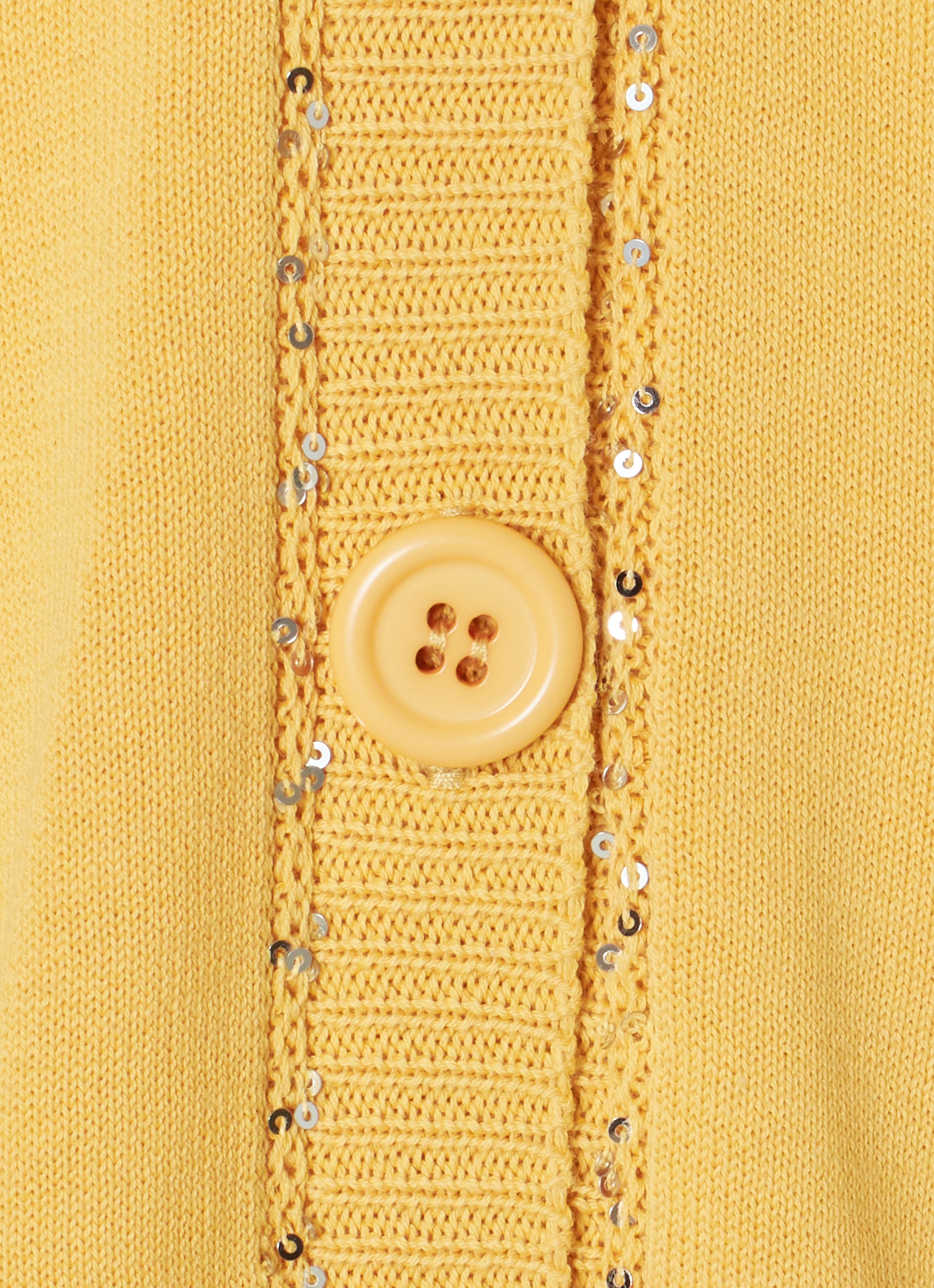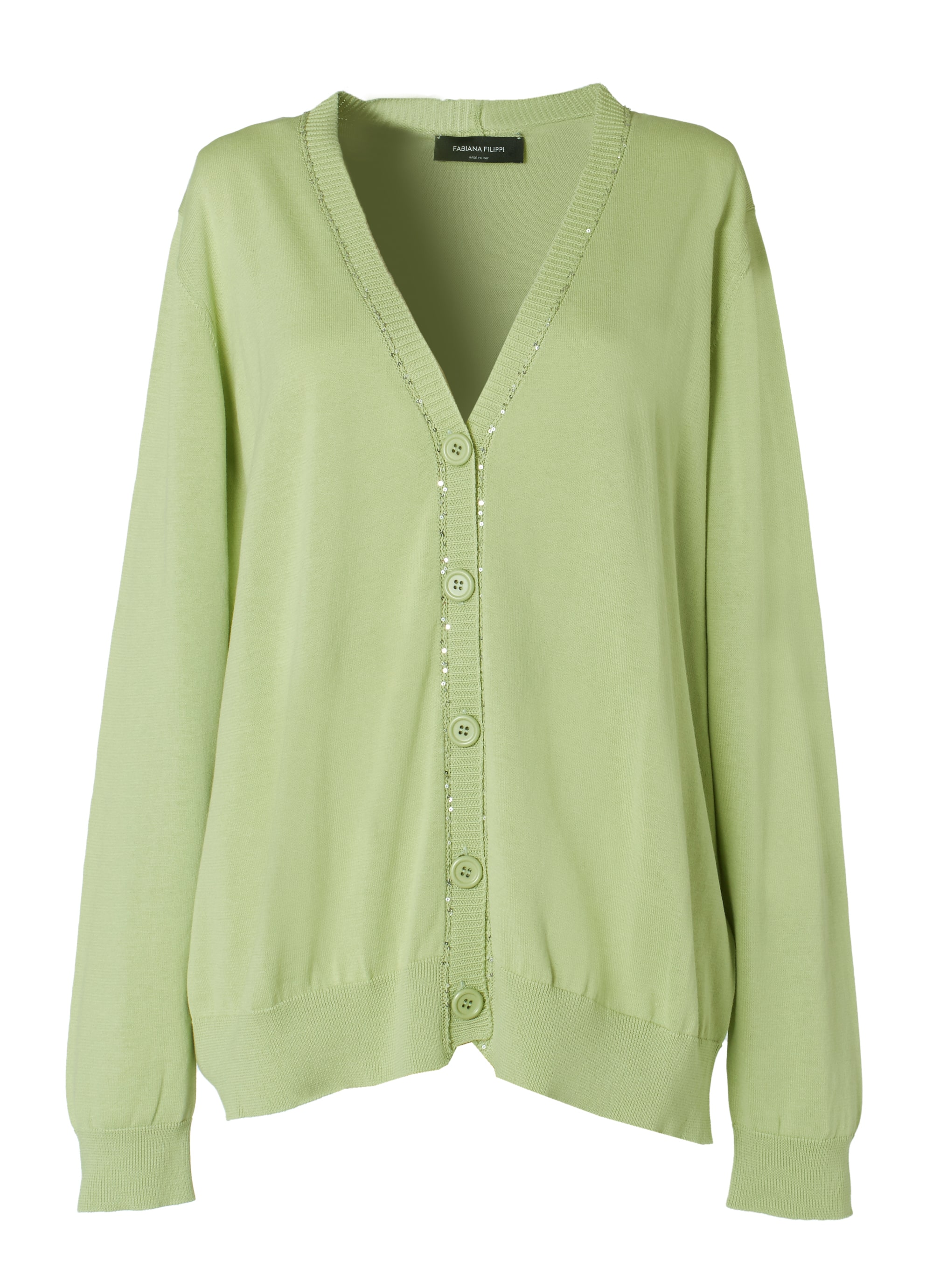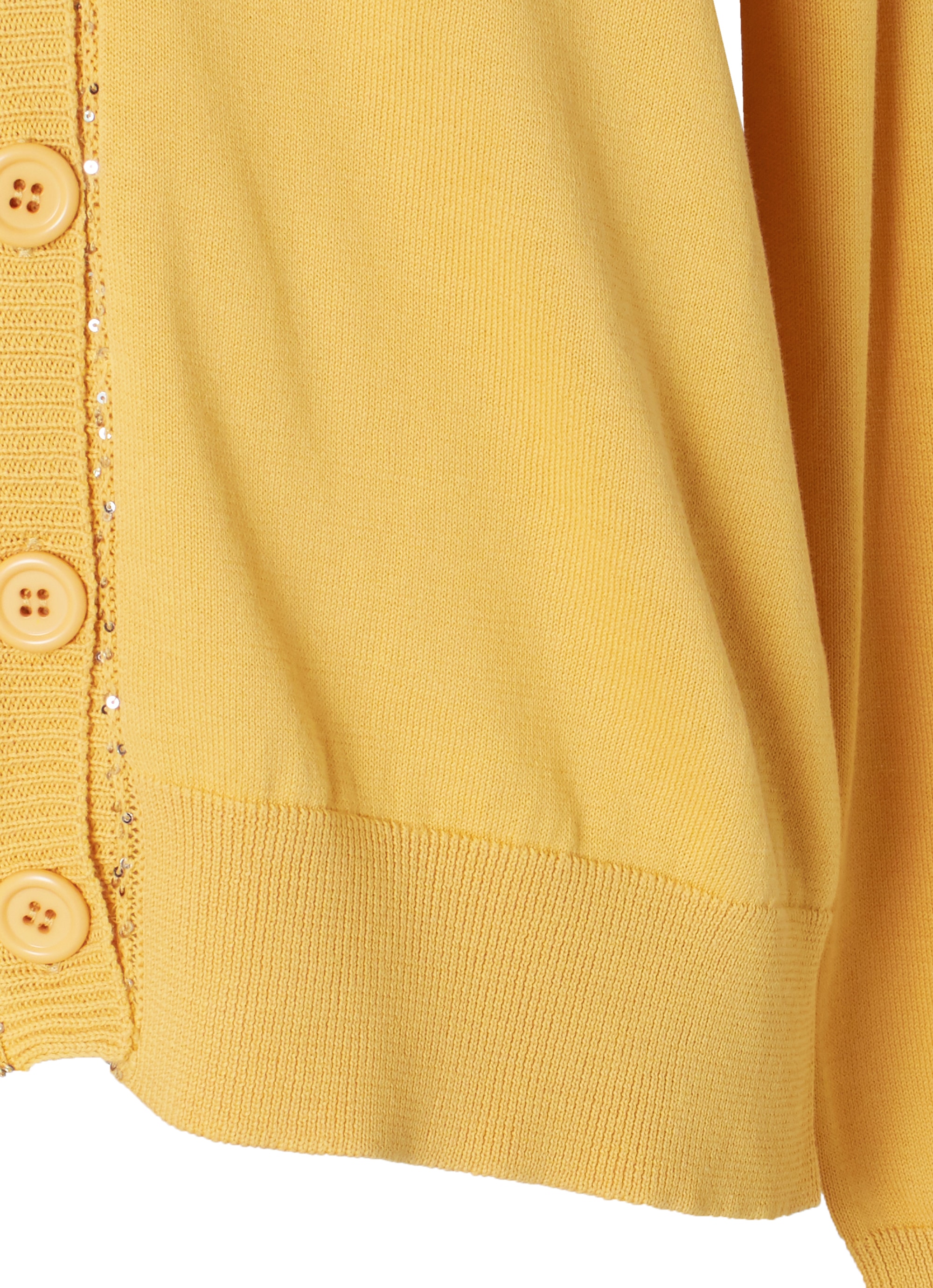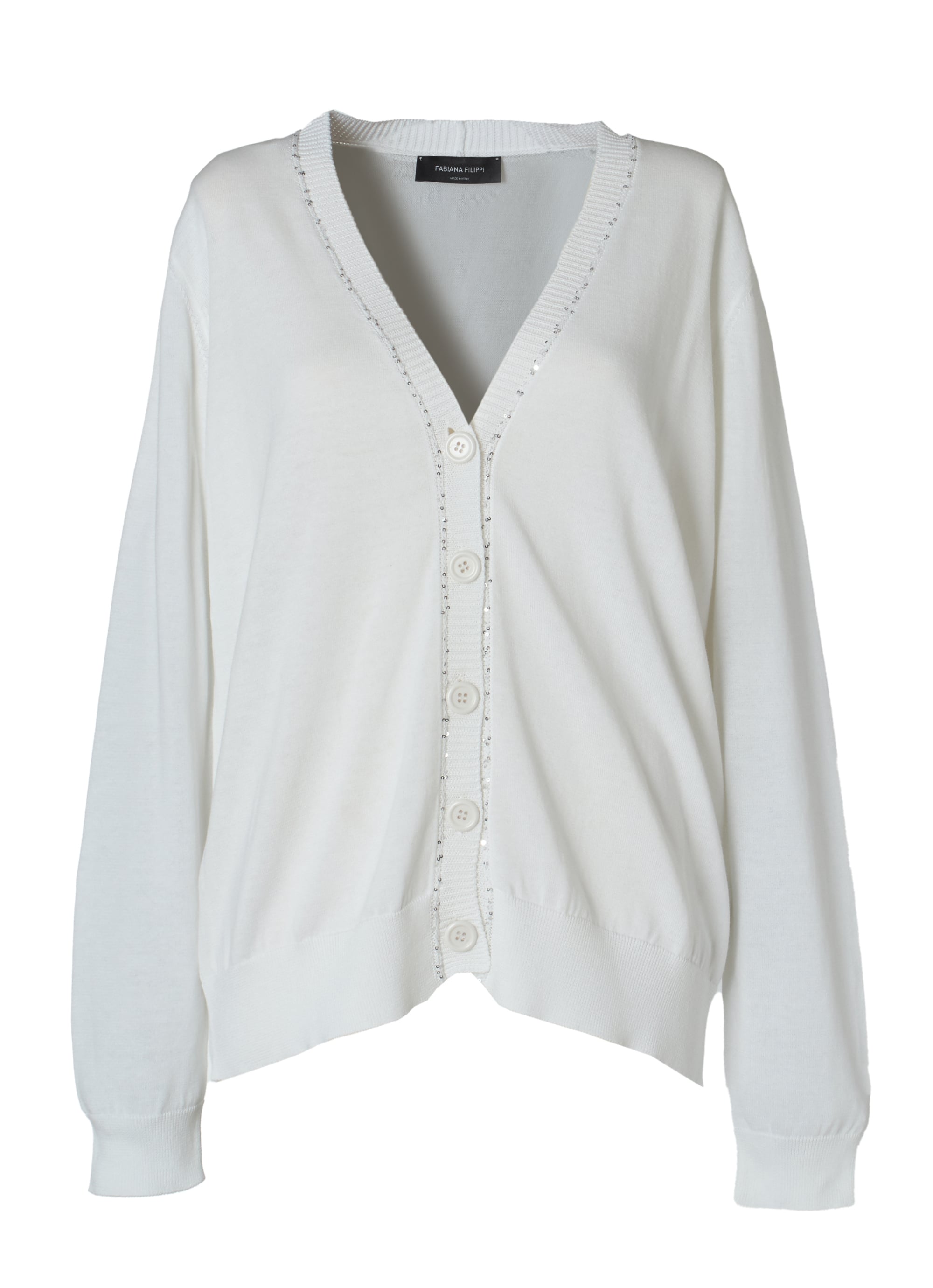 夏のライトアウターとしても活躍するコットン100%のカーディガンに、スパンコールでアクセントをつけたエレガントなアイテム。クセのないデザインは幅広いシーンで着用いただけます。