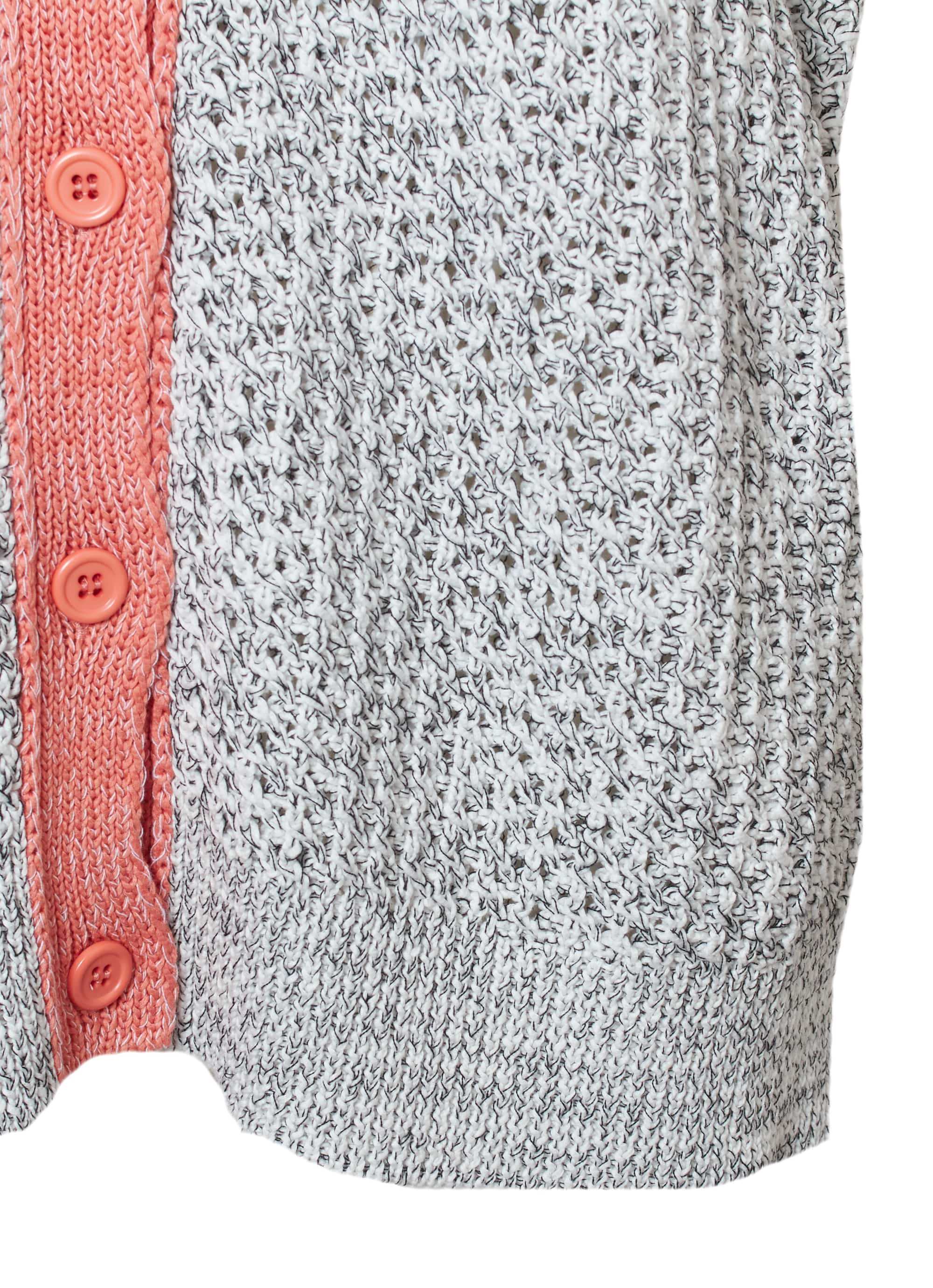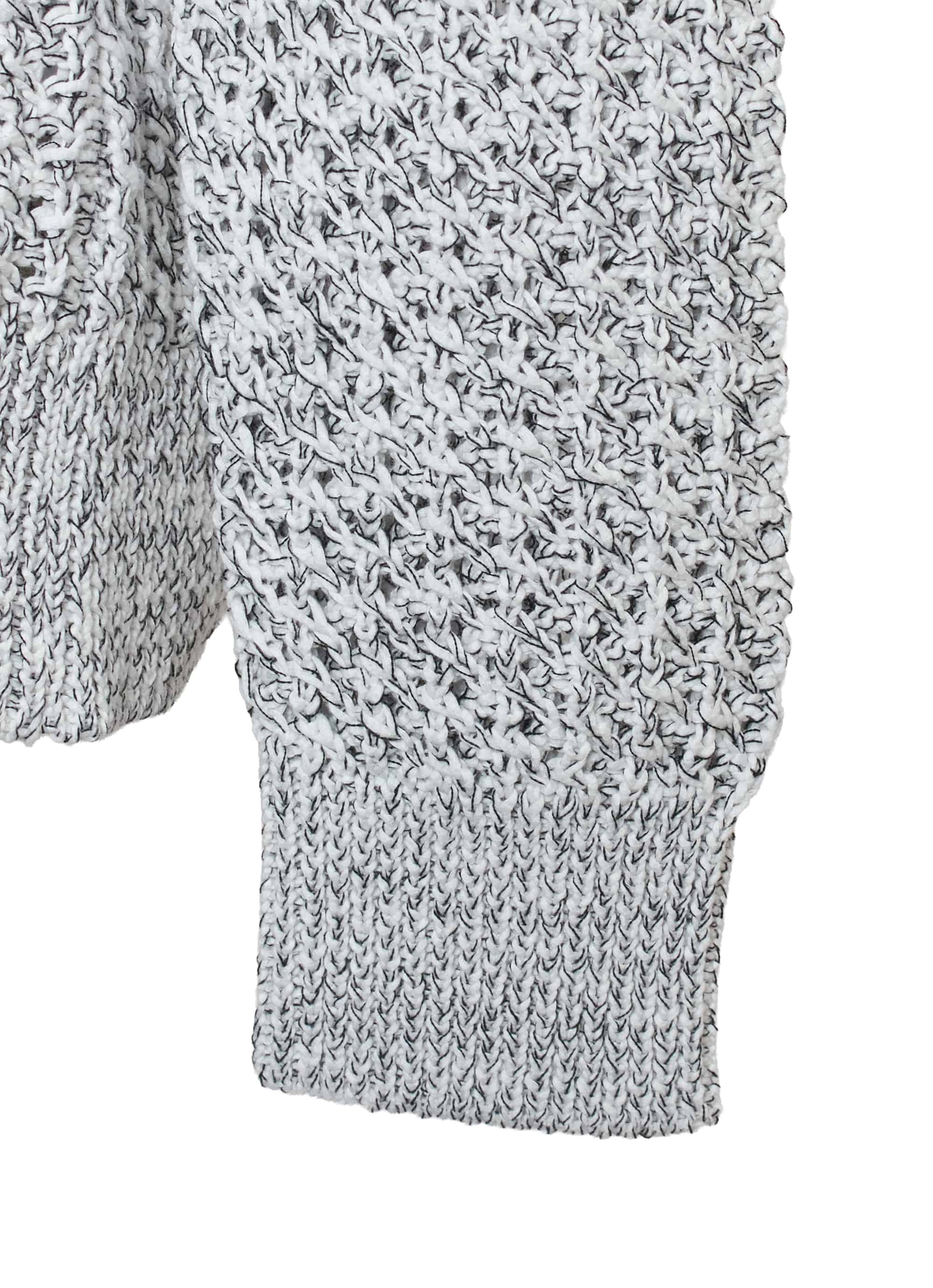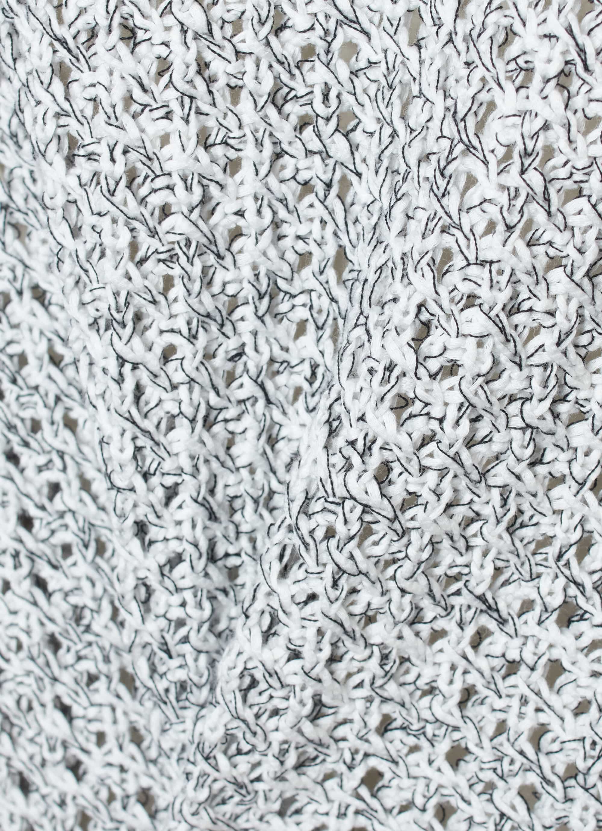 ホワイトとブラックの糸をより合わせて編み上げた表情のある素材感に、カラーのトリミングがアクセント。カジュアルなコーディネートの主役になれるアイテムです。
