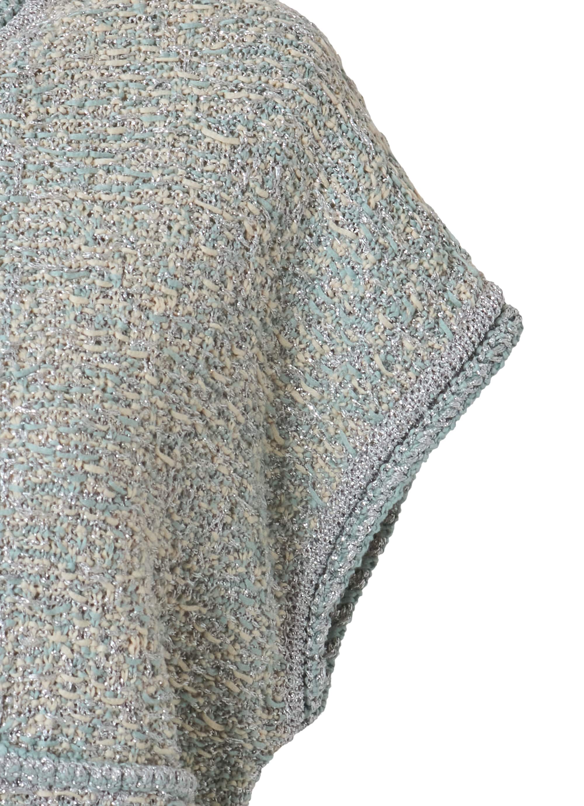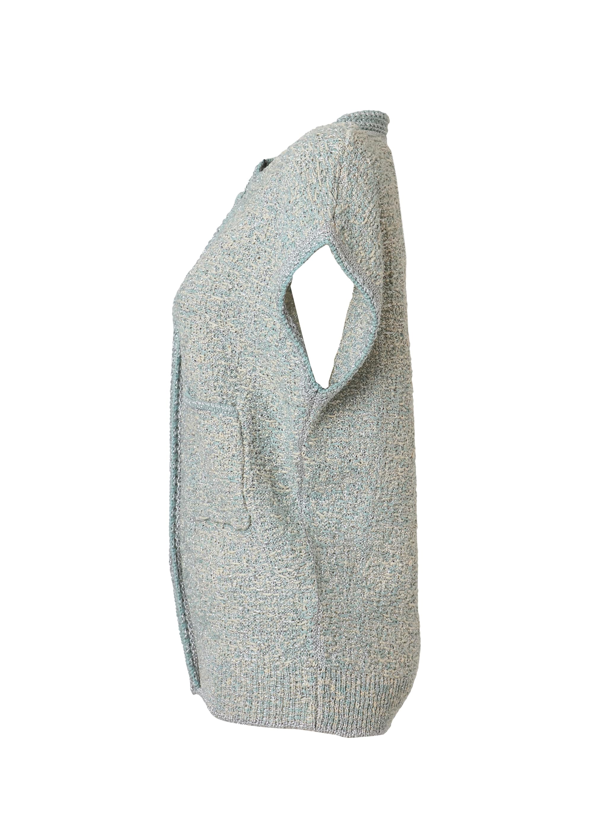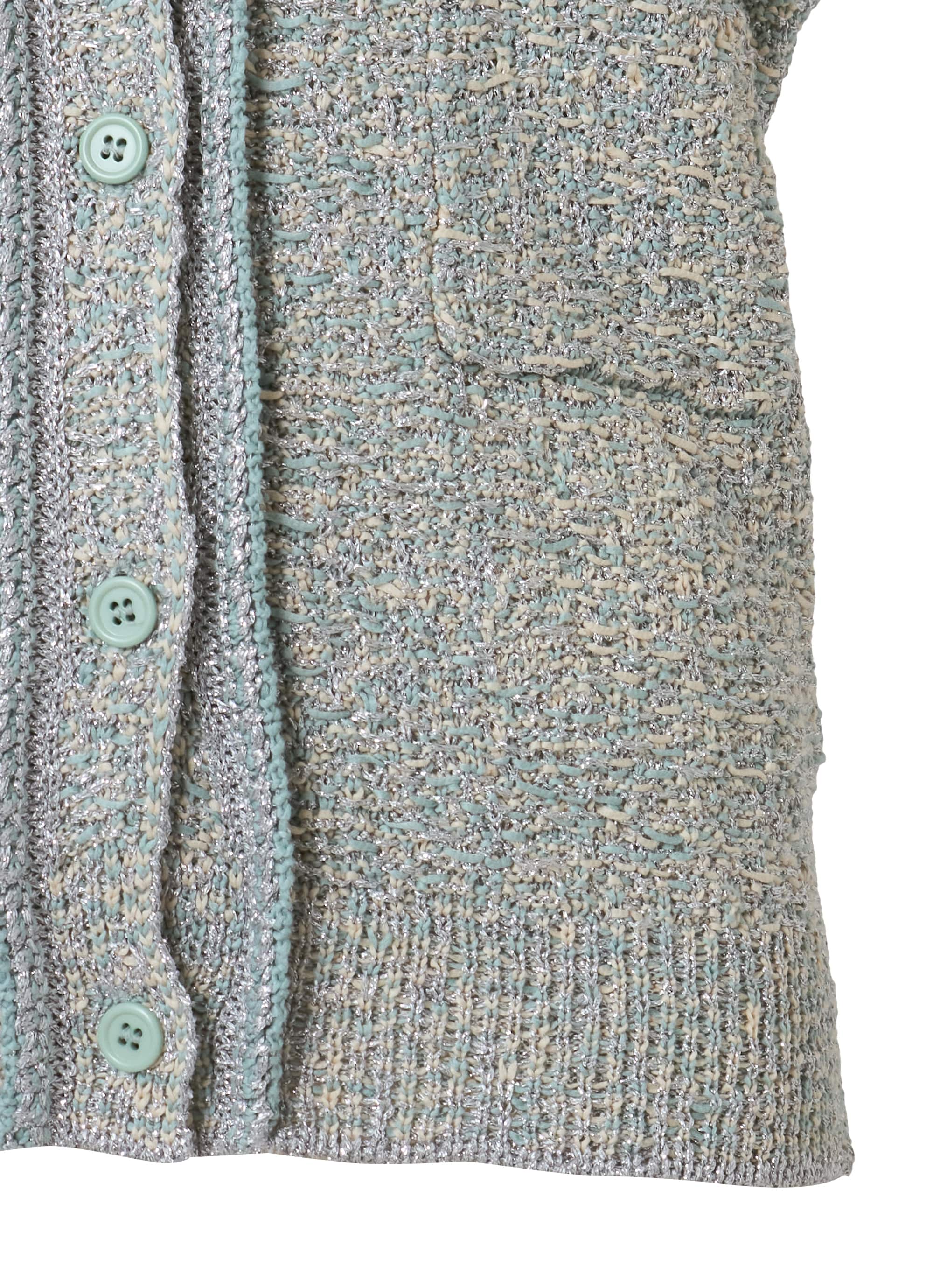 ラメ糸(ルレックス)を織り込んだツイード調の編地が印象的なニットベスト。