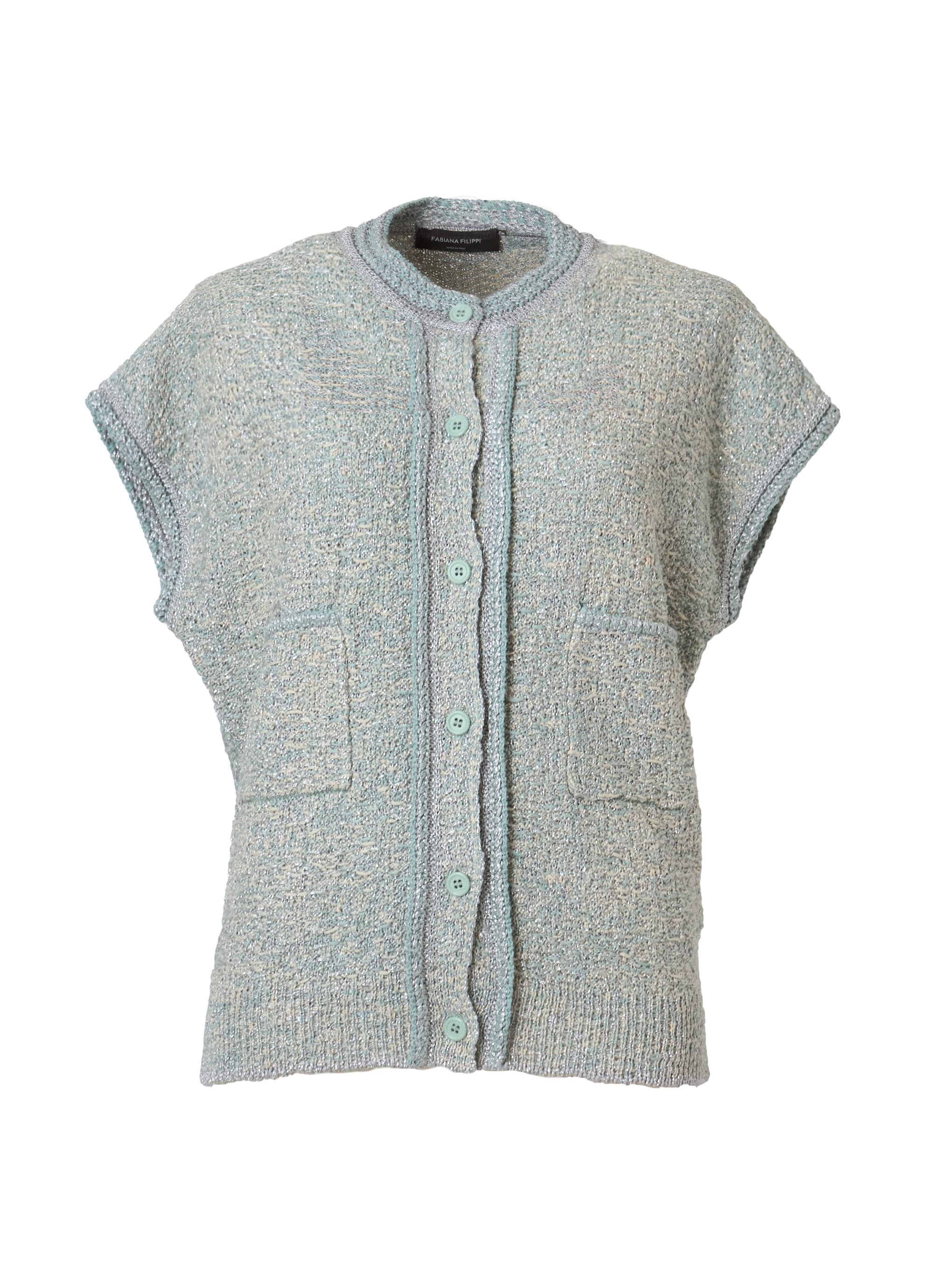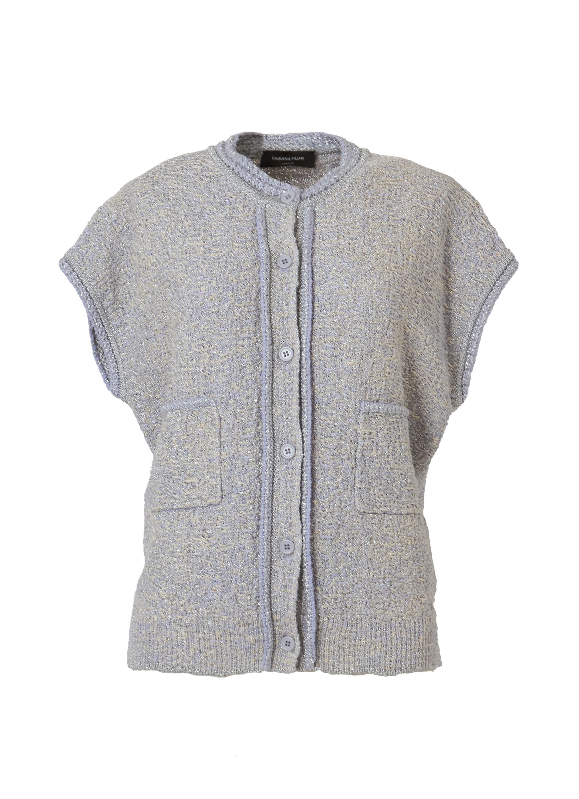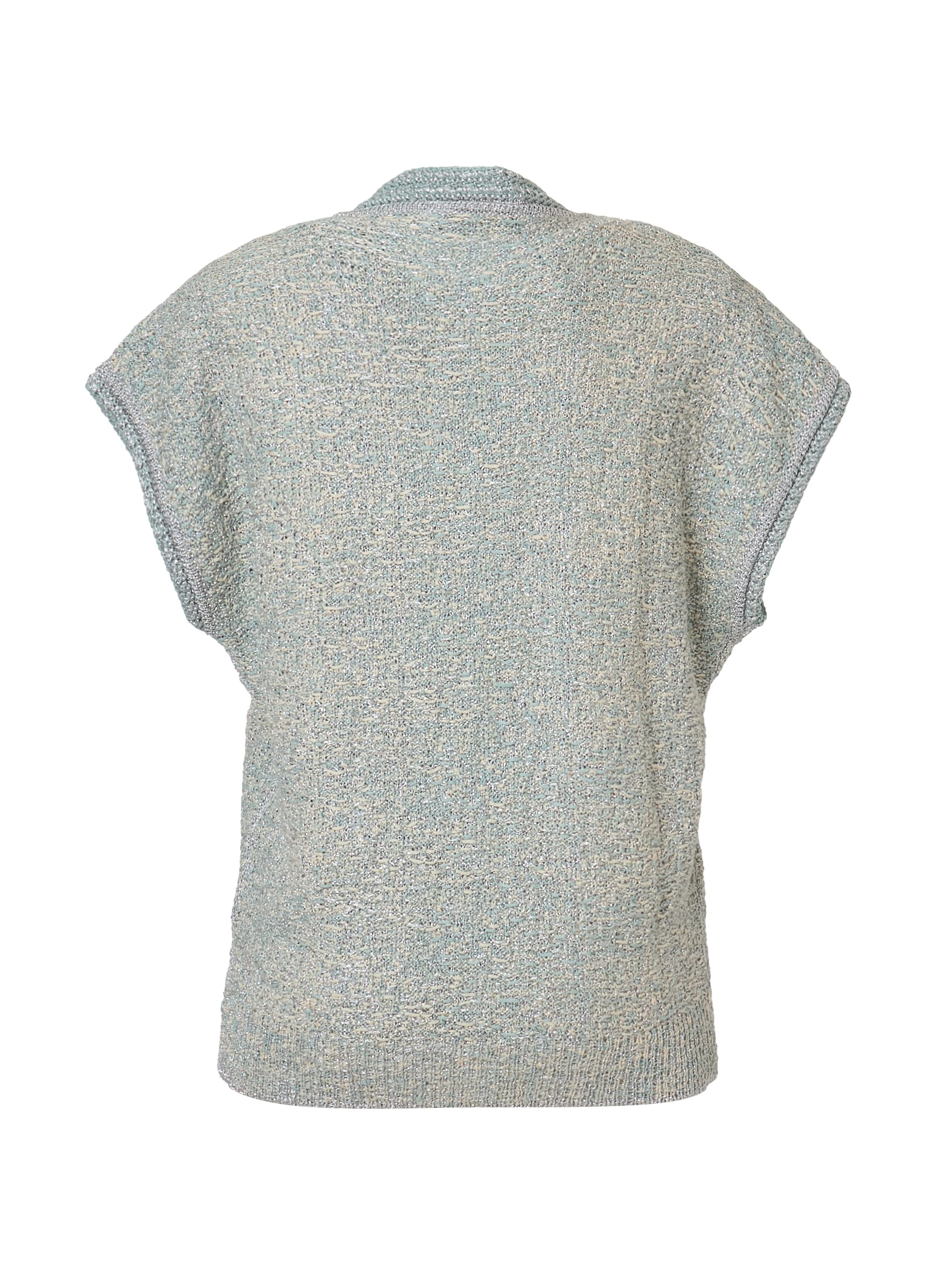 ラメ糸(ルレックス)を織り込んだツイード調の編地が印象的なニットベスト。