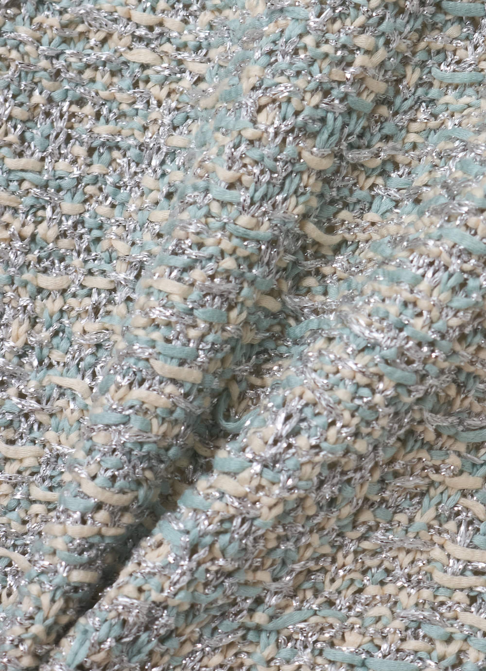 綿レーヨンをベースにした素材は、やわらかさと程よい落ち感を兼ね備え、軽やかな着心地。そこに金属繊維をブレンドし、繊細なラメの輝きをプラスしました。