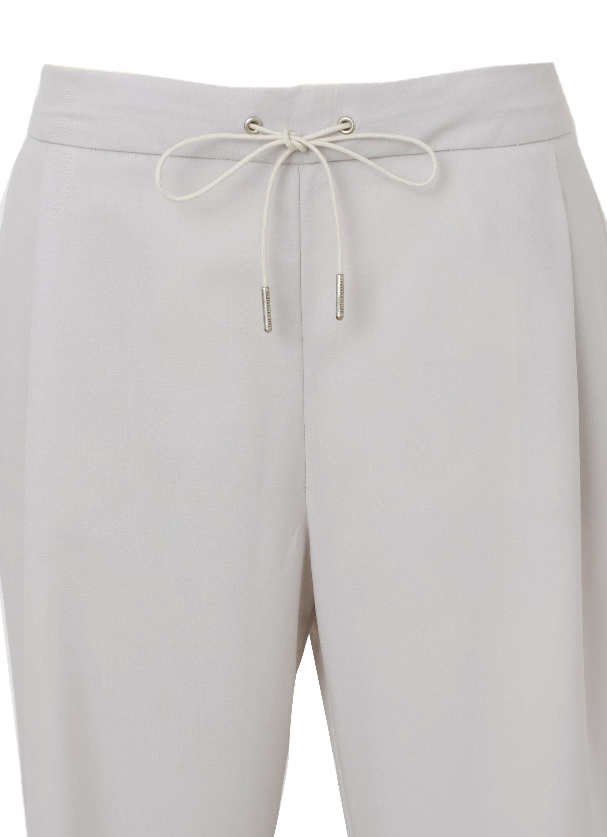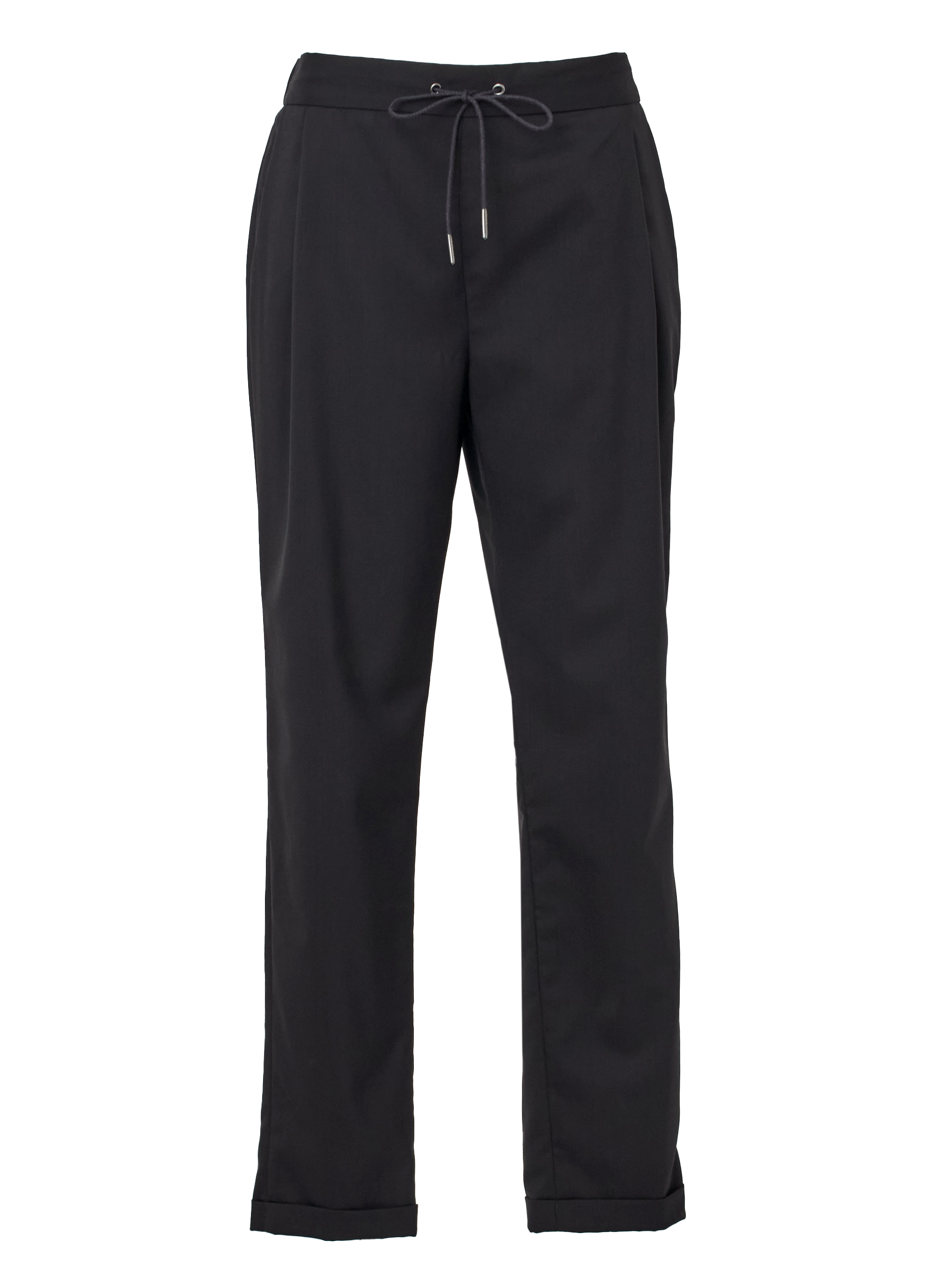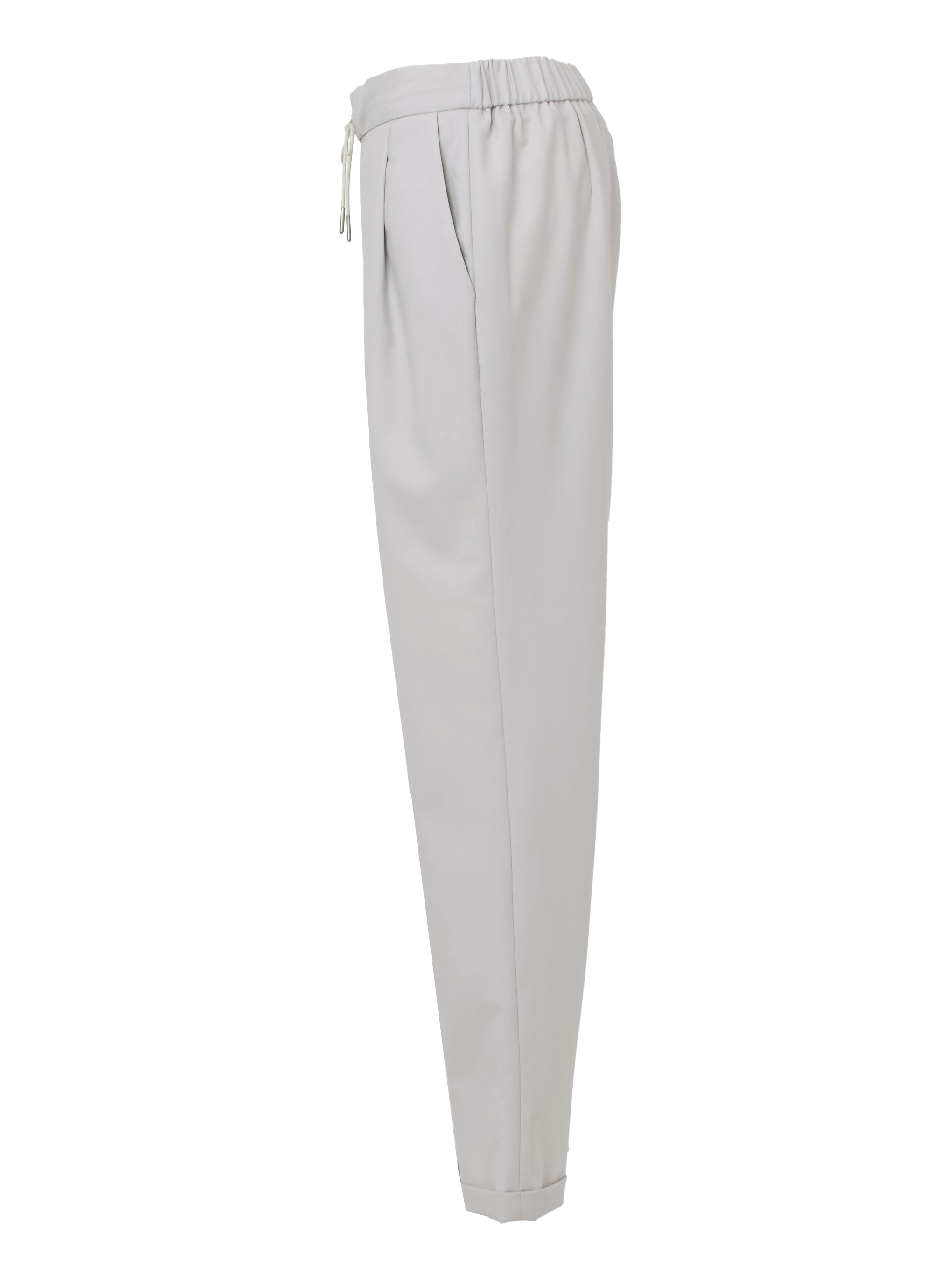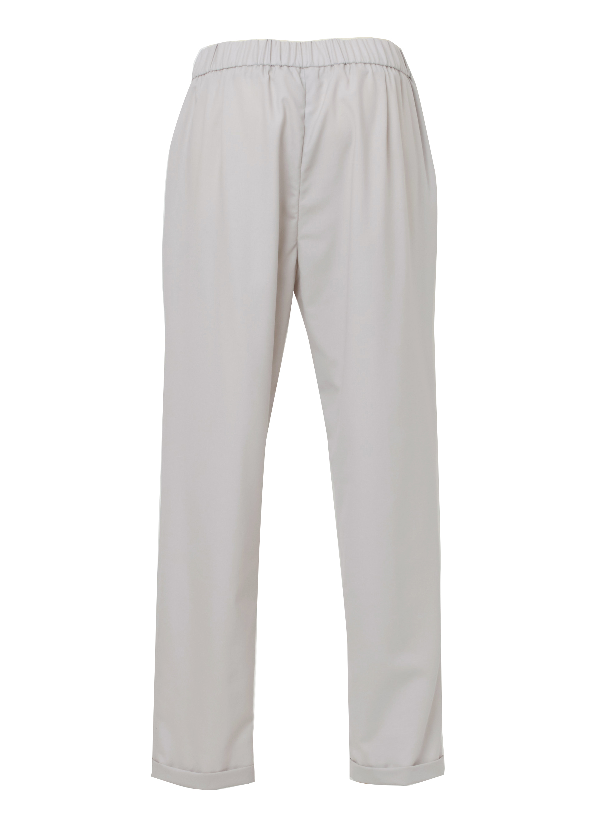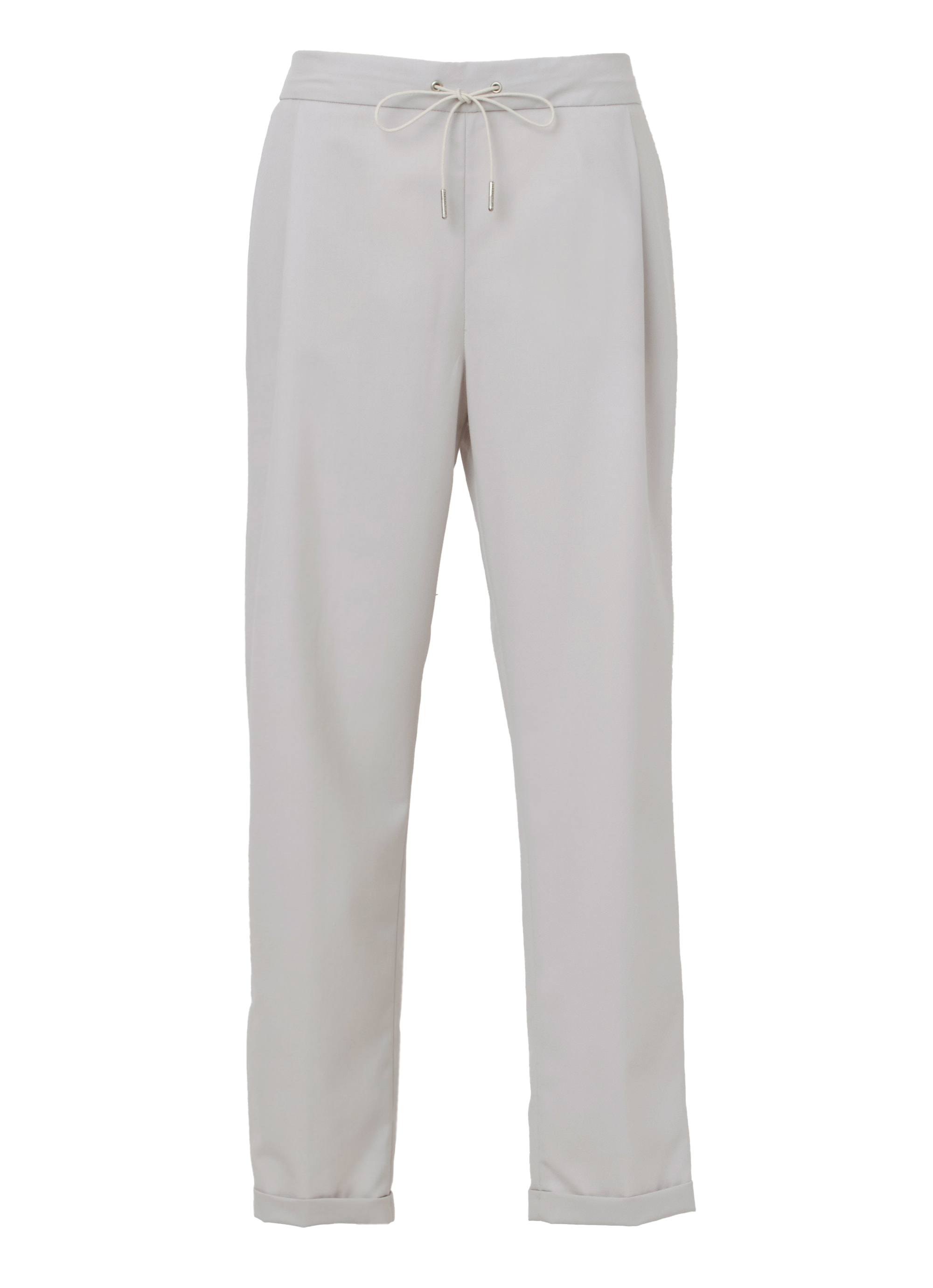 ウエストは後ろ部分のみゴム、さらにドローストリングで仕上げているので、リラックスした履き心地。両サイドのポケット口には、きらめくボールチェーンを配しているので、動くたびにきらりと光ります。