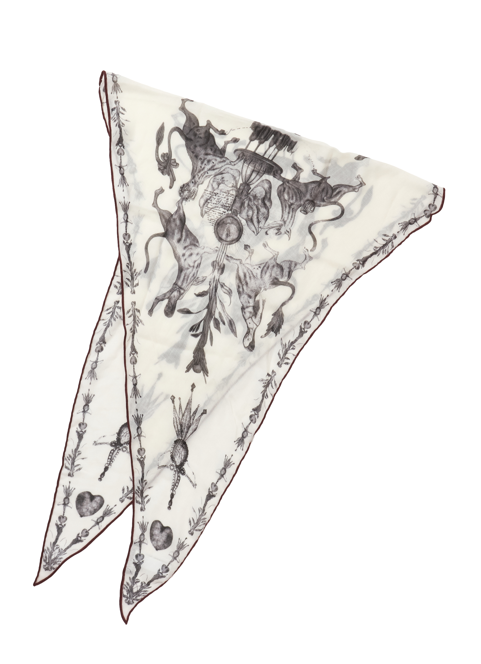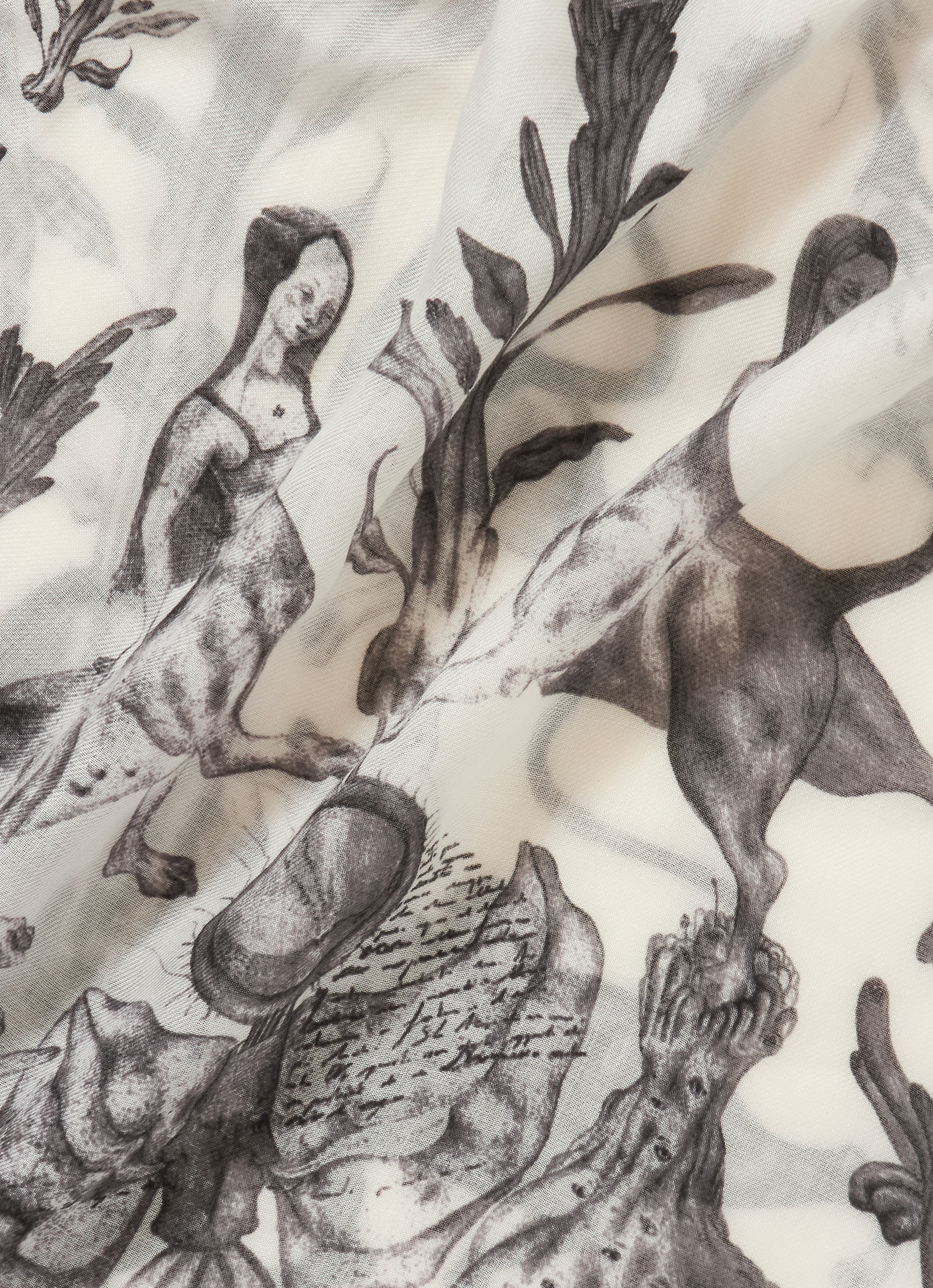 印象的なプリントは『FABULA VITAE』と名づけられた、現代アーティスト・ベニー・ボセットとのコラボレーション第三弾。紀元後6世紀に始まる中世の獣図鑑(動物を擬人化)やグロテスクの図像にインスパイアされて描いたドローイングシリーズ。ファビアナフィリッピのルーツであるウンブリア地方で伝統的に用いられていた中世の獣戯画がベースになっています。
