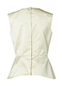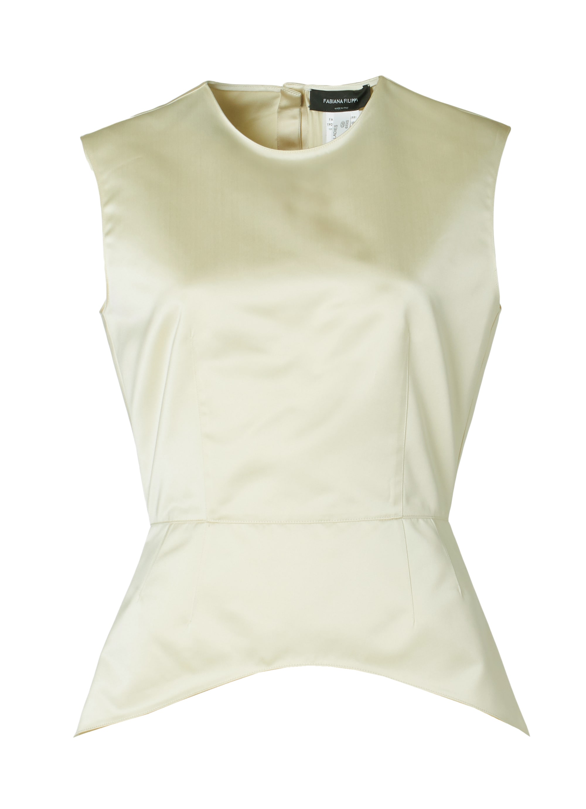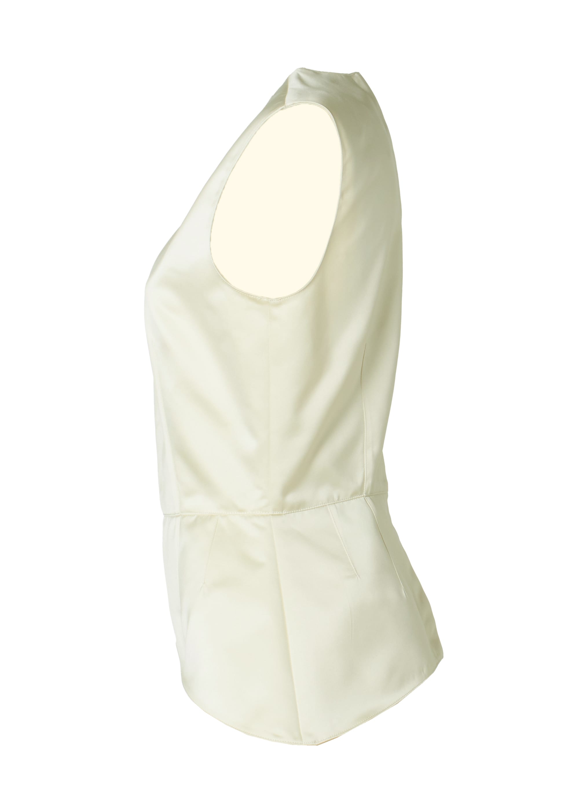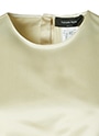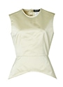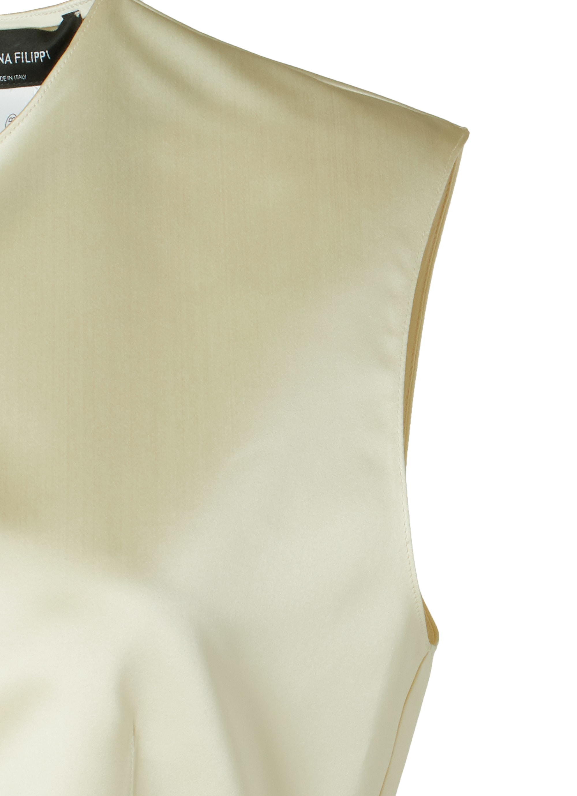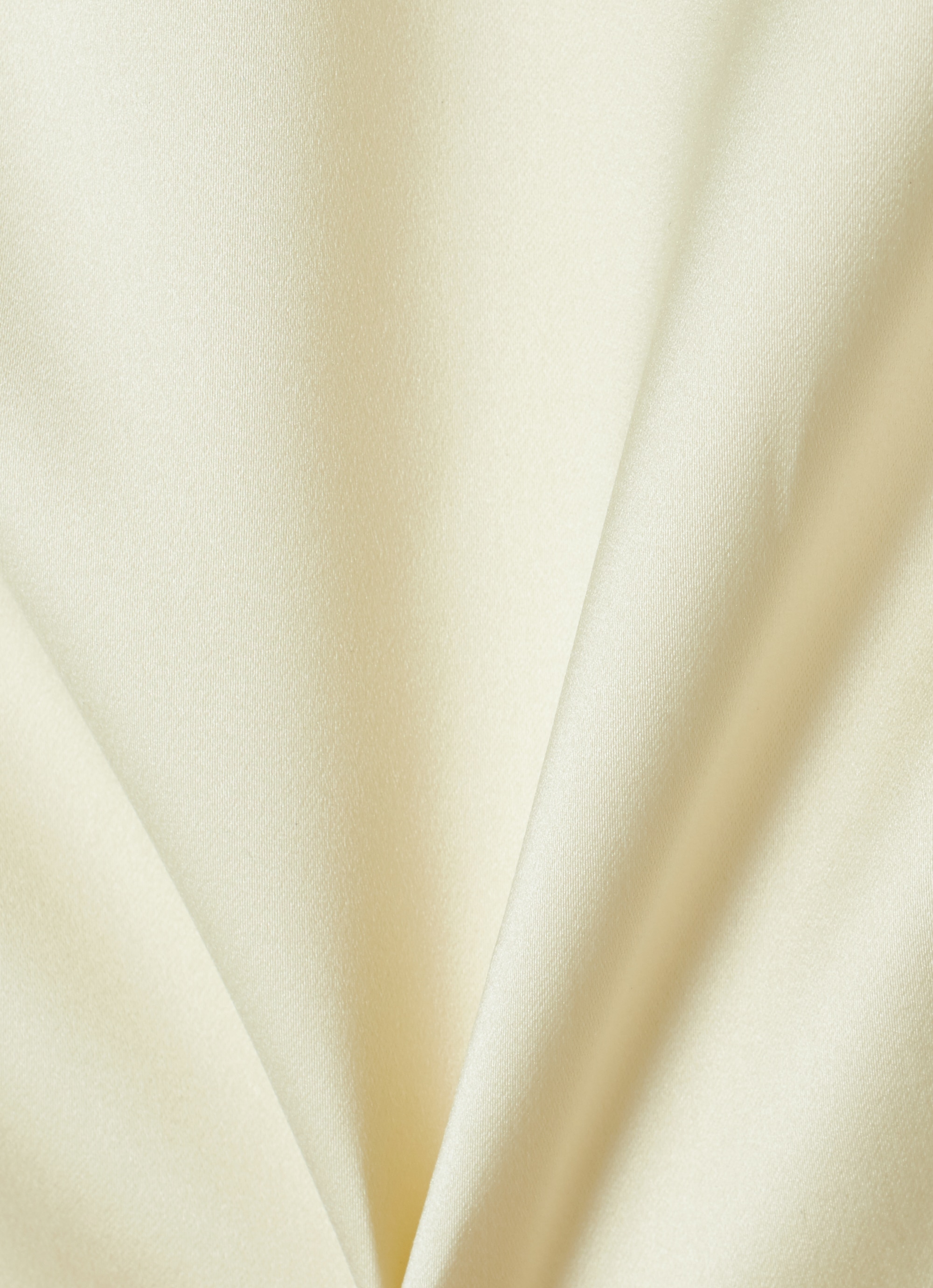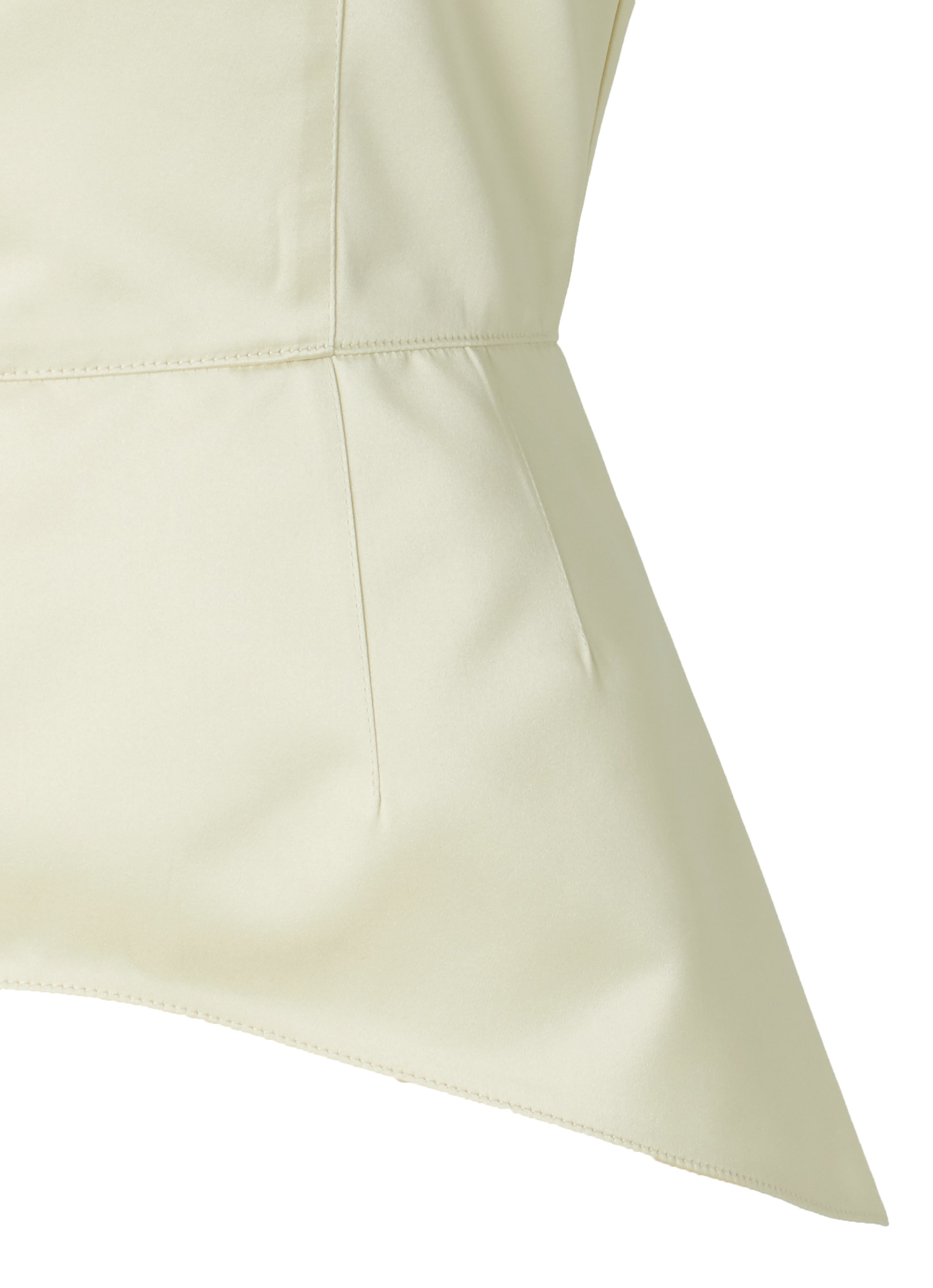 高級感のあるポリエステルサテンにイレギュラーなヘムラインがエレガント。シェイプされたウエストがフェミニンな印象を与えます。バックスナップボタン仕様。