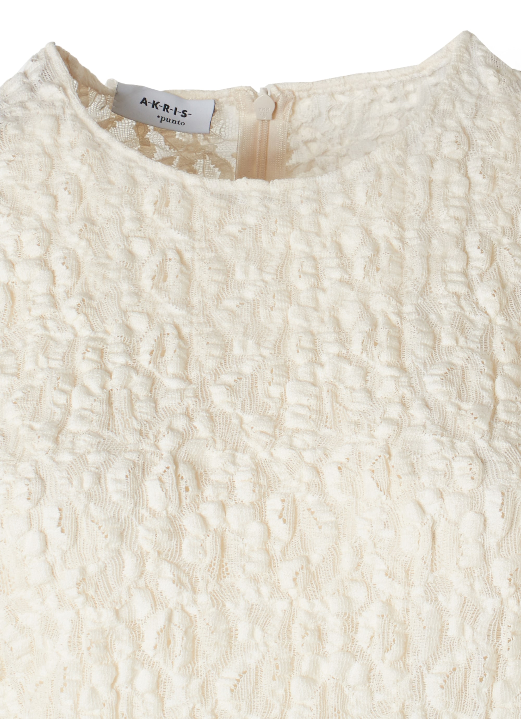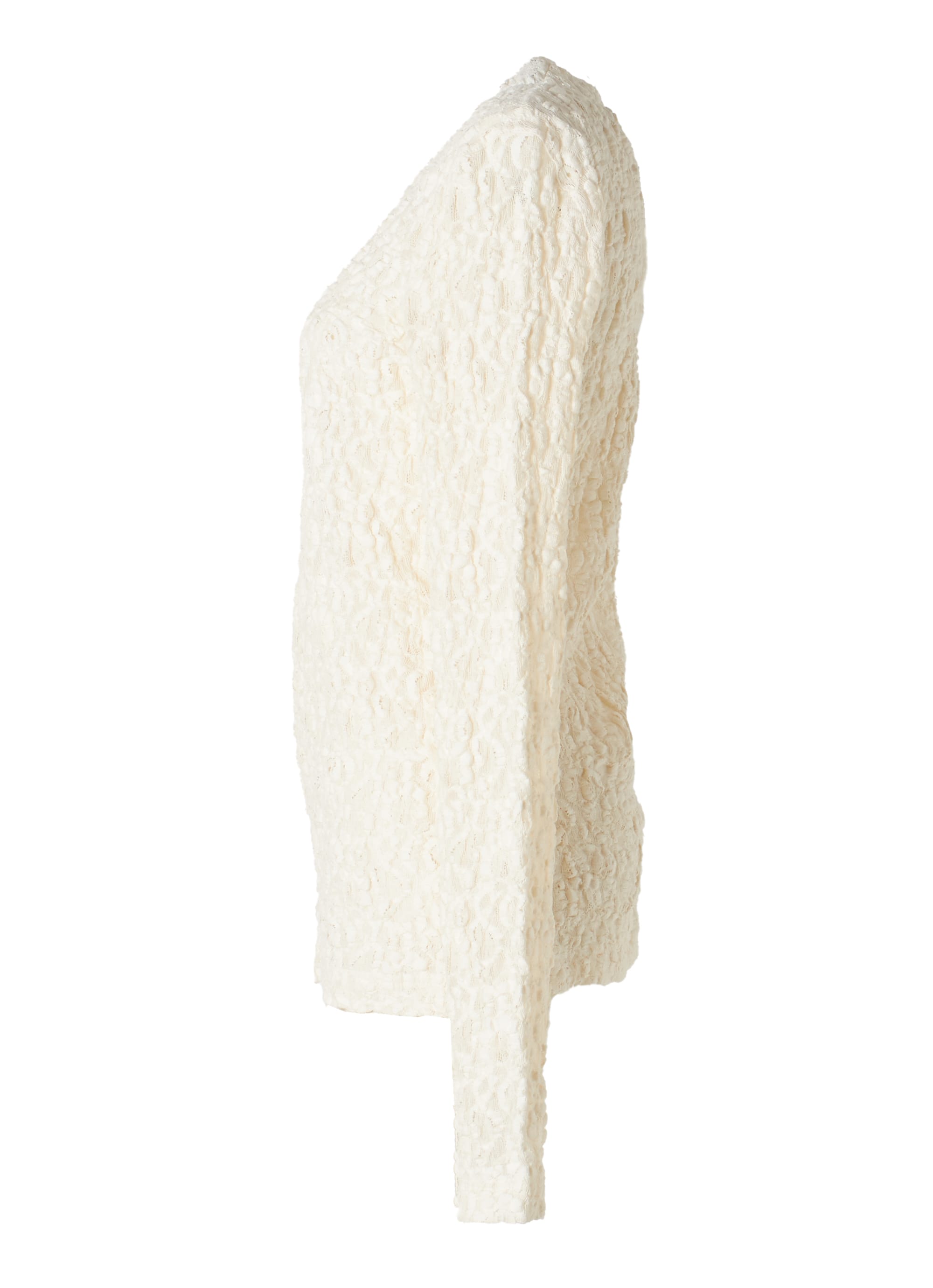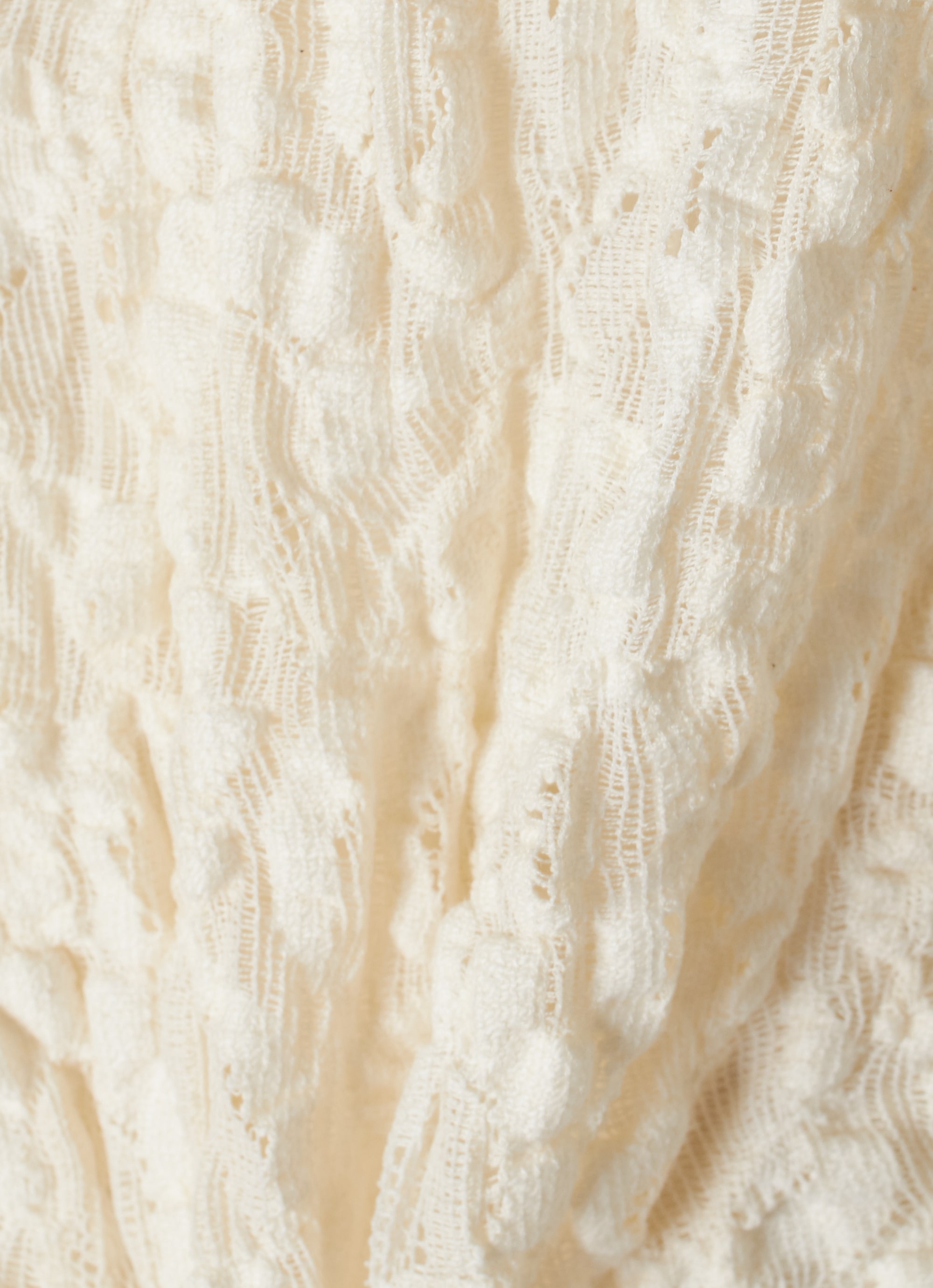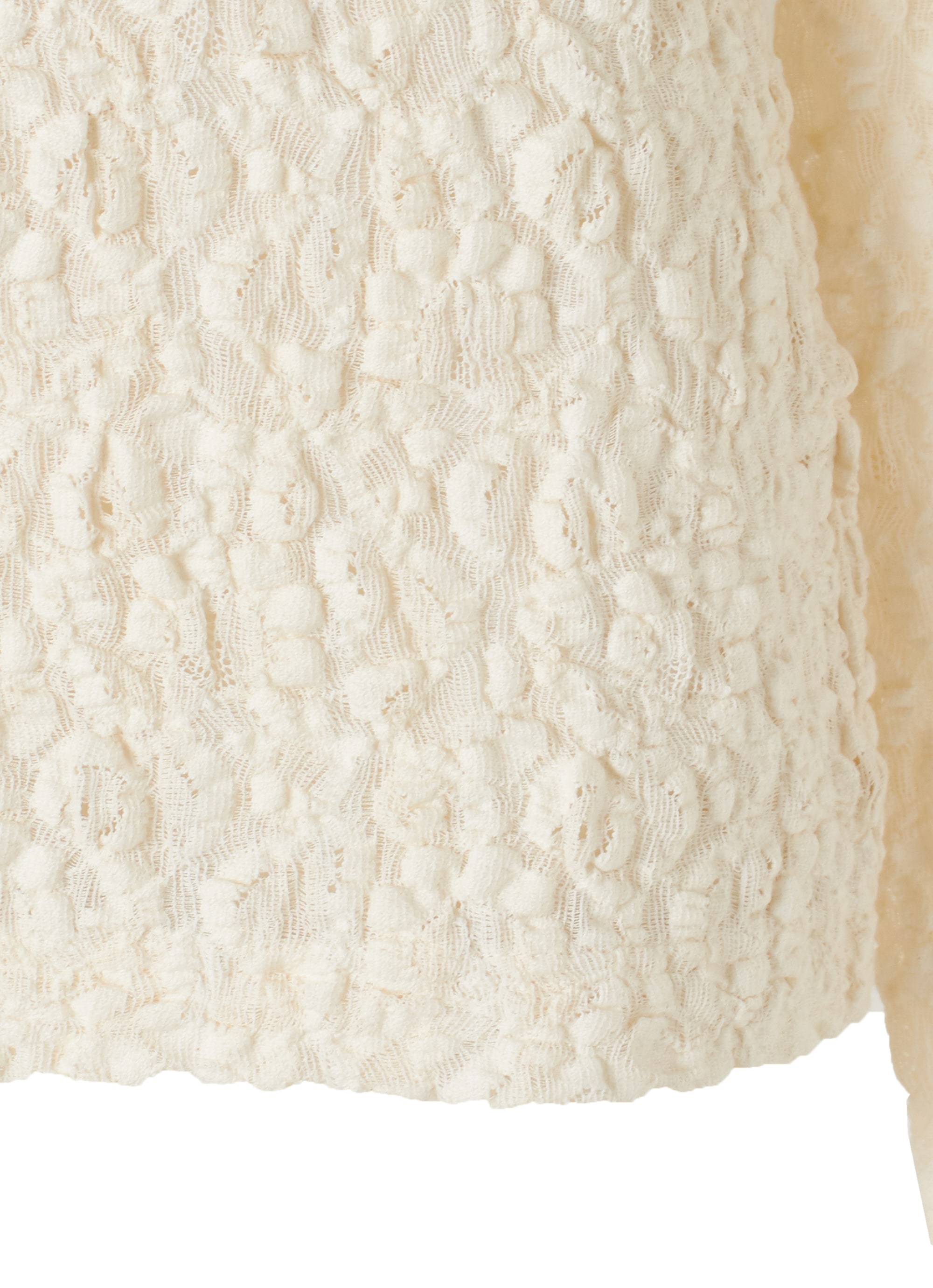 繊細なレース調の編み地が印象的な、フィット感のあるシアープルオーバー。